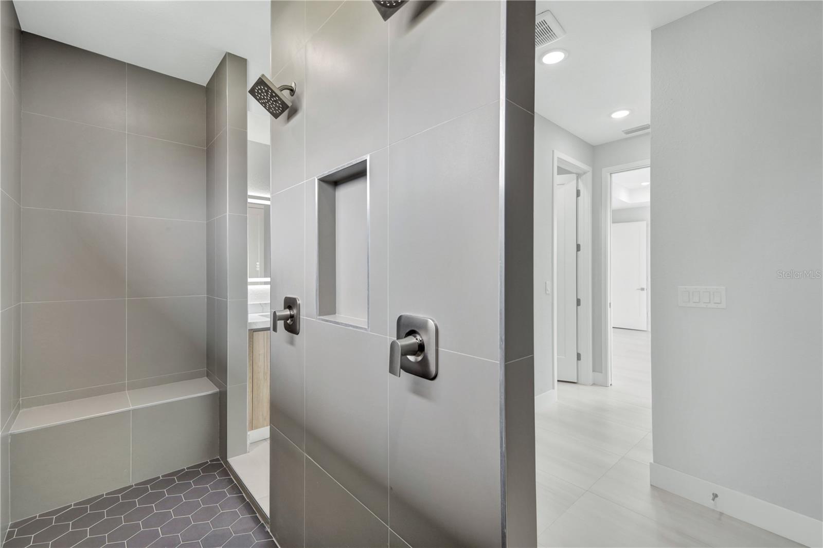 Built-in Features, Ceiling Fans(s), High Ceilings, Kitchen/Family Room Combo, L Dining, Primary Bedroom Main Floor, Stone Counters, Thermostat, Tray Ceiling(s)