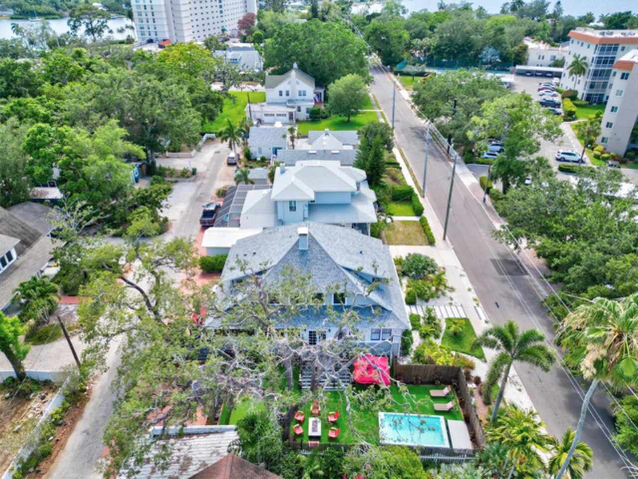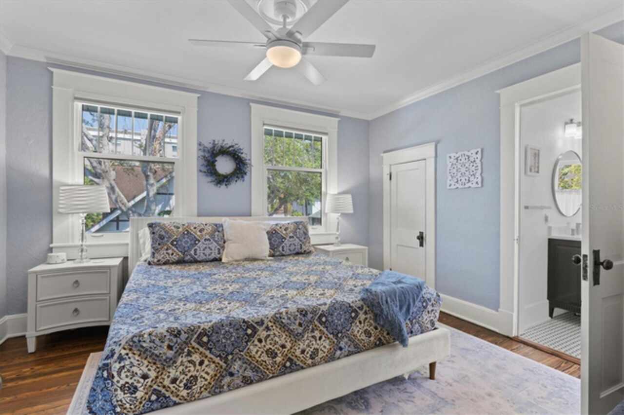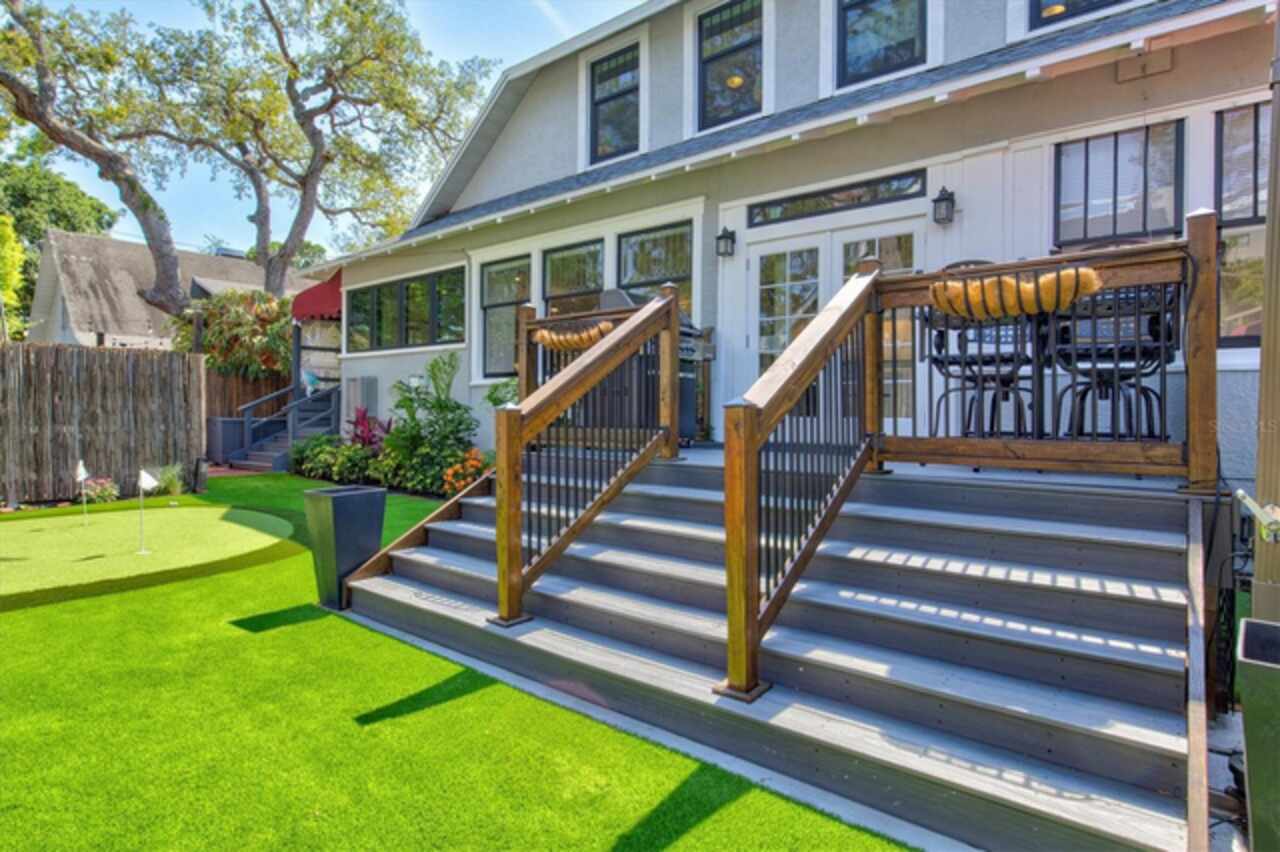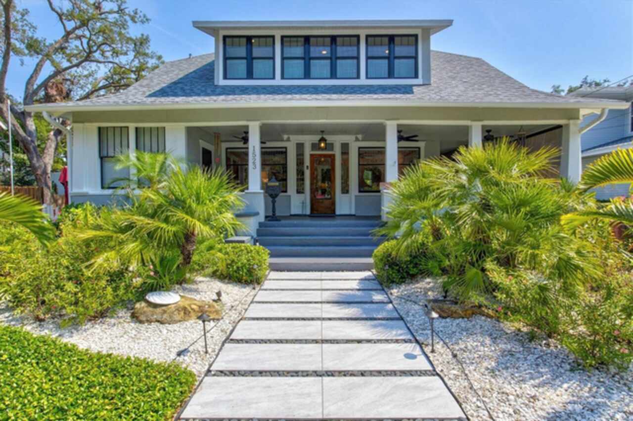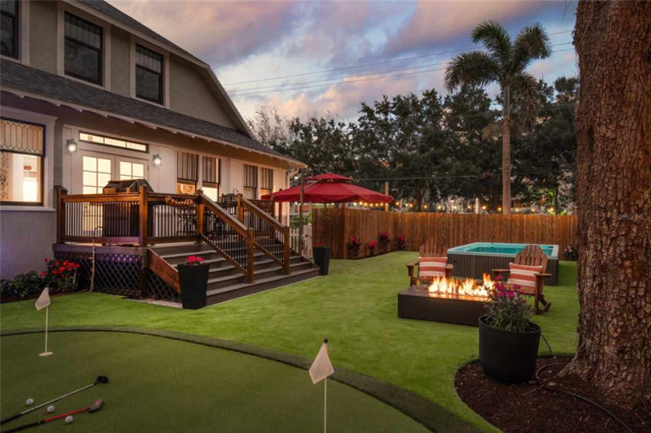 Immerse yourself in the rich history and timeless elegance of this meticulously renovated historic home located in the heart of Point Pleasant in downtown Bradenton. This distinguished two-story, 4-bedroom, 5-bathroom American Four Square home offers a harmonious blend of classic architectural charm and contemporary luxury. Originally built in 1913, the Betts House stands as a testament to Bradenton's storied past, with every detail meticulously preserved and enhanced for modern living. The newly landscaped front yard leads to the inviting, large wrap-around porch evoking a sense of nostalgia, reminiscent of days gone by. The grand living area has the original leaded windows with a fireplace and leads to both the family room and kitchen. The spacious family room has impact windows and a convenient full bath with the stairway leading to the four bedrooms and four additional baths. The remodeled kitchen and dining area is an open and inviting space overlooking the side yard. Crafted with care, the kitchen features impact windows, KraftMaid cabinetry, new LG appliances, a Bosch paneled dishwasher, exquisite butcher block counters, and complemented by an island topped with Dekton Entzo quartz. The large dining area still has the vintage leaded windows and leads to the impressive added butler's pantry that was formerly a side porch. It offers a wine refrigerator, two refrigerated drink drawers, a sink, and additional cabinetry also with Dekton Entzo quart. This area offers a seamless transition between indoor and outdoor entertaining. Once upstairs, you will find three bedrooms with three remodeled ensuite baths and a fourth bedroom serviced by an updated hall bath. The added primary bath has a spacious walk-in shower, dual vanities, and a private water closet. Step outside and discover a private oasis, complete with a composite side deck, rebuilt back porch, and a partially submerged 15'x8'x5' dual swim jet lighted Swim Spa. Practice your putting skills on the professionally installed 4-hole putting green, surrounded by lush artificial turf and expertly landscaped gardens. After a busy day, relax by the gas fire pit or rinse off in the outdoor shower before your resistance swim. Enjoy privacy with new bamboo fencing and landscape lighting, while the addition of string lighting illuminates the side yard for enchanting evenings under the stars. Thoughtful updates include a new roof in 2022, replacement of both HVAC units (downstairs unit 2025, upstairs unit 2023), 16 new impact windows, and a complete refinished and staining of wood floors, stairway, and handrails. In addition, the interior has been freshly painted and has new light fixtures and new window treatments throughout. Perfectly situated a very short distance from historic Old Main Street with its charming shops, bars, and restaurants as well as the marina, Manatee River, and the Riverwalk. The Betts House offers unparalleled access to the best of Bradenton’s waterfront living. Experience the perfect harmony of history and modern comforts by discovering the timeless allure of this exceptional residence.