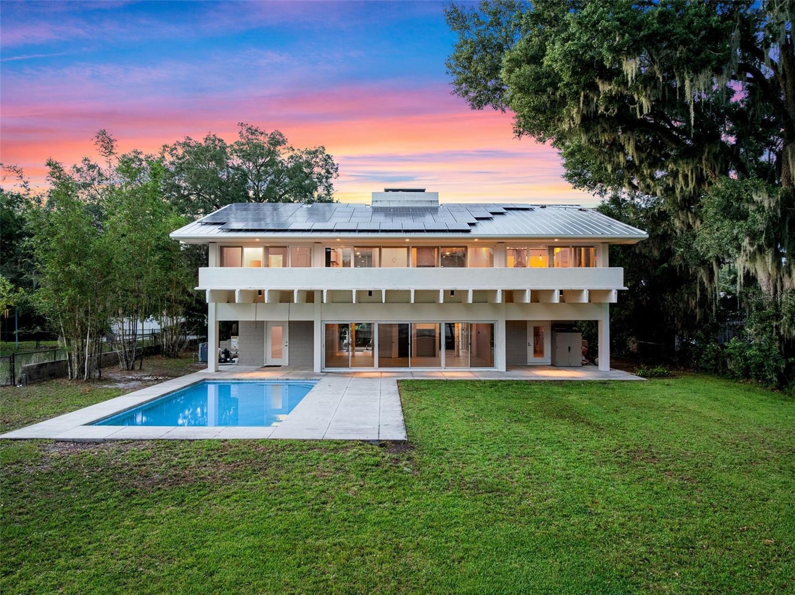 A rare fusion of architectural pedigree and true Chain of Lakes living, The Guest House is an iconic Mid-Century Modern residence designed and built by world-renowned architect Gene Leedy. Set quietly at the end of a cul-de-sac with no HOA, this lakefront property on picturesque Lake Mirror offers direct access to the Winter Haven Chain of Lakes—one of Florida’s most unique interconnected lake systems. A public boat ramp just steps away allows effortless launching for days spent skiing, cruising, or enjoying lakefront dining across 20+ connected lakes. A founding figure of the Sarasota School of Architecture, Gene Leedy is celebrated for his bold use of precast concrete, Ocala block, deep overhangs, passive cooling, and walls of glass—timeless hallmarks showcased throughout this residence. The Guest House stands as a sculptural, livable work of art, highlighted by Leedy’s iconic precast concrete double-“T” roof system, minimalist geometry, and expansive glazing that blurs the line between indoors and outdoors. Spanning two open levels, the home features dual living rooms, 3 bedrooms, 3 baths, and multiple flexible-use areas—each space bathed in natural light and oriented to capture tranquil views. Towering two-story windows at the front entry and central atrium create dramatic symmetry, while elevated balconies extend from every upstairs living space and bedroom. Integrated closet systems preserve the clean modern aesthetic and eliminate the need for dressers. The heated, salt-filtered pool serves as the architectural centerpiece outdoors, framed by Leedy’s signature double-“T” beams and surrounded by private covered patios ideal for relaxing or entertaining. Nighttime exterior lighting transforms the home into a striking modern statement against its lakefront backdrop. Additional features include two covered carports, circular drive, solar panels, tasteful modern updates, and low-maintenance landscaping. Ideally located between Tampa and Orlando, this is a rare opportunity to own a preserved Gene Leedy masterpiece on the Winter Haven Chain of Lakes—an architectural landmark and a lifestyle destination in one.