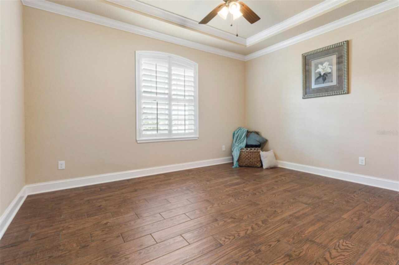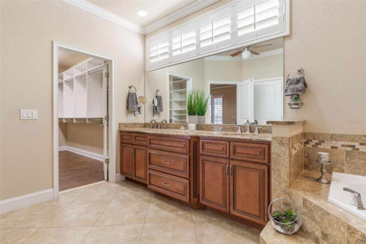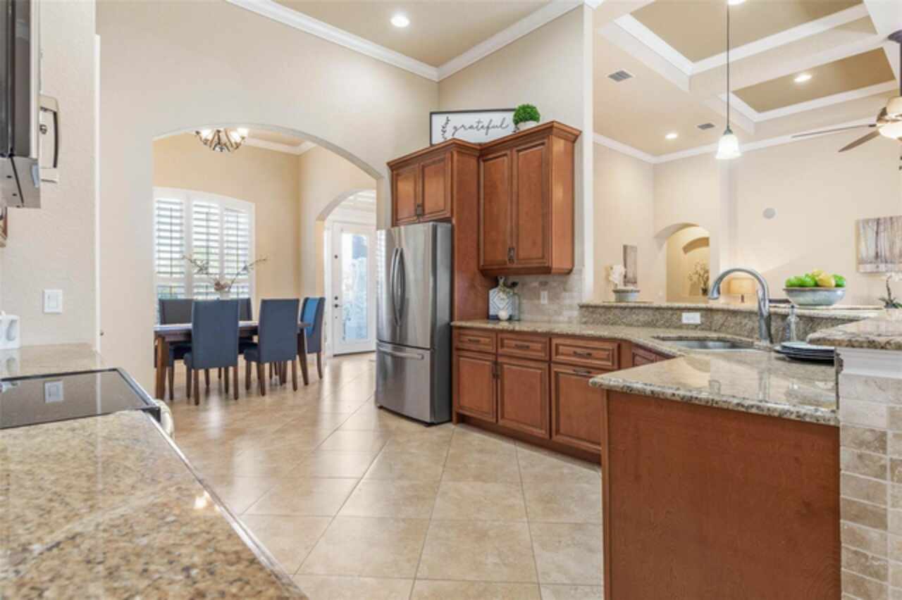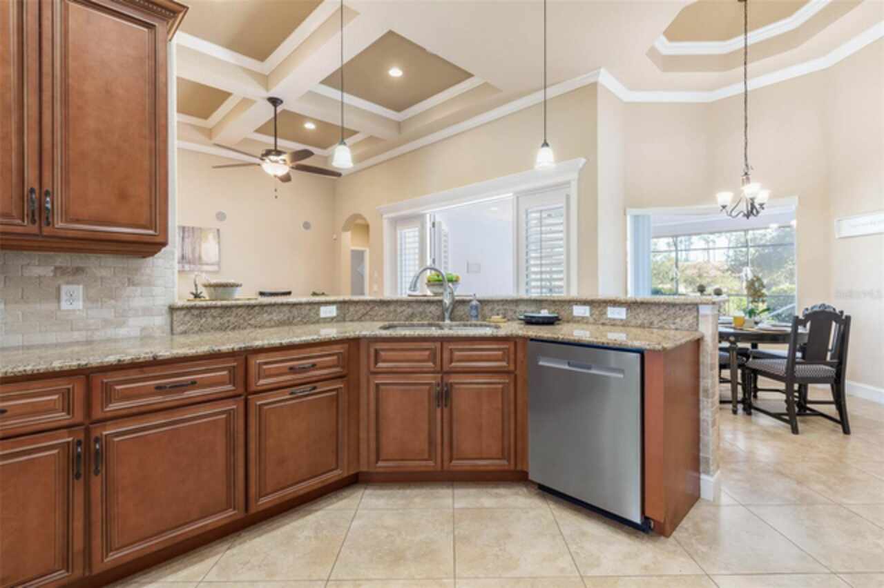 Attic Fan, Attic Ventilator, Ceiling Fans(s), Coffered Ceiling(s), Crown Molding, Eat-in Kitchen, High Ceilings, Kitchen/Family Room Combo, L Dining, Master Bedroom Main Floor, Open Floorplan, Solid Wood Cabinets, Split Bedroom, Stone Counters, Thermostat, Tray Ceiling(s), Walk-In Closet(s), Window Treatments