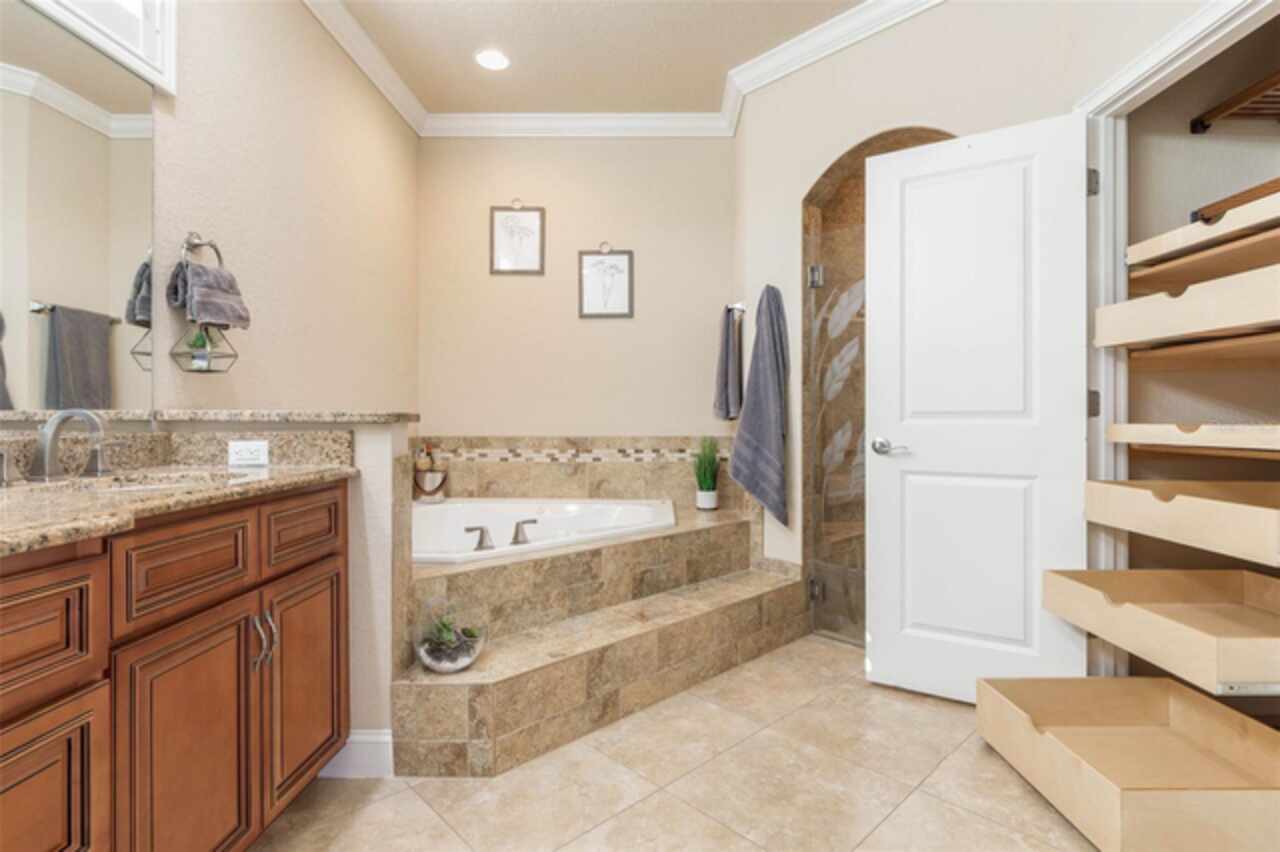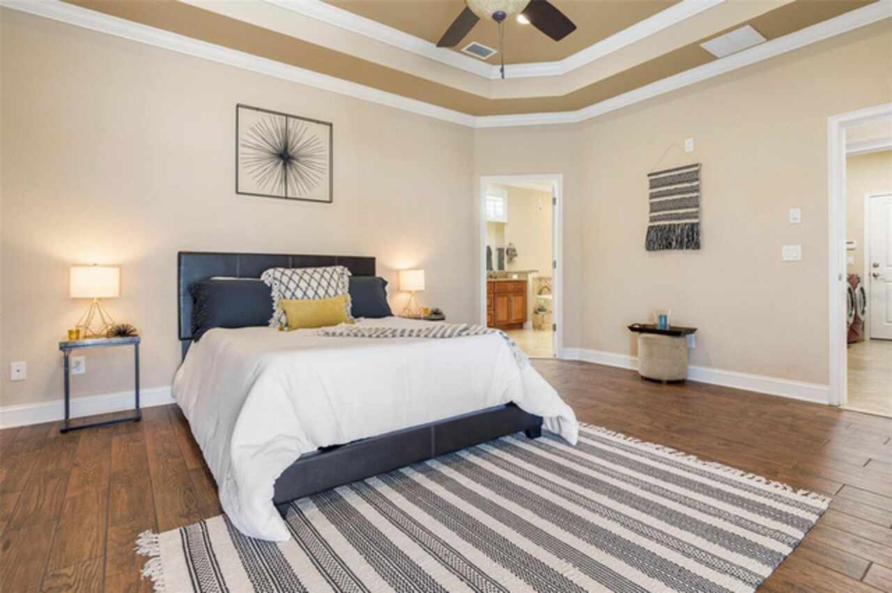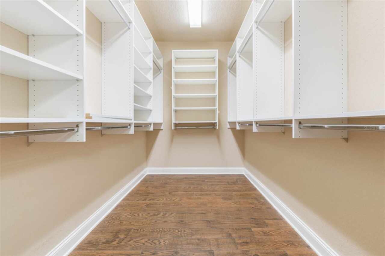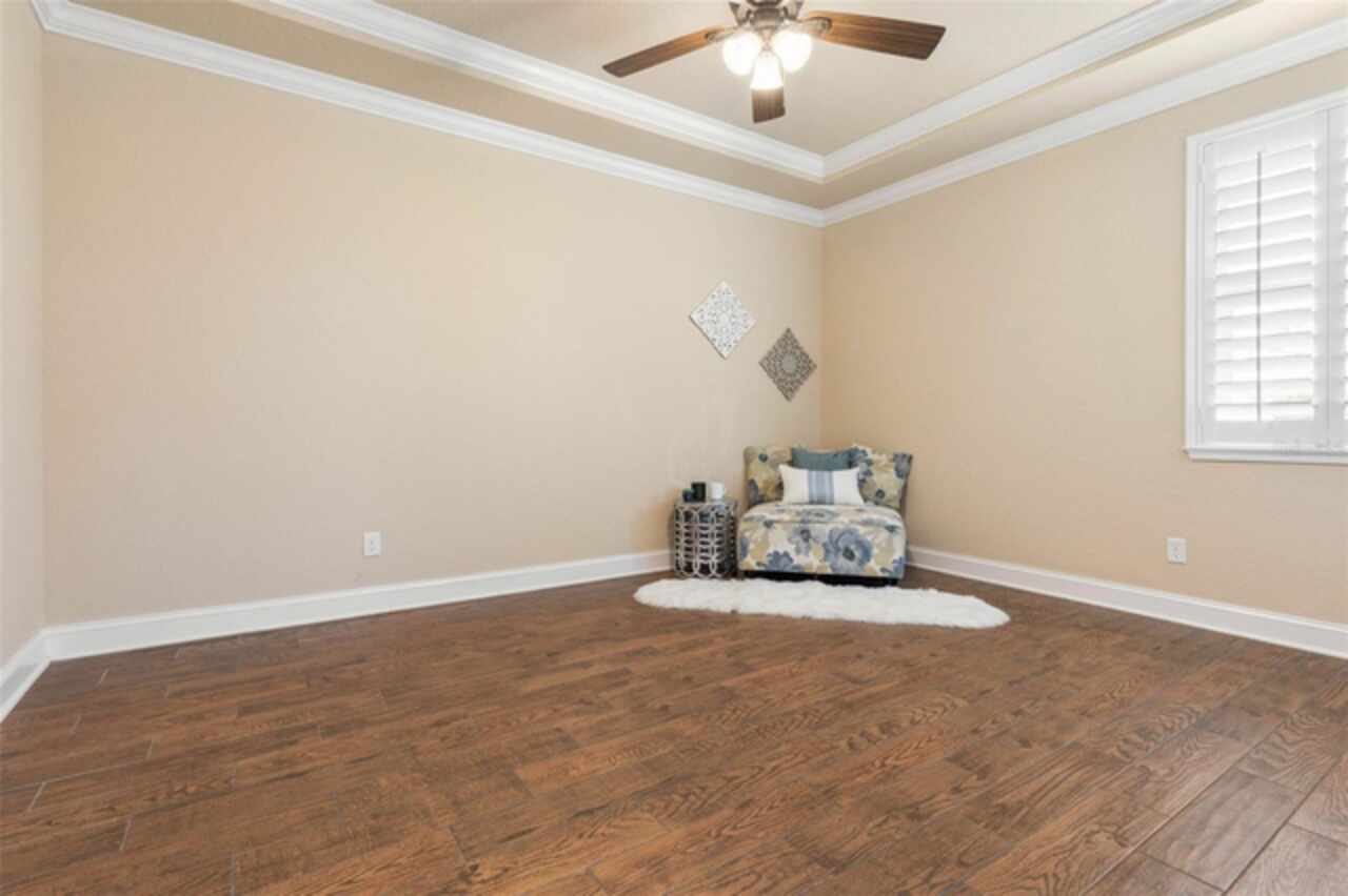 Attic Fan, Attic Ventilator, Ceiling Fans(s), Coffered Ceiling(s), Crown Molding, Eat-in Kitchen, High Ceilings, Kitchen/Family Room Combo, L Dining, Master Bedroom Main Floor, Open Floorplan, Solid Wood Cabinets, Split Bedroom, Stone Counters, Thermostat, Tray Ceiling(s), Walk-In Closet(s), Window Treatments