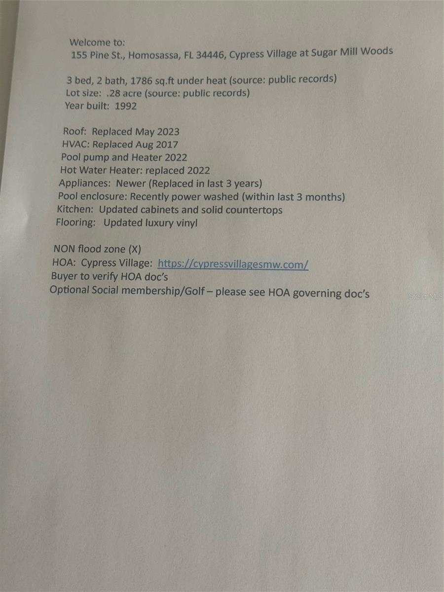 New Listing Price! Welcome to your Florida sanctuary at 155 Pine St., Homosassa, FL 34446, nestled in the desirable deed-restricted community of Sugarmill Woods–Cypress Village. This immaculate one-story pool home offers the perfect blend of comfort, style and outdoor living. 3 spacious bedrooms & 2 full baths in a thoughtful split-floor-plan design, providing privacy and convenience. Approximately 10 mins drive to the Nature Coast amenities such as Old Town Homosassa waterfront restaurants/activities Crystal River, which leads to the Gulf. All without being in a flood zone. Approximately 1, 786 sq ft of living space on a 0.28-acre lot. Property Highlights Bedrooms: 3 Bathrooms: 2 Living Area: Approx. 1, 786 sq ft Lot Size: 0.28 acres Year Built: 1992 Construction: Concrete block/stucco Garage: 2-car attached Vaulted ceilings and an open living area that seamlessly connect to the outdoor space. A stunning screened-lanai overlooking a heated in-ground pool and spa—imagine relaxing evenings, or sunny afternoons by the water. Recent upgrades: new roof (2023), hot water heater (2022), pool pump/heater and HVAC (2017) system updated, ensuring you can move in worry-free. Two-car attached garage, concrete driveway, and block/slab construction with stucco exterior—built in 1992 but expertly maintained. Located in a community that offers more than just a home: club house, community pool, fitness center, golf, shopping, restaurants—your Florida lifestyle awaits. Why You’ll Love It From the moment you arrive, the serene greenbelt-backed yard sets the stage for laid-back Florida living. Inside, the layout flows effortlessly: warm luxury-vinyl plank flooring throughout, sliding glass doors that expand your living space outdoors, and a kitchen updated with solid surface counters and modern touches. The primary suite includes a walk-in closet and views of the lanai and pool. Step outside to your screened oasis—your own personal retreat. Whether it’s a morning coffee by the spa’s gentle waterfall sound or a sunset swim, the outdoor ambiance is exceptional. The home’s upgrades and low-maintenance points make it ideal whether you’re full-time or enjoying part-time Florida living. Located in Homosassa and just minutes from the Gulf Coast, this address gives you easy access to nature, water recreation, and the laid-back Citrus County vibe. Whether you’re scalloping, manatee-spotting, or enjoying the nearby beaches, living here means embracing the best of Florida’s lifestyle. Built in 1992, low yearly HOA dues, optional Social club, golf, pool membership Move-in ready, upgraded systems Make This Home Yours Today! Don’t miss the chance to own a beautifully maintained pool home in one of the area’s most sought-after communities. Schedule a showing today and experience the indoor-outdoor Florida lifestyle that awaits! Some photos have been virtually staged.