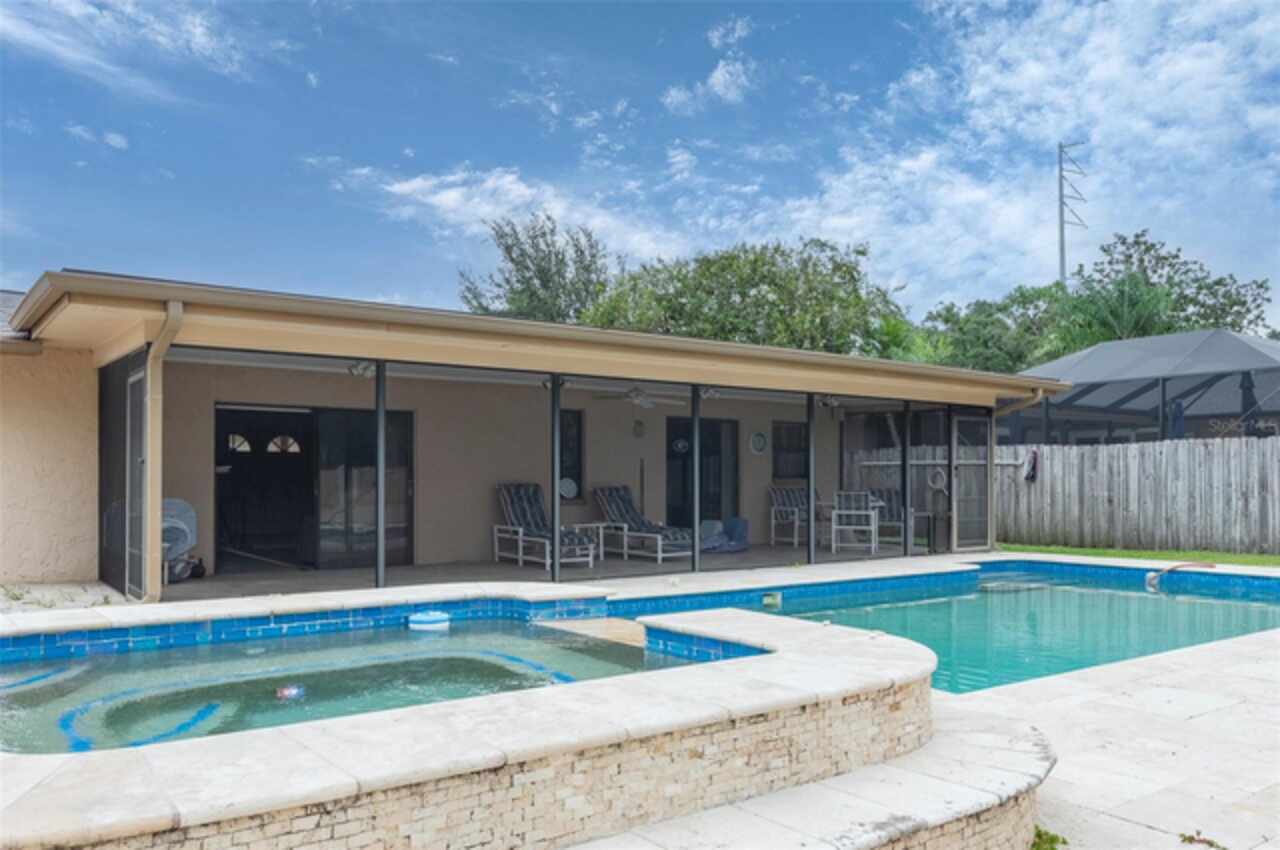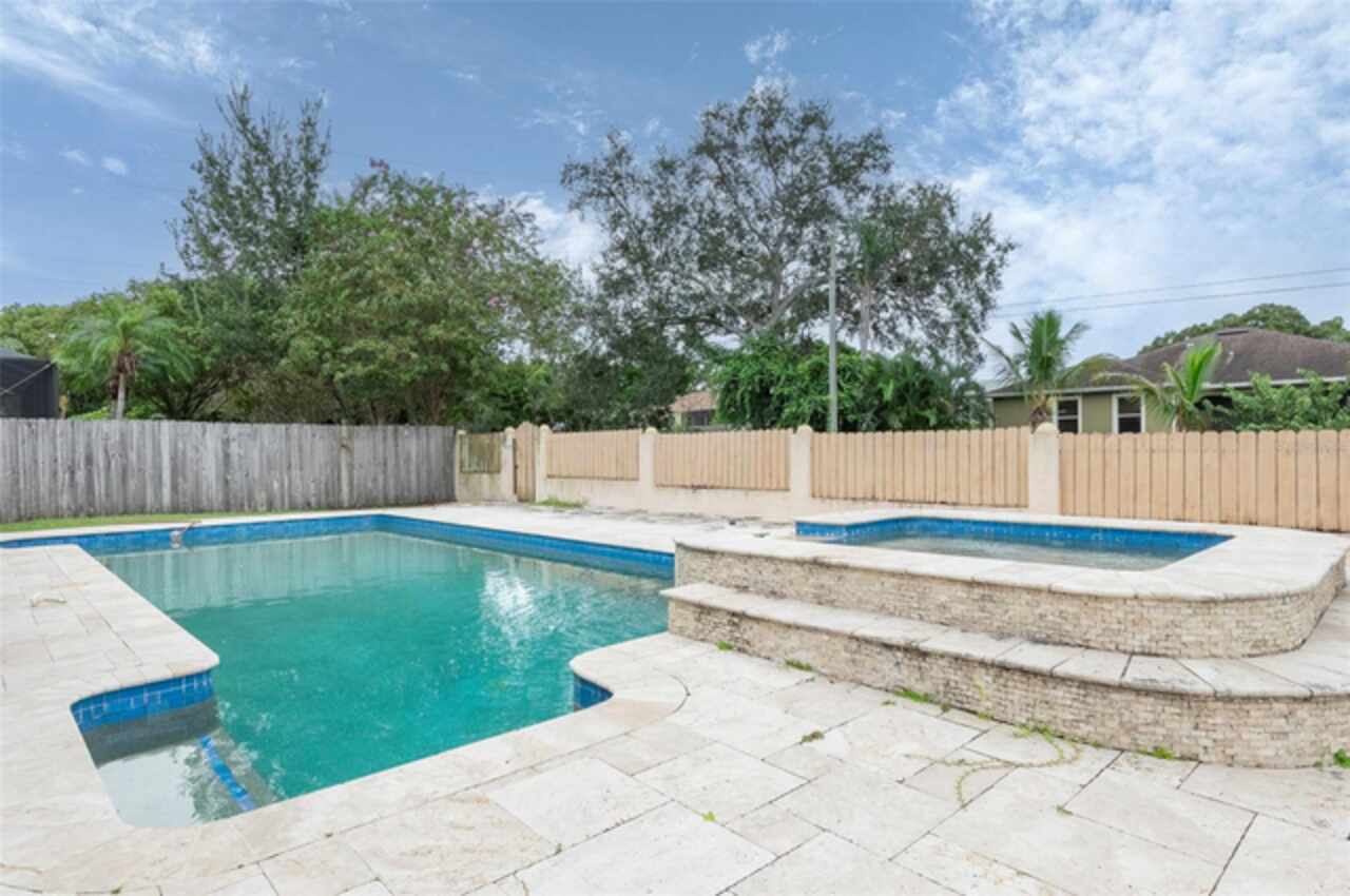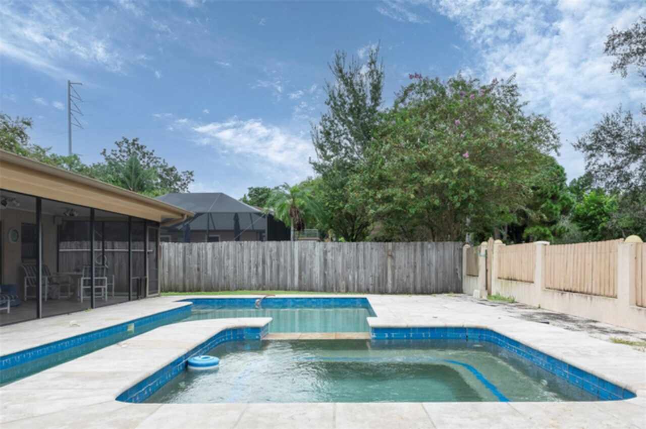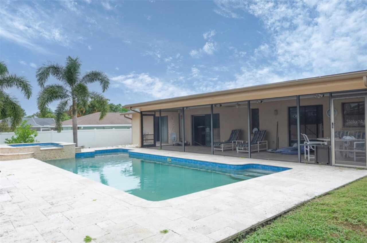 Under contract-accepting backup offers. "Unlock the Potential" this property is in desirable Brae-Moor South a deed-restricted subdivision in the city of Dunedin. The swimming pool and spa were the past owners' treasures. He took such great care of this outdoor entertaining space. The pool design bordered by natural stone tiles that give it a timeless elegance. Adjacent to the pool is a sunken spa, perfect for relaxing after a long day, with cascading water creating a soothing sound as it flows into the pool. Overall, this fixer-upper offers a unique opportunity: the bones are solid, the necessities like the newer roof installed in 2023 are covered, and the potential for creating an idyllic retreat in the backyard with an inviting pool and spa is enormous. With a bit of imagination and renovation efforts, this property can become a dream home.