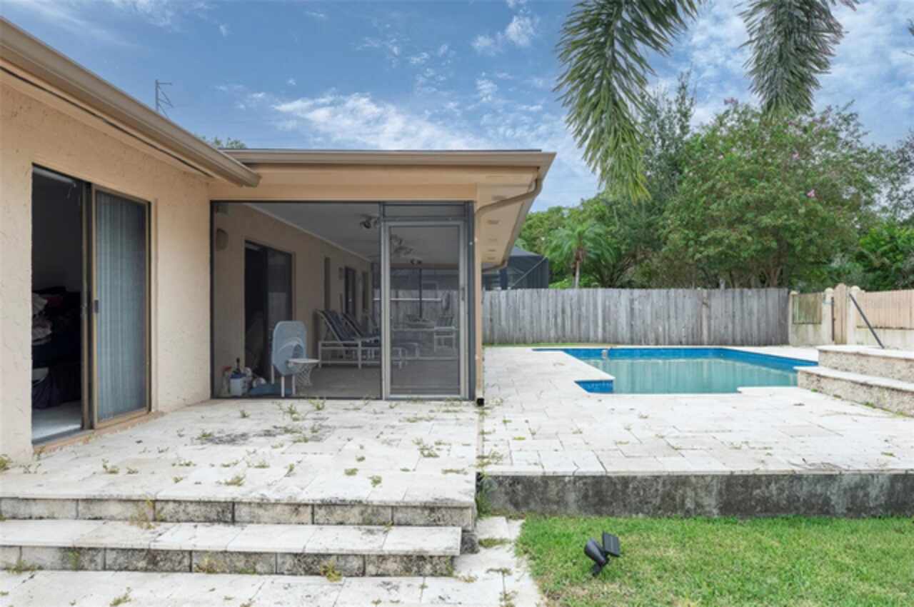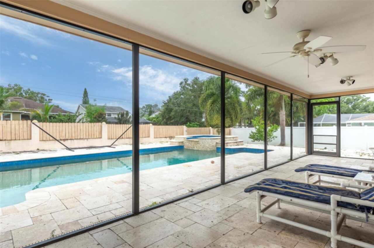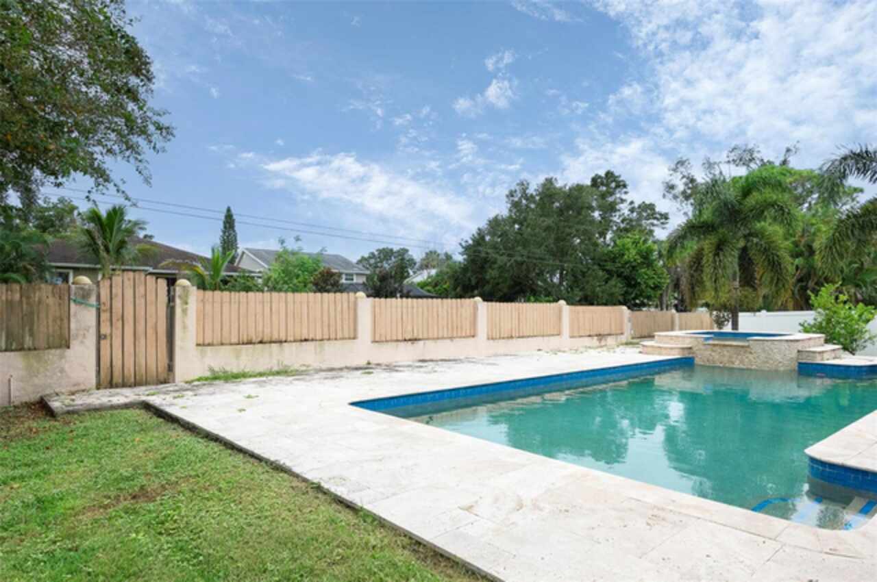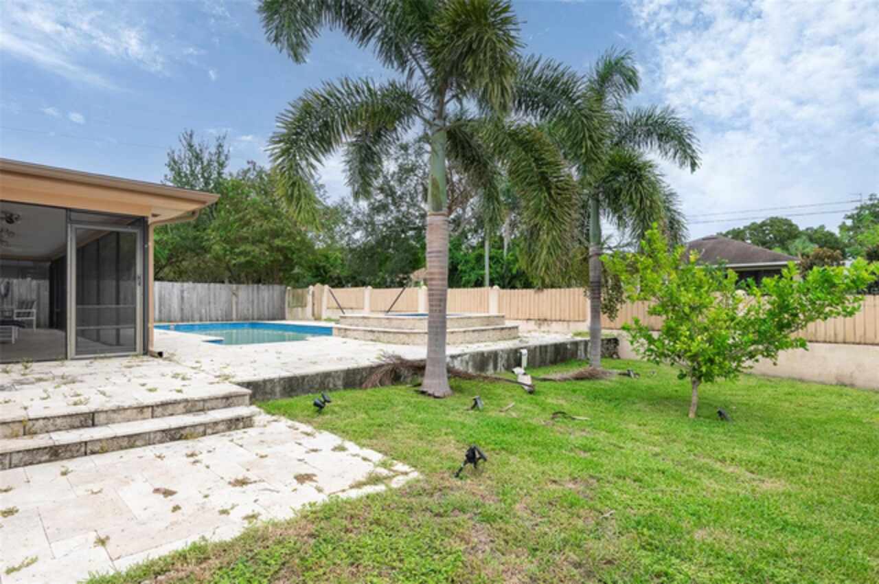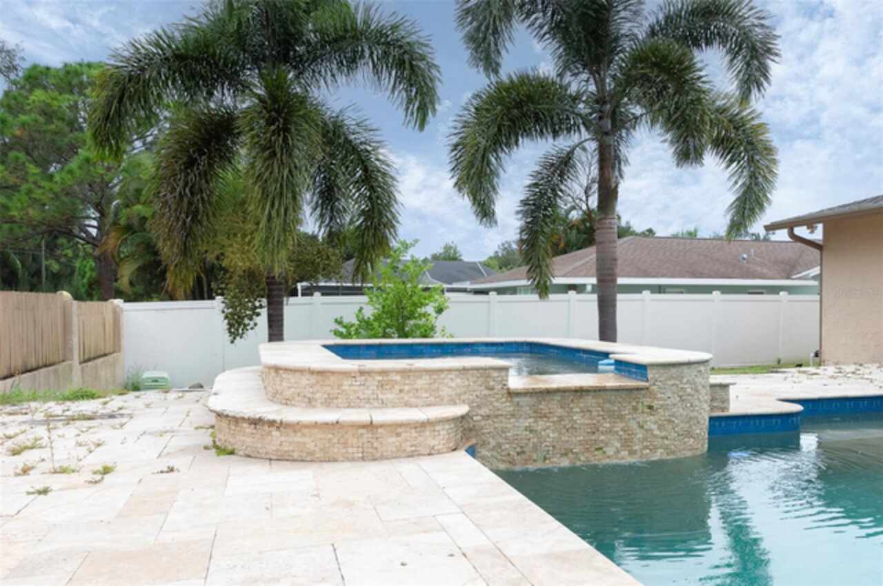 Under contract-accepting backup offers. "Unlock the Potential" this property is in desirable Brae-Moor South a deed-restricted subdivision in the city of Dunedin. The swimming pool and spa were the past owners' treasures. He took such great care of this outdoor entertaining space. The pool design bordered by natural stone tiles that give it a timeless elegance. Adjacent to the pool is a sunken spa, perfect for relaxing after a long day, with cascading water creating a soothing sound as it flows into the pool. Overall, this fixer-upper offers a unique opportunity: the bones are solid, the necessities like the newer roof installed in 2023 are covered, and the potential for creating an idyllic retreat in the backyard with an inviting pool and spa is enormous. With a bit of imagination and renovation efforts, this property can become a dream home.