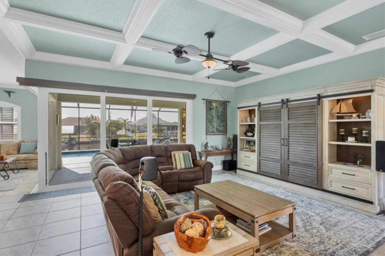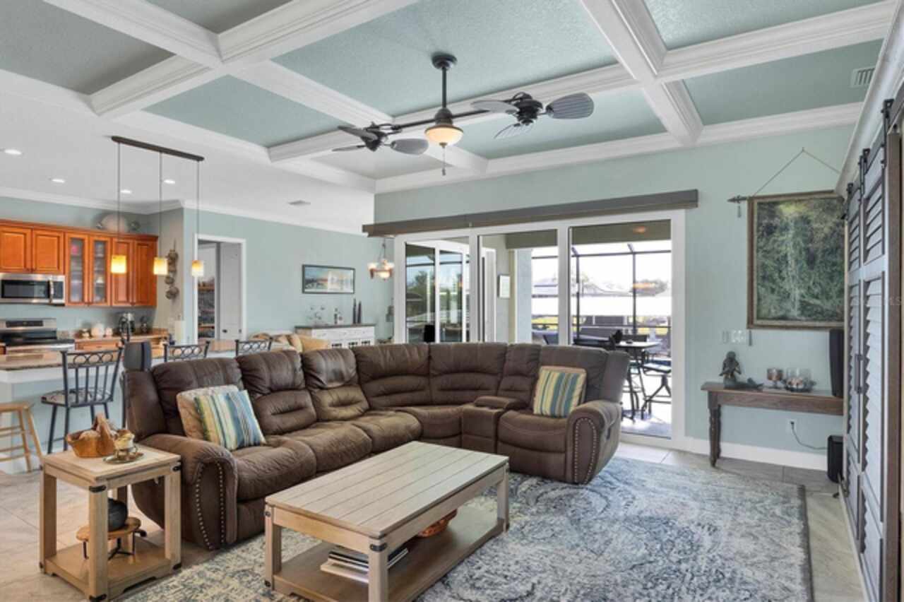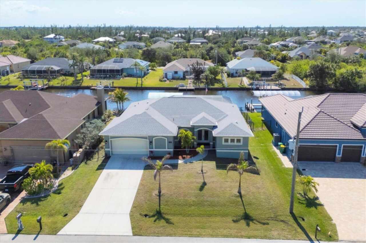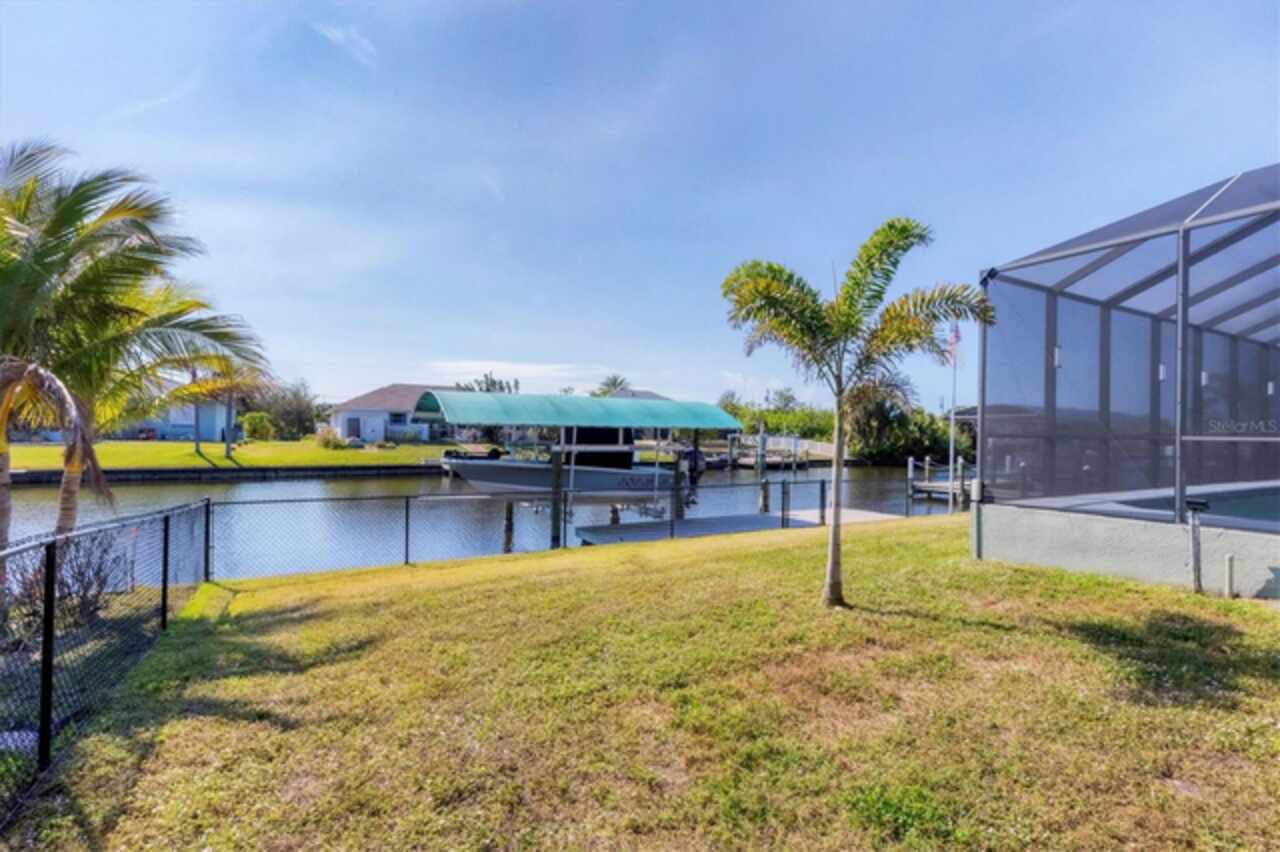 Location, location! South Gulf Cove welcomes you to the Florida lifestyle, in one of the most desirable areas of Port Charlotte. As you enter your view of the lanai and waterway is wide open through zero corner sliders that line the main living area. These literally bring the outdoors in and double your living space. The living room/great room is spacious with a beautiful coffered tray ceiling, and adjoining dining room will compliment your special gatherings. These flow to the open kitchen featuring an oversized granite breakfast bar with plenty of room for preparing and serving. Crowned wood cabinets, stainless appliances, walk in pantry and an cooktop make your life easy. Serve your feast in the large dinette area, which is also open to the beautiful views outdoors. The master suite is lovely with two HUGE closets, and the ensuite features a walk through shower with two rainheads. The guest bedrooms in this split plan can be closed off for privacy. The finishes in this home are lovely, with crowned molding throughout, tray ceilings, elegant light and fan fixtures. Practical features include impact glass, panels for the lanai sliders, concrete seawall, bonus area in garage. The garage also featured an remote control roll down bug screen. The salt water heated pool surrounded by multicolored LED lights and lanai complete your outdoor living, with an additional half bath. Electric Hurricane roll down shutter protect the front and back of the house. The house also features a wired in surge protector, a dog walk, 10k boat lift, new roof (2023), New salt water generator (2025), Interior and exterior paint. Imagine the wonderful times you can spend entertaining family and friends, or just relax enjoying life.
