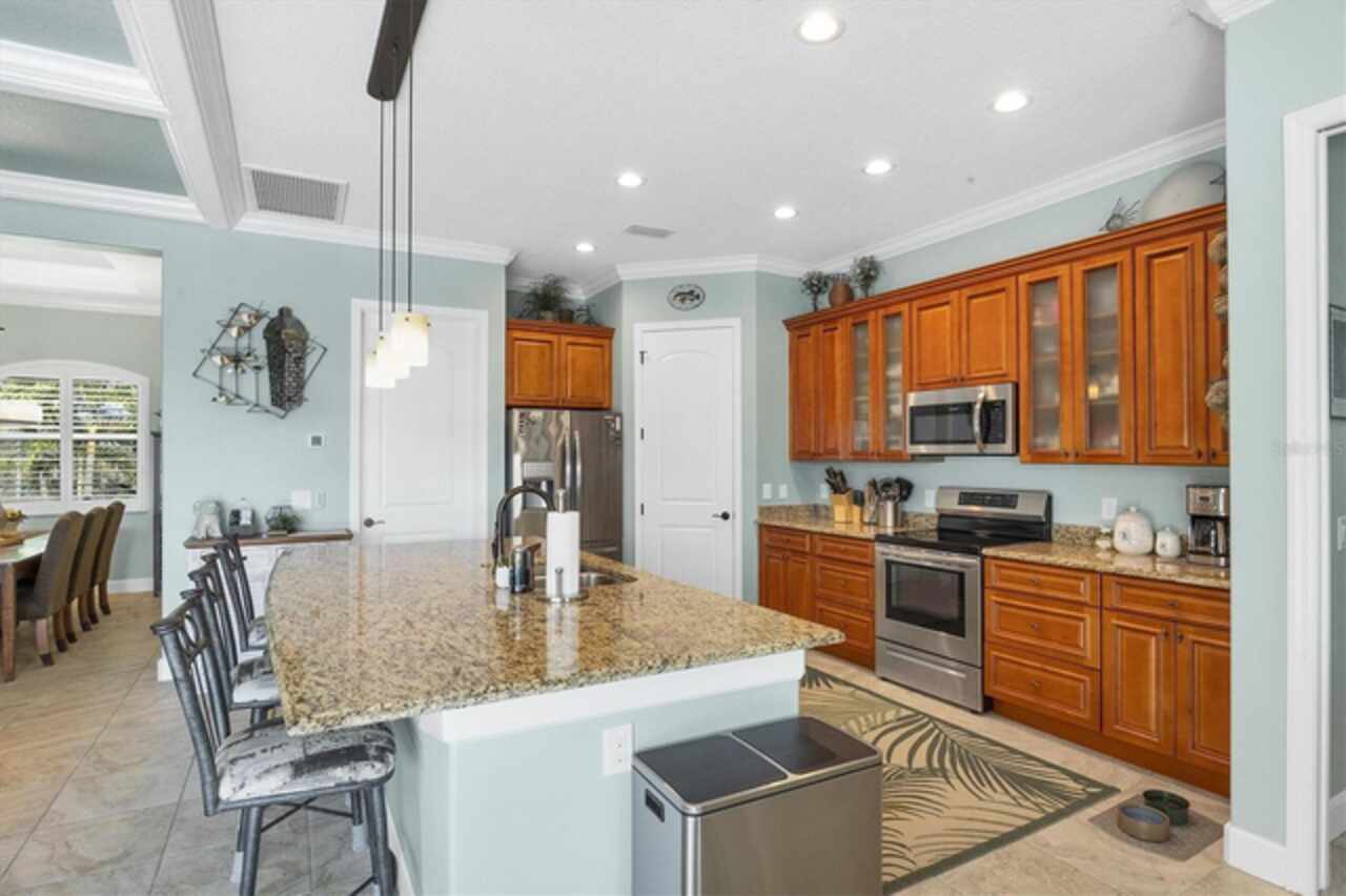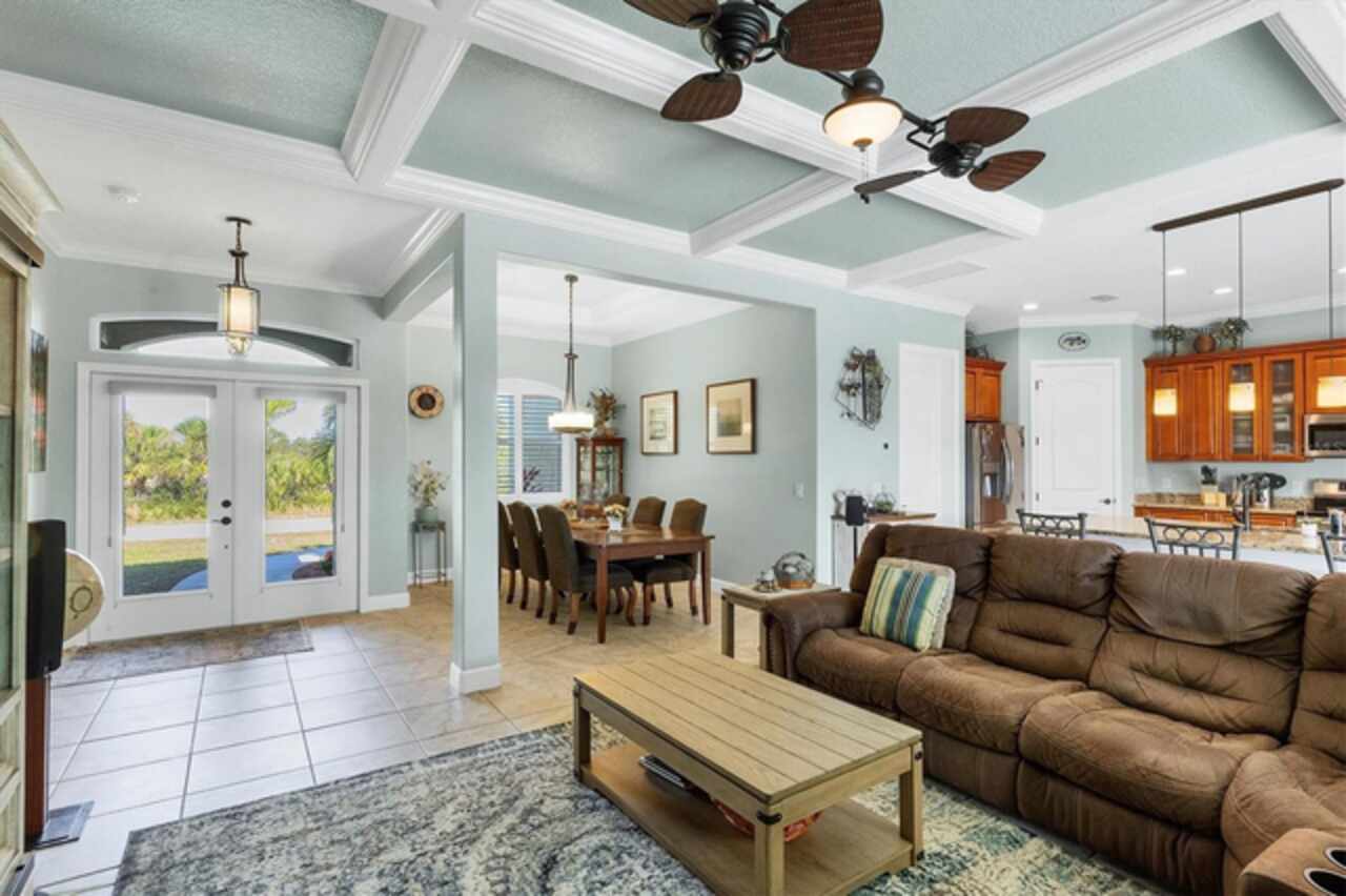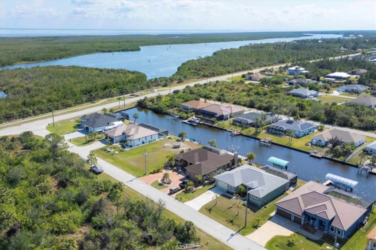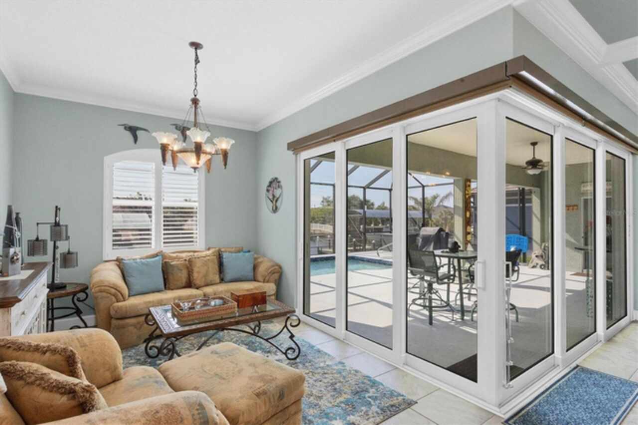 Location, location! South Gulf Cove welcomes you to the Florida lifestyle, in one of the most desirable areas of Port Charlotte. As you enter your view of the lanai and waterway is wide open through zero corner sliders that line the main living area. These literally bring the outdoors in and double your living space. The living room/great room is spacious with a beautiful coffered tray ceiling, and adjoining dining room will compliment your special gatherings. These flow to the open kitchen featuring an oversized granite breakfast bar with plenty of room for preparing and serving. Crowned wood cabinets, stainless appliances, walk in pantry and an cooktop make your life easy. Serve your feast in the large dinette area, which is also open to the beautiful views outdoors. The master suite is lovely with two HUGE closets, and the ensuite features a walk through shower with two rainheads. The guest bedrooms in this split plan can be closed off for privacy. The finishes in this home are lovely, with crowned molding throughout, tray ceilings, elegant light and fan fixtures. Practical features include impact glass, panels for the lanai sliders, concrete seawall, bonus area in garage. The garage also featured an remote control roll down bug screen. The salt water heated pool surrounded by multicolored LED lights and lanai complete your outdoor living, with an additional half bath. Electric Hurricane roll down shutter protect the front and back of the house. The house also features a wired in surge protector, a dog walk, 10k boat lift, new roof (2023), New salt water generator (2025), Interior and exterior paint. Imagine the wonderful times you can spend entertaining family and friends, or just relax enjoying life.