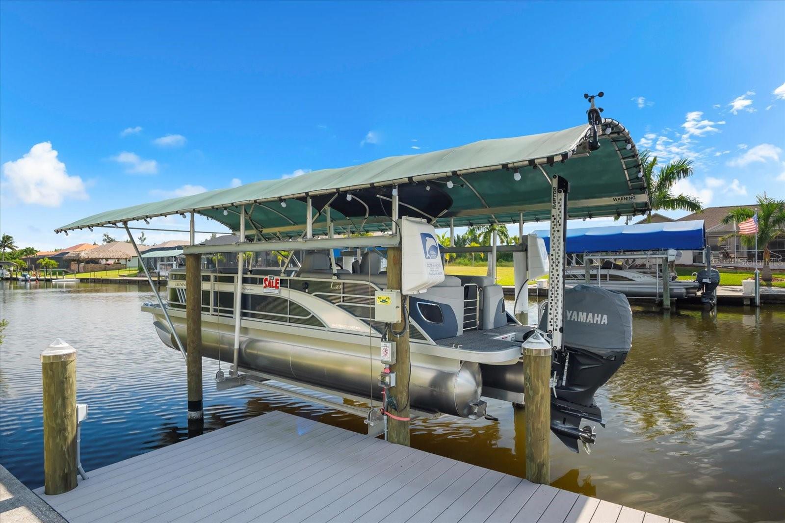 This immaculate 3-bedroom, 3-bathroom, 3-car garage home sits on a seawalled canal lot and is packed with high-end upgrades and coastal-inspired finishes throughout. From the moment you step inside, you’re welcomed by a designer feature wall, shiplap ceilings, and an expansive open floor plan that blends luxury, comfort, and waterfront living. The upgraded kitchen is a true showstopper, featuring custom soft-close cabinetry, 10 10-foot island with Calacutta quartz top, tile backsplash, under-cabinet outlets and lighting, GE Profile appliances, coastal-style doors, and a dry bar ideal for entertaining. The elegant dining room flows seamlessly into the great room, complete with zero-degree sliders that open fully to the pool and canal, creating a breathtaking indoor-outdoor experience. Enjoy crown molding throughout, plantation shutters, and beautiful framed mirrors in every bathroom. The primary suite is a peaceful retreat with two spacious walk-in closets, sliding doors leading directly to the lanai, and a spa-inspired bathroom featuring a rainfall shower, a beautiful niche with seating, double vanities, and a linen closet. The guest bedrooms are equally impressive; one offers a walk-in closet and an en-suite with a gorgeous tile shower, while the second guest bath features a large vanity and tub. All bathrooms are equipped with comfort-height toilets and Calacutta quartz throughout. Step outside to your private oasis: a heated saltwater PebbleTec pool with sunshelf and bubbler, surrounded by an upgraded clear-view screen for uninterrupted water vistas. The home's rear and front doors are equipped with electric roll-down shutters, in addition to the impact windows and doors throughout. The outdoor living area includes an outdoor kitchen, a secondary covered lanai off the guest suite (doubling as a convenient pool bath space), and tongue-and-groove ceilings on both front and back porches. Boaters will love the 8x30 composite dock complete with water, electric, Dok Lites, a remote-operated lift, canopy, and lighting. The beautifully landscaped yard includes royal palms along the water, Eureka palms for privacy, concrete curbing with stone, up-lighting, and irrigation with city water. Additional features include a tile roof, spray foam insulation, an insulated upgraded garage door, an epoxy-coated garage floor, overhead garage storage, custom closets throughout, a finished laundry room with cabinets and sink, a 30 Amp outlet in the garage, pre-wired whole-home filtration with a 6x5 concrete pad, and an insulated shed with custom shelving. The homeowner spared no expense; every detail of this home reflects quality and attention to detail. Located just minutes from beaches, golf, dining, shopping, and all that South Gulf Cove offers, with quick access out by water through one bridge, this is coastal Florida living at its finest.