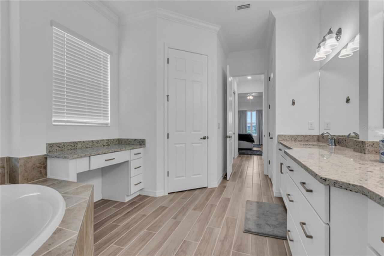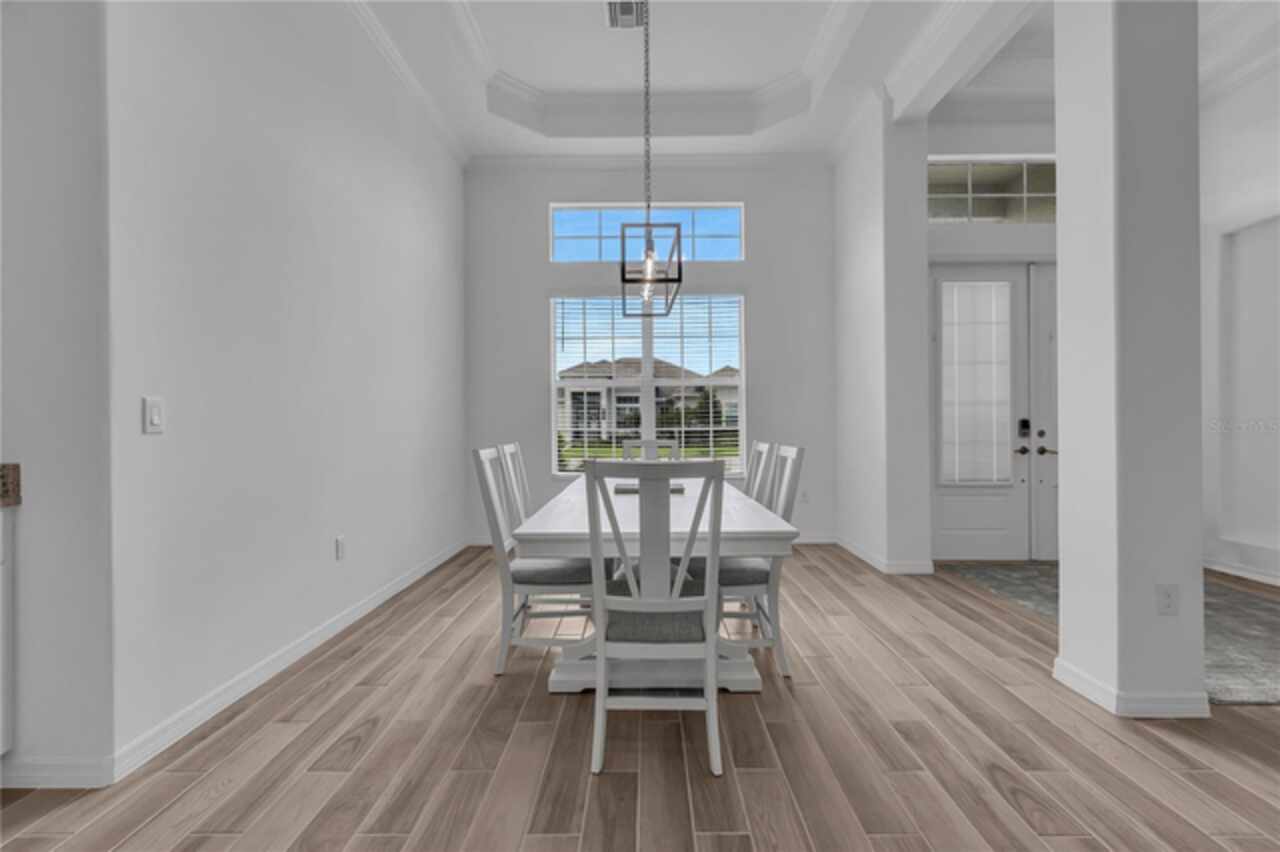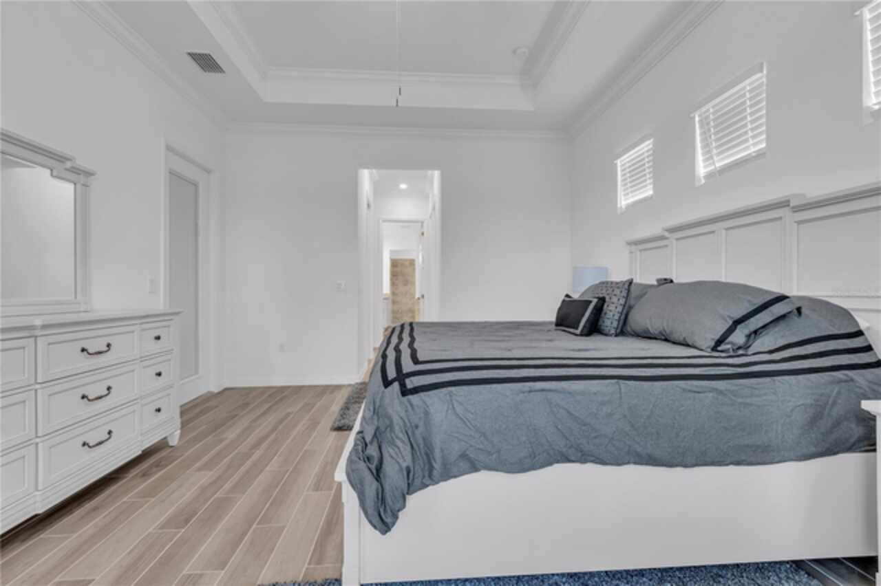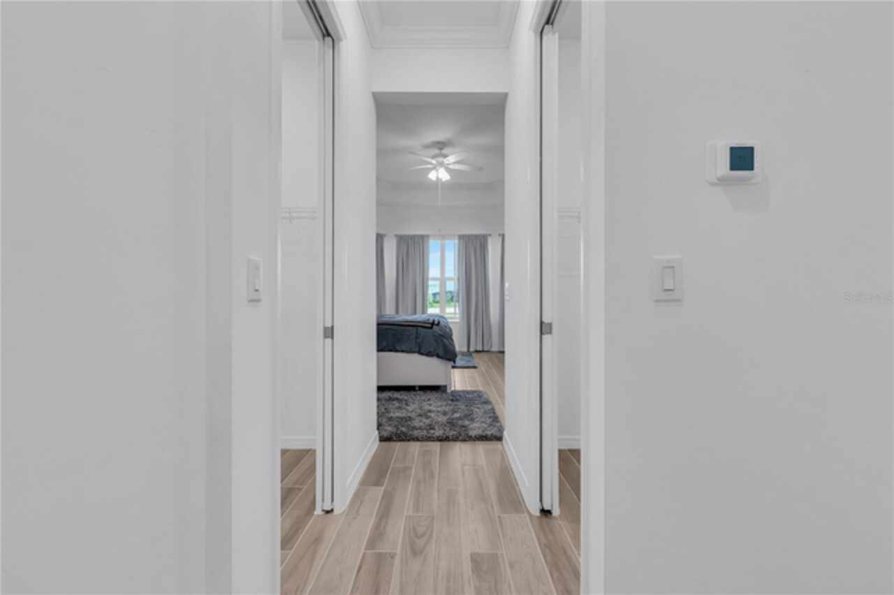 Built-in Features, Ceiling Fans(s), Crown Molding, Eat-in Kitchen, High Ceilings, In Wall Pest System, Kitchen/Family Room Combo, Open Floorplan, Primary Bedroom Main Floor, Solid Surface Counters, Solid Wood Cabinets, Split Bedroom, Thermostat, Tray Ceiling(s), Walk-In Closet(s)