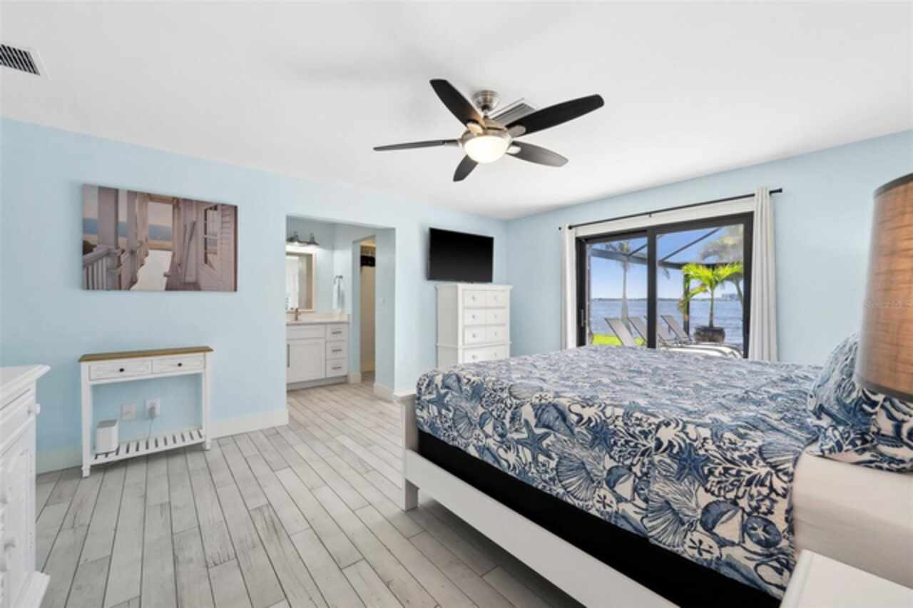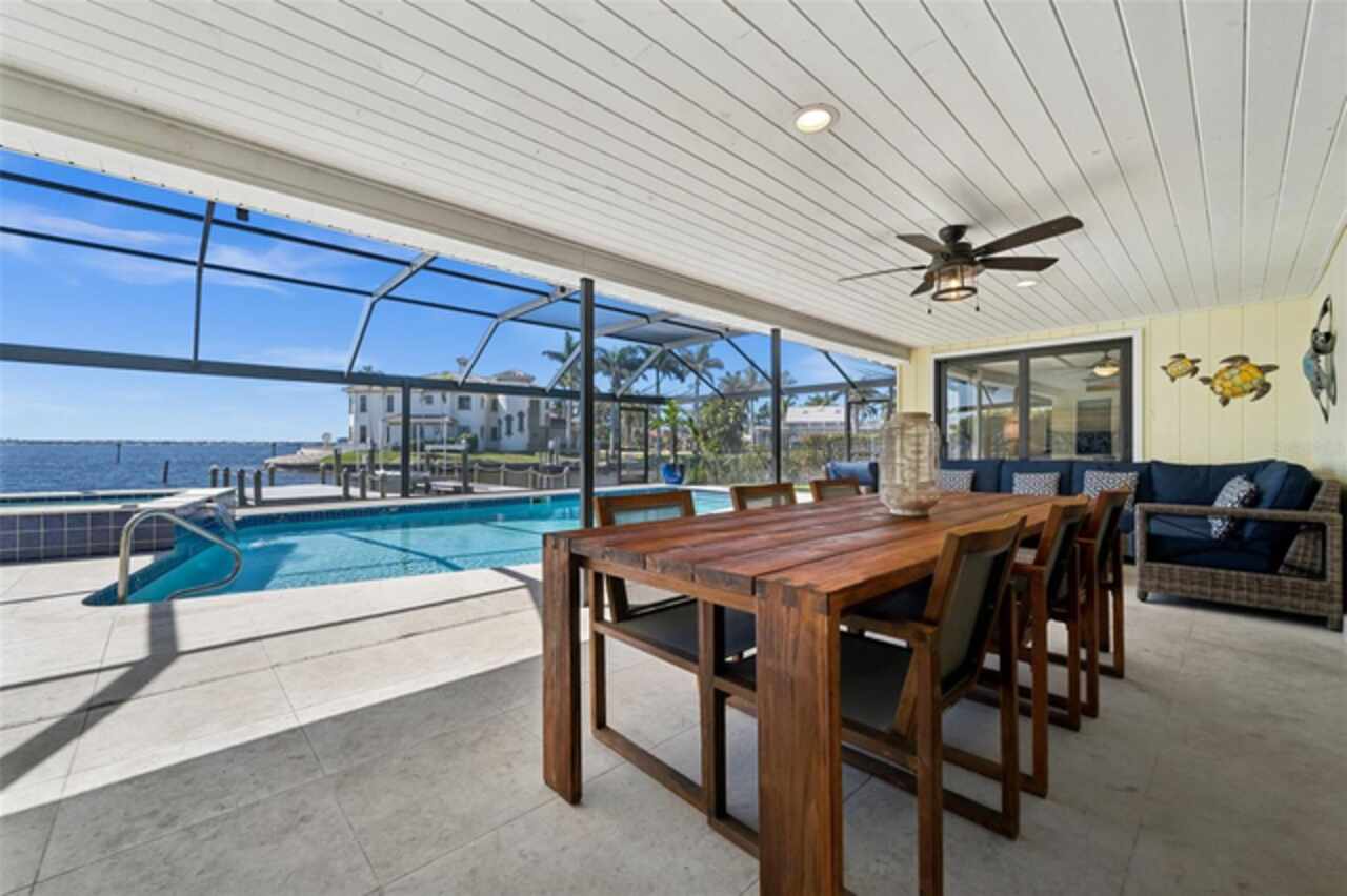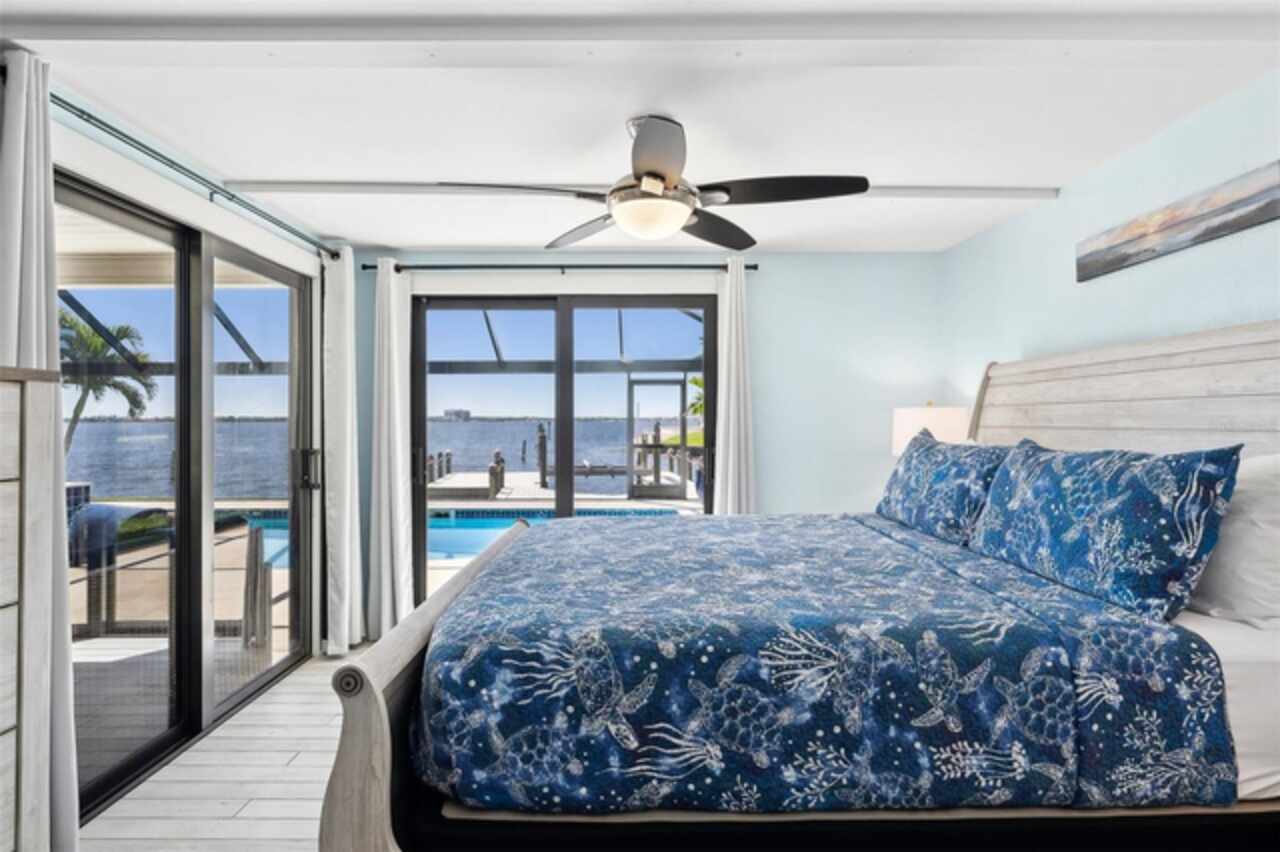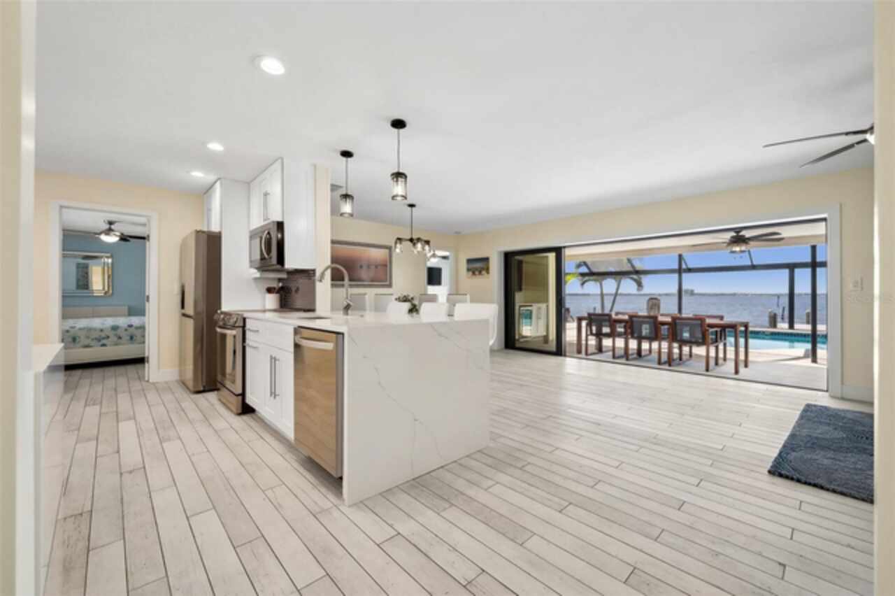 Welcome to 1600 Edith Esplanade, where breathtaking panoramic views of the Caloosahatchee River take center stage. This stunning south-facing riverfront home offers 116 feet of direct river frontage for an unbeatable waterfront lifestyle, with wide open vistas visible from nearly every room. Enjoy the Florida lifestyle to the fullest from the expansive screened lanai, complete with a heated pool and spa, a bar area with fridge and TV, and plenty of space for outdoor dining and lounging. The picture window screens showcase the endless water views, making every sunset unforgettable. Inside, this beautifully remodeled home features tile flooring throughout and a modern kitchen with quartz countertops, a dramatic waterfall edge, tile backsplash, and stainless steel appliances. The open layout blends style and function, perfect for both entertaining and everyday living. The master suite is a true retreat with its own sliders out to the pool area and a luxurious ensuite bath with a glass-walled, tiled shower. The second bedroom also enjoys private access to the lanai and pool through two sets of sliding glass doors at the corner of the room—maximizing natural light and waterfront views and creating a bright and airy feel, making this space perfect for guests or a secondary suite. It also features a spacious changing room offering additional sitting or dressing space. The third bedroom is a junior suite, complete with its own full bathroom—ideal for guests seeking privacy and comfort. The property also includes a 13, 000-lb boat lift, a large dock with ample seating, lush tropical landscaping, stamped concrete driveway, a metal roof, and a 2-car garage with an additional 10x20 storage area and extra parking on the side of the house. With 4 bedrooms and 3 full baths, this home is as practical as it is picturesque—ideal for full-time living, a luxurious vacation escape, or as an income-producing vacation property. This home is currently in a successful vacation rental program.