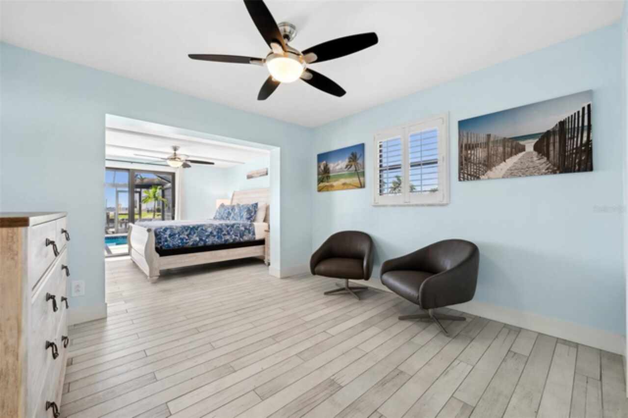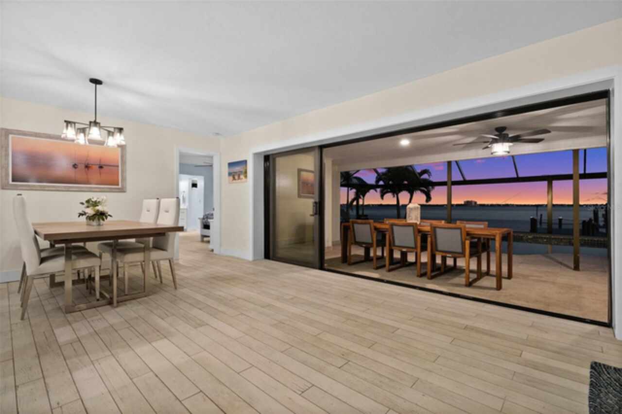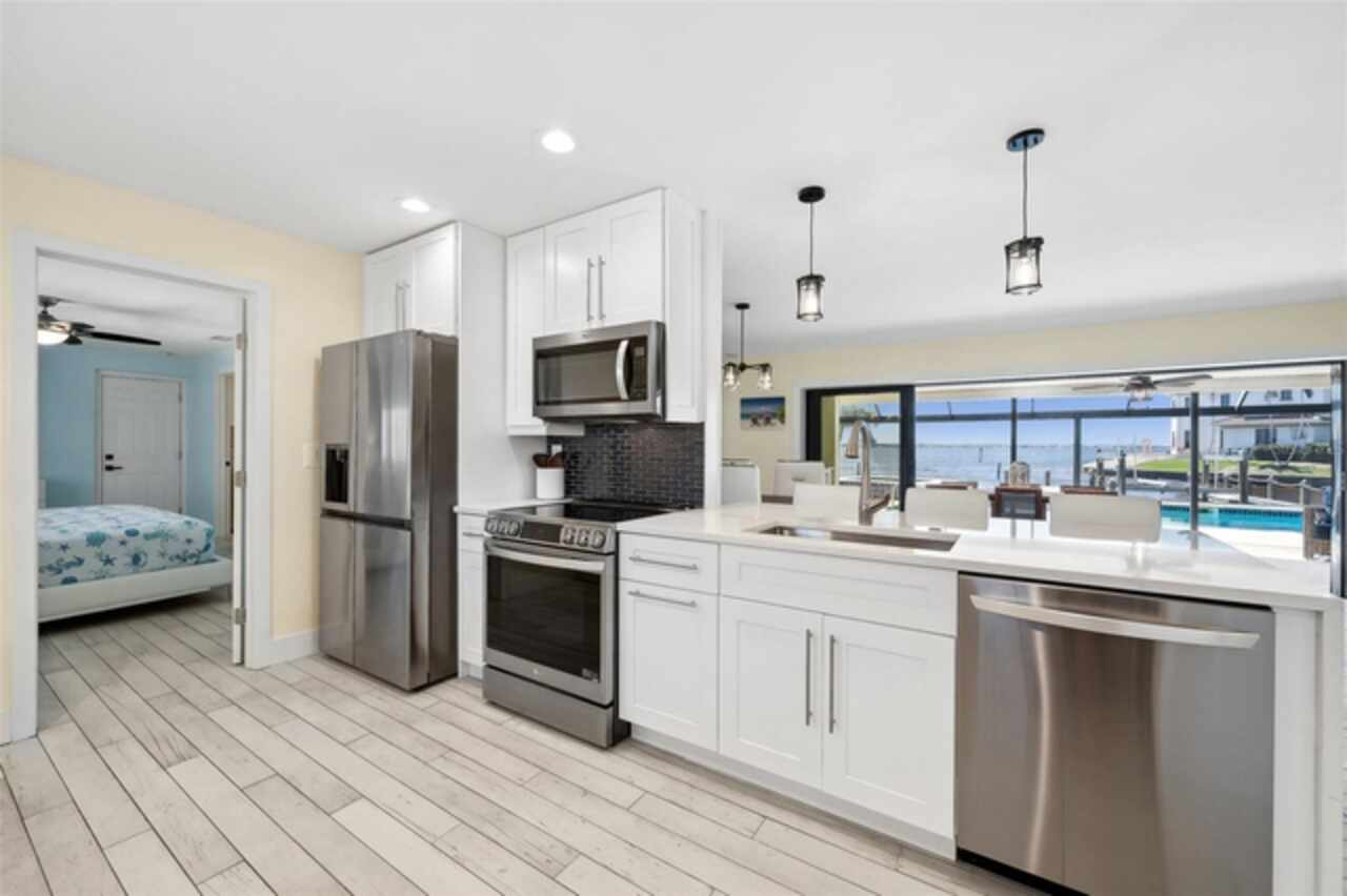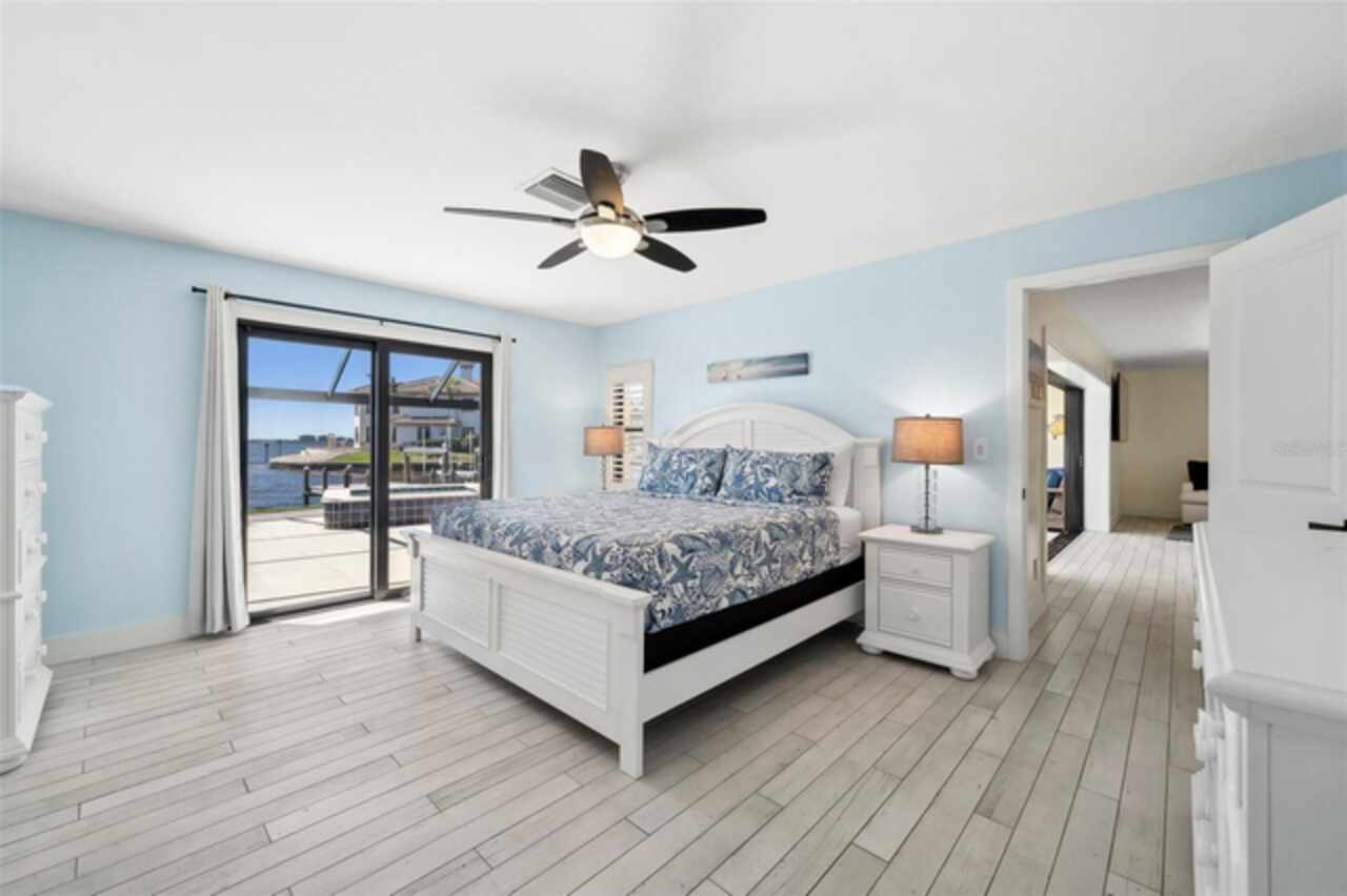 Welcome to 1600 Edith Esplanade, where breathtaking panoramic views of the Caloosahatchee River take center stage. This stunning south-facing riverfront home offers 116 feet of direct river frontage for an unbeatable waterfront lifestyle, with wide open vistas visible from nearly every room. Enjoy the Florida lifestyle to the fullest from the expansive screened lanai, complete with a heated pool and spa, a bar area with fridge and TV, and plenty of space for outdoor dining and lounging. The picture window screens showcase the endless water views, making every sunset unforgettable. Inside, this beautifully remodeled home features tile flooring throughout and a modern kitchen with quartz countertops, a dramatic waterfall edge, tile backsplash, and stainless steel appliances. The open layout blends style and function, perfect for both entertaining and everyday living. The master suite is a true retreat with its own sliders out to the pool area and a luxurious ensuite bath with a glass-walled, tiled shower. The second bedroom also enjoys private access to the lanai and pool through two sets of sliding glass doors at the corner of the room—maximizing natural light and waterfront views and creating a bright and airy feel, making this space perfect for guests or a secondary suite. It also features a spacious changing room offering additional sitting or dressing space. The third bedroom is a junior suite, complete with its own full bathroom—ideal for guests seeking privacy and comfort. The property also includes a 13, 000-lb boat lift, a large dock with ample seating, lush tropical landscaping, stamped concrete driveway, a metal roof, and a 2-car garage with an additional 10x20 storage area and extra parking on the side of the house. With 4 bedrooms and 3 full baths, this home is as practical as it is picturesque—ideal for full-time living, a luxurious vacation escape, or as an income-producing vacation property. This home is currently in a successful vacation rental program.