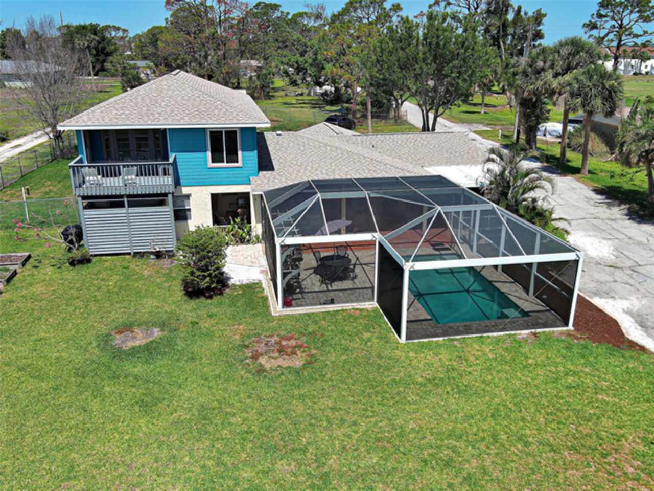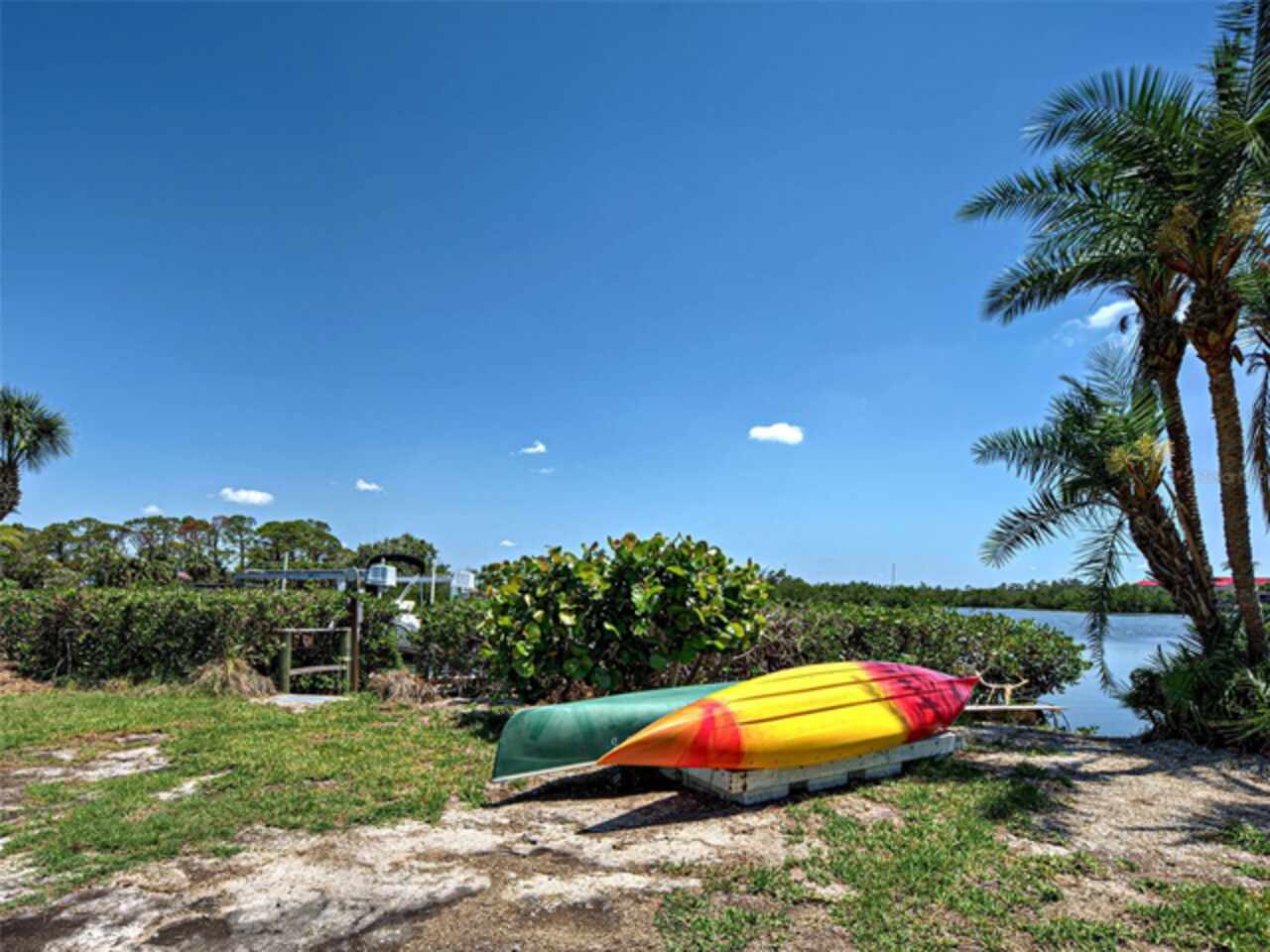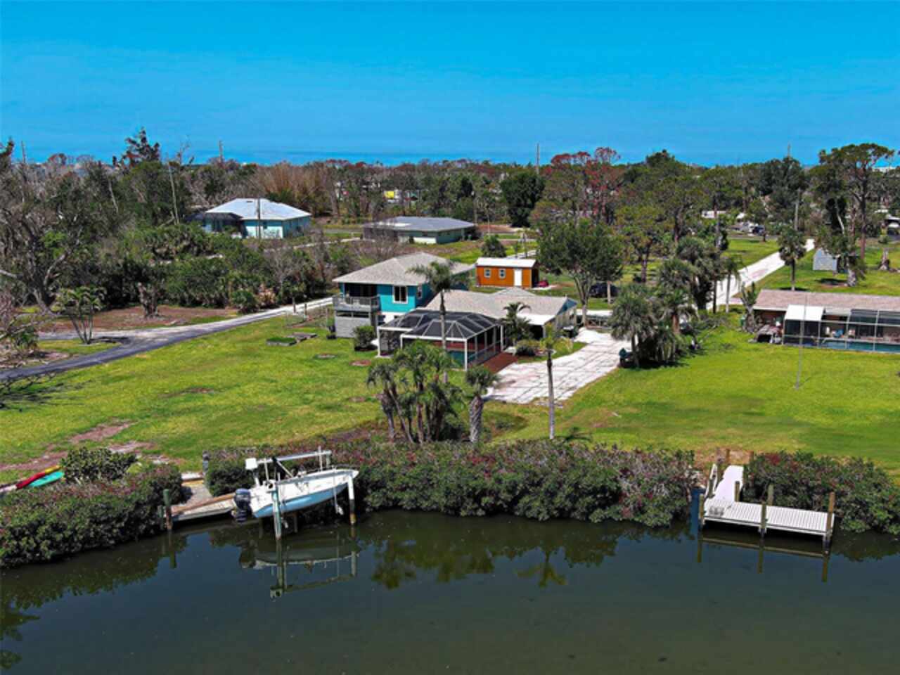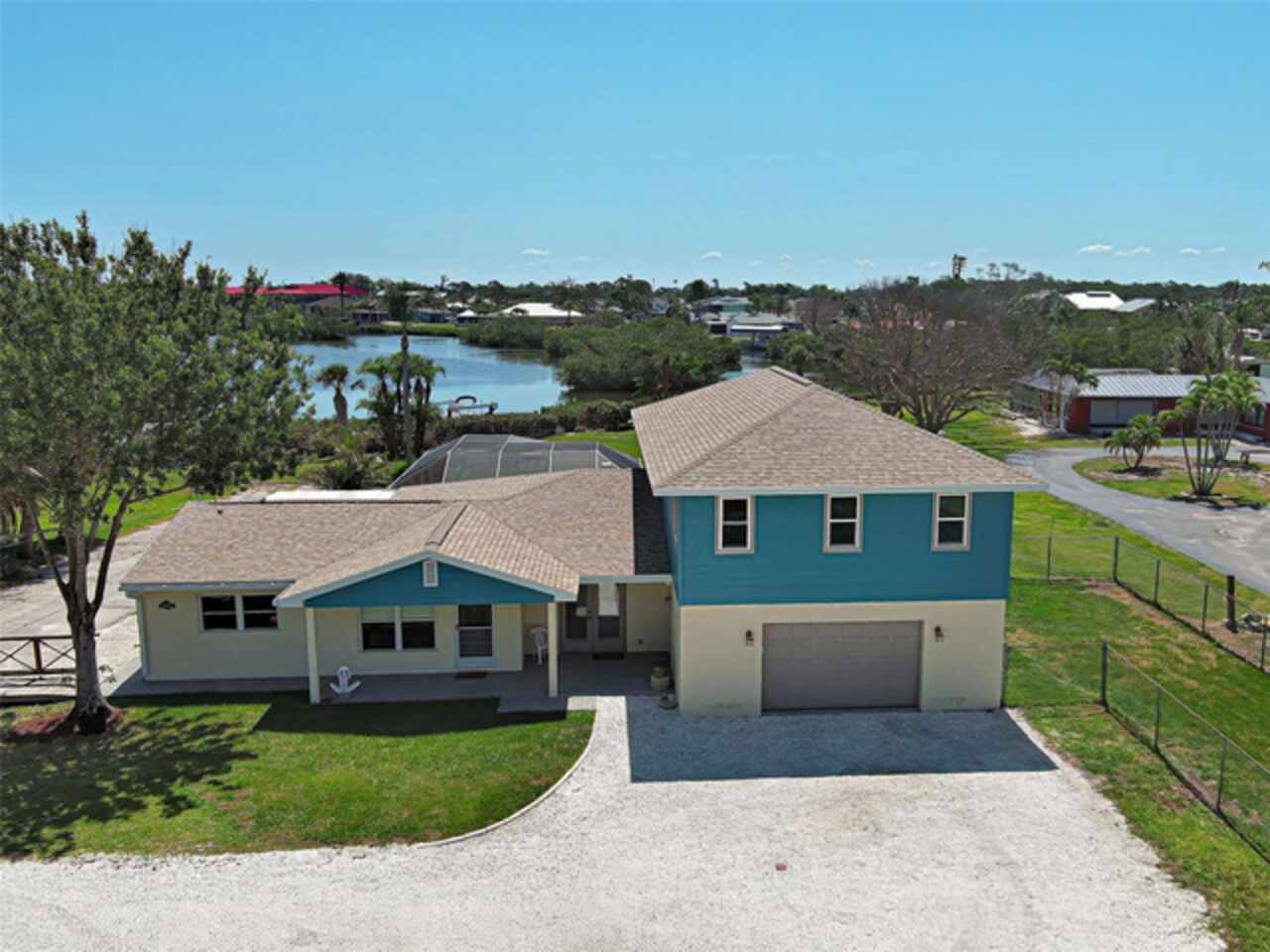 Boater's Paradise!!! Beautifully renovated waterfront home with one bridge to Lemon Bay and easy access to the Gulf at Stump Pass. Dock is equipped with a 6000 lb. Boat Lift and there is a floating dock for canoe/kayak access along the 170 ft. pristine Ainger Creek. This serene 1.08 acres property includes the home and Lots 3, 4 and 5. Lots 1 and two totals .7 acres and are available under a separate agreement. The entire first floor and lanai are artfully tiled and natural stone pavers encircle the pool. This home doubled in size in 2000 with a two story addition including a primary bedroom with a wonderful view of the creek from a private balcony. Also has a sitting area and en suite with a jetted tub. The second level also includes a guest room with bath and laundry room. The sparkling, heated, saltwater pool was added in 2021 and has a Clearview pool cage and a new pump and pool heater this year. Large area on the lanai is wired for a hot tub or perfect for adding an outdoor kitchen. The dining room opens up to the lanai with two sets of French doors. There is a bonus room with plank floor tile and an oversized attached one car garage with plenty of room for storage. The first level also has a guest room. totally remodeled bath, and an office/den with closet which could be a fourth bedroom The beautiful remodeled kitchen has exotic granite countertops, tumbled marble backsplash, hardwood Cherry cabinetry, and all new appliances. Impact windows are installed on all the windows on the second floor and hurricane fabric on the balcony and all windows and doors on the lower level. The roof was re-shingled in 2022. The entire exterior and first level interior was just painted this year The first floor AC unit is new and the main electric service is also new this year. A detached 12x24 garage/workshop was recently built. Dogs can find all the legroom they need in the supersized fenced area accessed through a dog door in the garage. You will love the location of this property near shopping, restaurants , numerous golf courses and just two miles from the beautiful beaches on Manasota Key. Come experience the old Florida charm that this wonderful Englewood home has to offer.