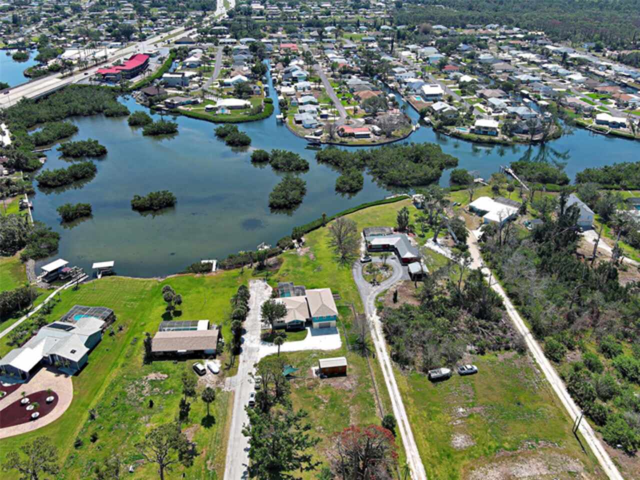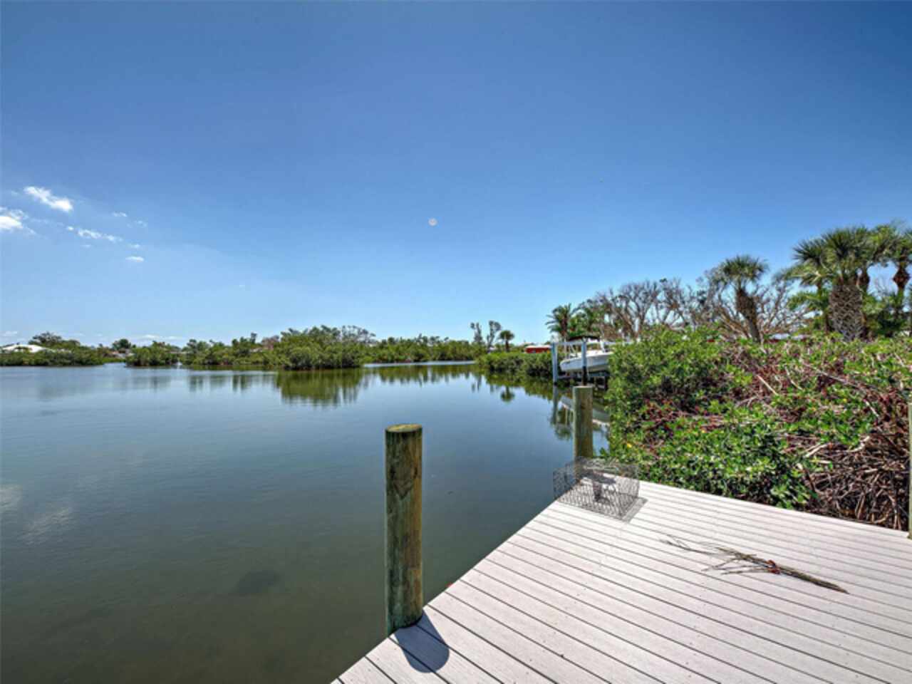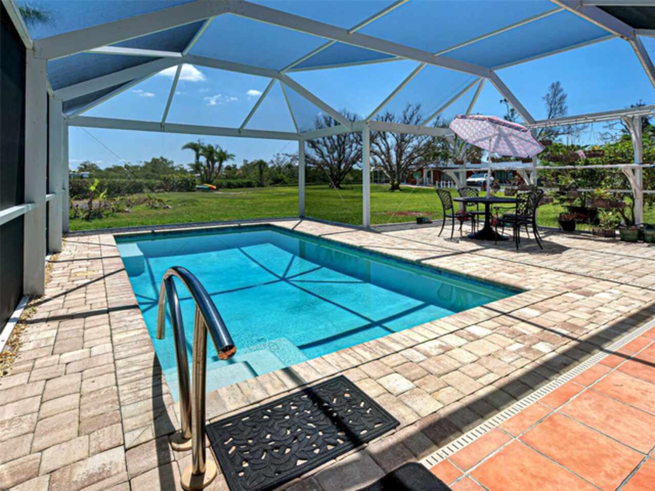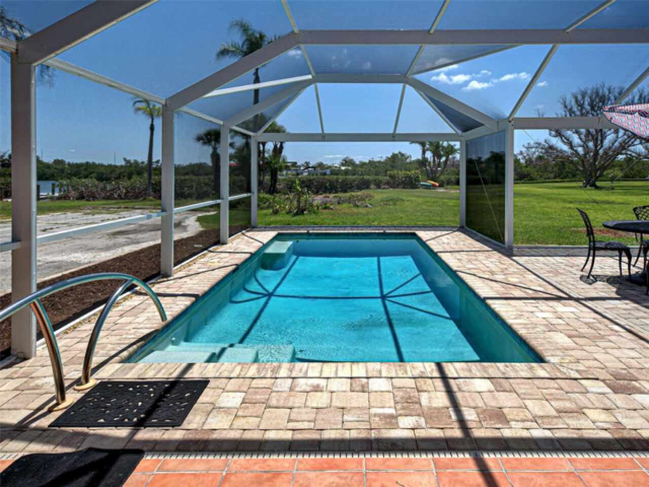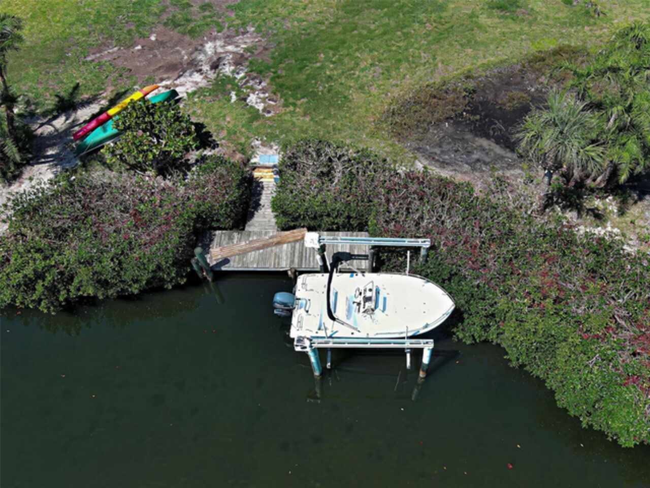 Boater's Paradise!!! Beautifully renovated waterfront home with one bridge to Lemon Bay and easy access to the Gulf at Stump Pass. Dock is equipped with a 6000 lb. Boat Lift and there is a floating dock for canoe/kayak access along the 170 ft. pristine Ainger Creek. This serene 1.08 acres property includes the home and Lots 3, 4 and 5. Lots 1 and two totals .7 acres and are available under a separate agreement. The entire first floor and lanai are artfully tiled and natural stone pavers encircle the pool. This home doubled in size in 2000 with a two story addition including a primary bedroom with a wonderful view of the creek from a private balcony. Also has a sitting area and en suite with a jetted tub. The second level also includes a guest room with bath and laundry room. The sparkling, heated, saltwater pool was added in 2021 and has a Clearview pool cage and a new pump and pool heater this year. Large area on the lanai is wired for a hot tub or perfect for adding an outdoor kitchen. The dining room opens up to the lanai with two sets of French doors. There is a bonus room with plank floor tile and an oversized attached one car garage with plenty of room for storage. The first level also has a guest room. totally remodeled bath, and an office/den with closet which could be a fourth bedroom The beautiful remodeled kitchen has exotic granite countertops, tumbled marble backsplash, hardwood Cherry cabinetry, and all new appliances. Impact windows are installed on all the windows on the second floor and hurricane fabric on the balcony and all windows and doors on the lower level. The roof was re-shingled in 2022. The entire exterior and first level interior was just painted this year The first floor AC unit is new and the main electric service is also new this year. A detached 12x24 garage/workshop was recently built. Dogs can find all the legroom they need in the supersized fenced area accessed through a dog door in the garage. You will love the location of this property near shopping, restaurants , numerous golf courses and just two miles from the beautiful beaches on Manasota Key. Come experience the old Florida charm that this wonderful Englewood home has to offer.