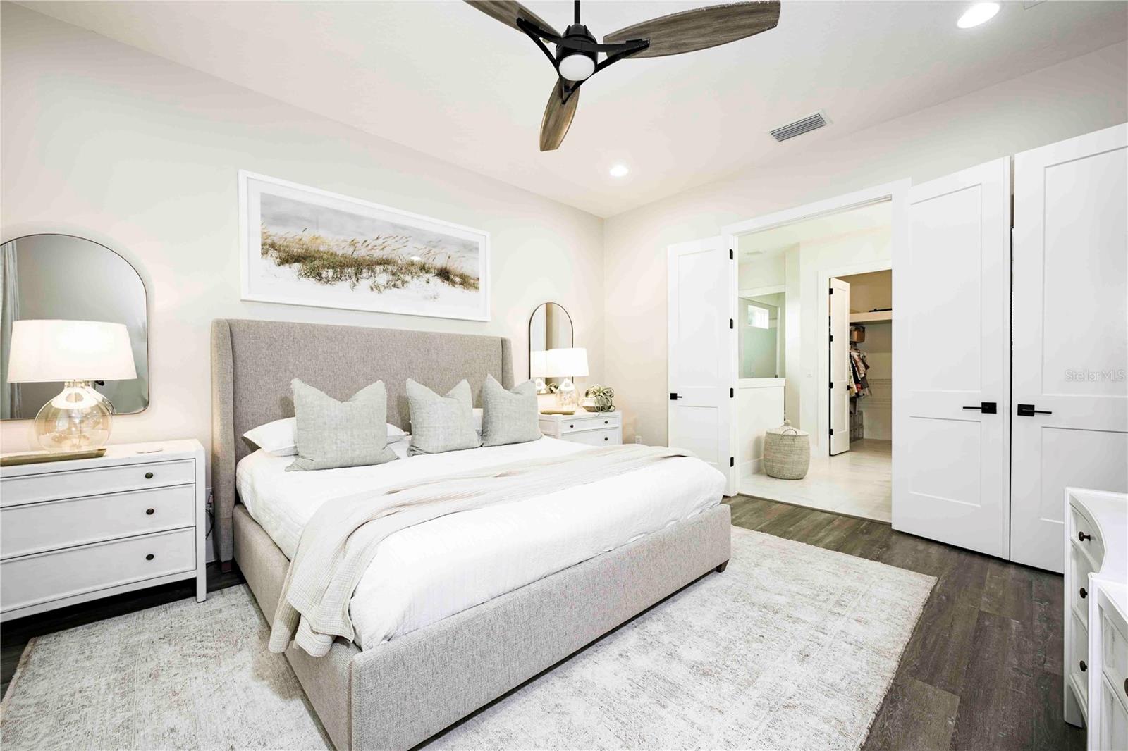 Built-in Features, Ceiling Fans(s), High Ceilings, Open Floorplan, Primary Bedroom Main Floor, Solid Surface Counters, Split Bedroom, Thermostat, Tray Ceiling(s), Walk-In Closet(s), Wet Bar, Window Treatments
