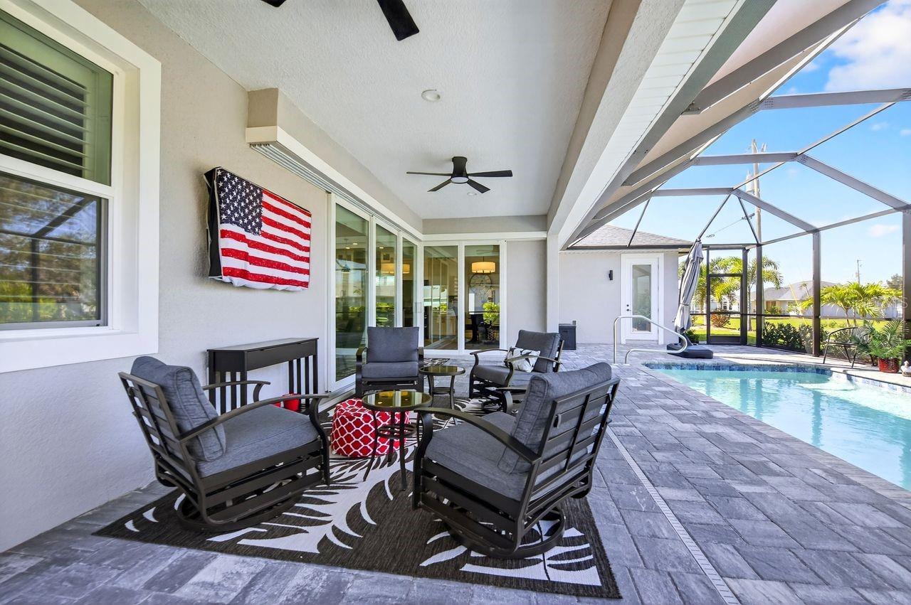 Stunning Contemporary Custom-Built 2024 Home in Punta Gorda with Saltwater Pool & 3-Car Garage. This exquisite home is tucked away on a quiet cul-de-sac in the desirable Burnt Store Village neighborhood. This 3-bedroom, 2-bath residence blends contemporary design with everyday comfort. Set on a beautifully maintained lot, the property offers outstanding curb appeal with stone accents, lush landscaping, and a spacious 3-car garage ideal for vehicles, storage, or hobbies. Inside, the open-concept layout welcomes you with tile flooring throughout the entire home, elegant tray ceilings, plantation shutters on all windows, and abundant natural light. The expansive great room flows seamlessly into the modern kitchen and dining area. A standout feature is the 90-degree sliding pocket doors that disappear completely, creating a stunning indoor–outdoor connection to the lanai and pool area. The chef-inspired kitchen features white shaker cabinetry extending to the ceiling with upper glass accents, stainless steel appliances, a sleek range hood, an oversized quartz center island, modern pendant lighting, and a walk-in pantry. The cozy dining nook, also enhanced with plantation shutters, adds charm and functionality. The split-bedroom design provides privacy, with a spacious primary suite offering a generous walk-in closet and a spa-inspired en-suite bath. Two additional guest bedrooms include tile flooring, ample closet space, and comfortable accommodations for family or visitors. Step outside to your private Florida oasis—a sparkling heated saltwater pool within a screened lanai, complemented by brick paver decking and sun-filtering shades. Whether you're soaking up sunshine, cooling off on warm days, or hosting weekend gatherings, this outdoor space is designed to impress. Residents of Burnt Store Village enjoy beautiful walking paths, a community park, and low annual HOA fees. The location is just minutes from Burnt Store Marina, where you can experience boating, waterfront dining, charters, and unforgettable sunsets over Charlotte Harbor. Outdoor enthusiasts will appreciate close proximity to world-class fishing, golf courses, and scenic nature preserves. A short drive brings you to downtown Punta Gorda, offering charming restaurants, boutique shopping, weekly farmers markets, concerts at Laishley Park, and the popular Harborwalk. Beaches, boat ramps, I-75, and Punta Gorda Airport are all easily accessible, making everyday living and travel incredibly convenient. Whether you're seeking a seasonal retreat or a year-round residence, this move-in-ready home delivers modern finishes, a fantastic layout, and the perfect Florida lifestyle.