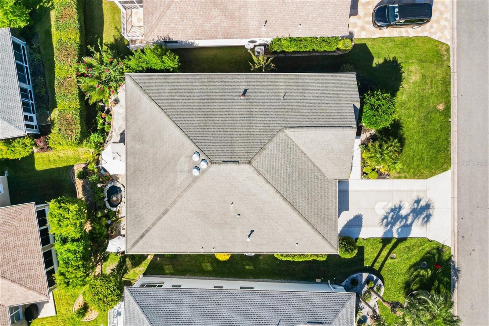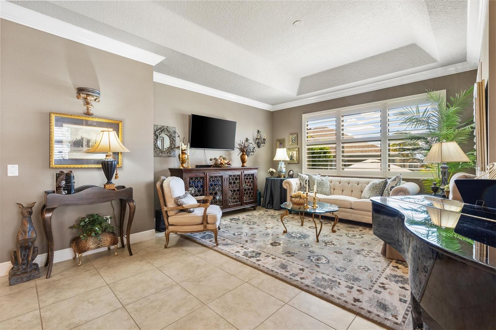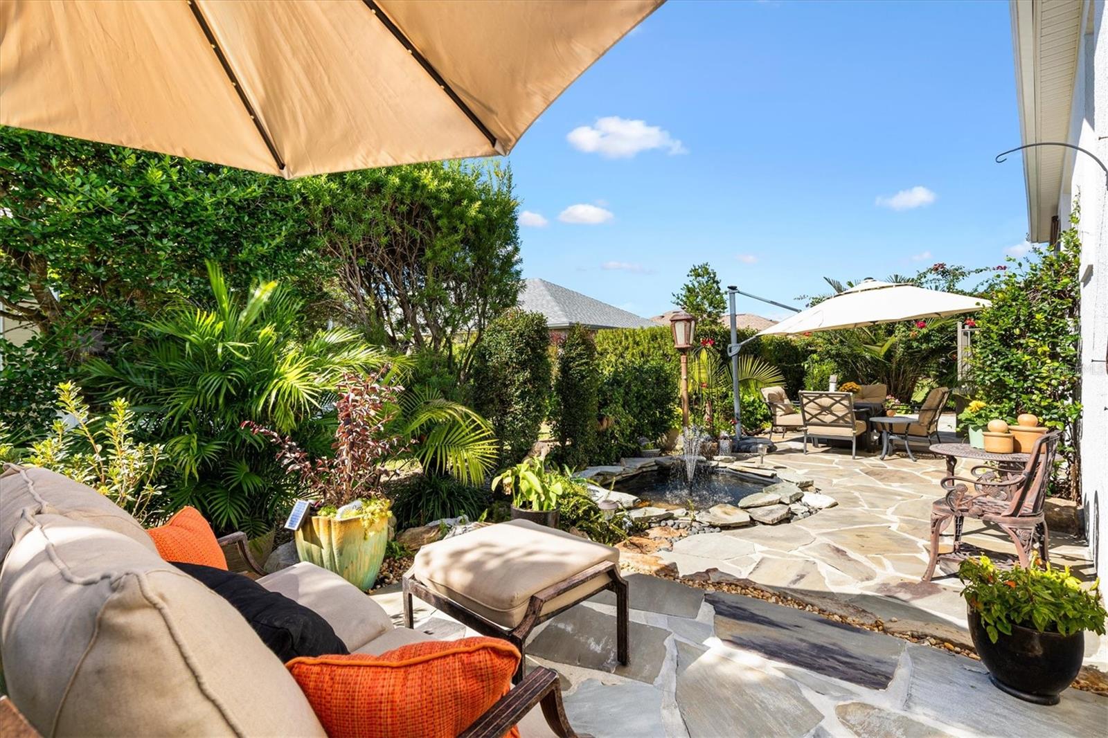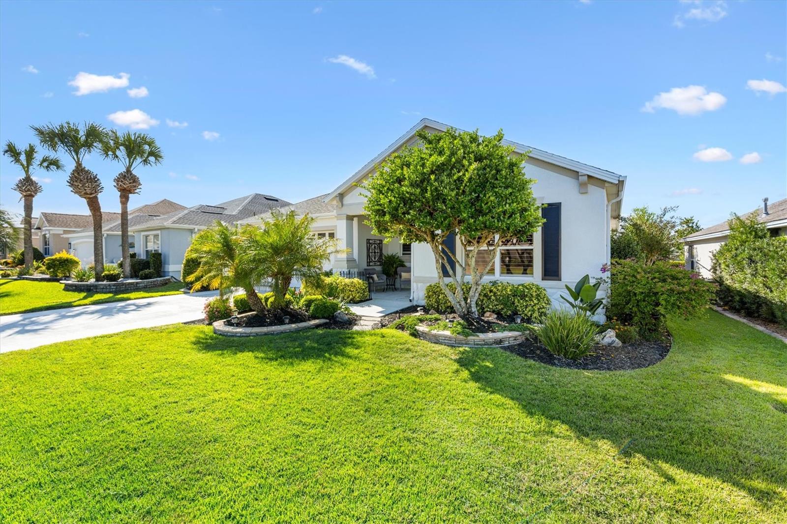 NO BOND! NEW ROOF being installed now! Beautifully maintained and expanded SOMERSET Designer (additional 5’ front & back) offered TURNKEY. Perfectly located between 466 & 466A in the central Village of Mallory, this home showcases a spacious open floor plan with 10’ tray ceilings in the living/dining area and primary suite. The chef’s kitchen has been tastefully updated with new cabinetry, quartz countertops, stainless steel appliances, crown molding, raised breakfast bar, natural gas, closet pantry, pot drawers, and roll-out shelving—ideal for entertaining! The split-bedroom design ensures privacy for guests. The primary suite is generously sized and features a large walk-in closet, dual vanities, Roman shower, and private commode. Two guest bedrooms are roomy—one currently used as an office (no closet)—and the guest bath includes a custom-tiled shower/tub combo. Enjoy 18” tile in the main living and wet areas, new luxury vinyl tile (LVT) in the den and guest bedroom, and carpet in the primary suite. Relax year-round in the “four-season” glass-enclosed, elevated lanai, overlooking mature landscaping, a peaceful fountain, and two serene sitting areas—a private backyard retreat! A must see to appreciate! The oversized garage easily accommodates 2 cars and a golf cart, and includes extra shelving, pull-down attic stairs, and overhead storage. Additional highlights: Inside laundry with utility tub, hand-scraped ceilings, architectural shingles, humidistat, and meticulous maintenance throughout. This home offers the perfect blend of comfort, quality, and Florida lifestyle living in one of The Villages’ most desirable locations!
