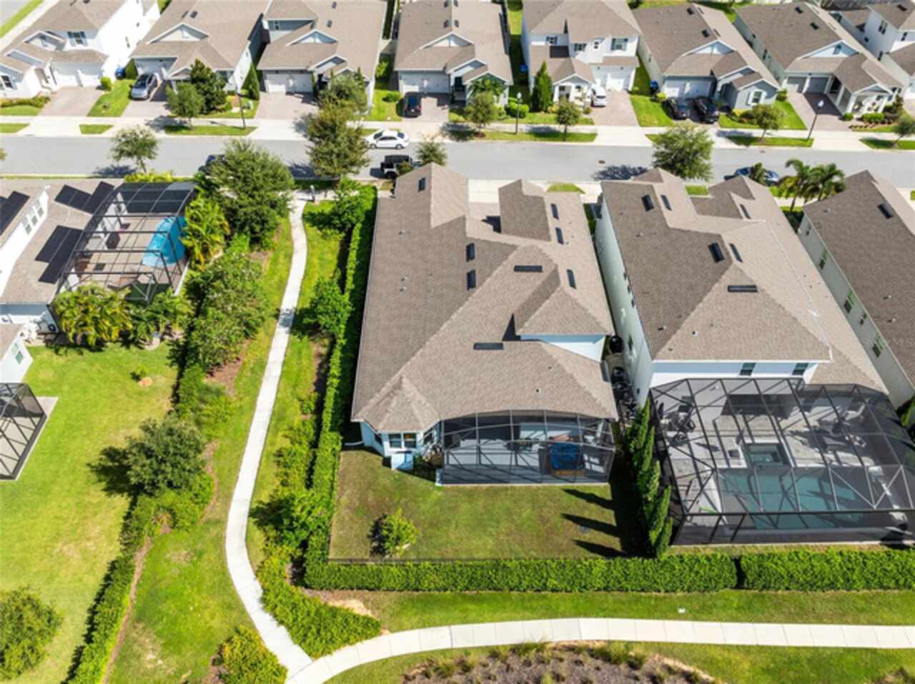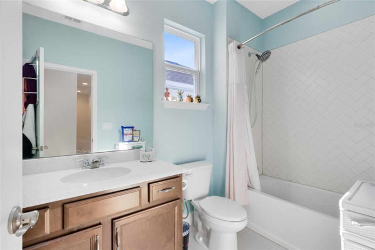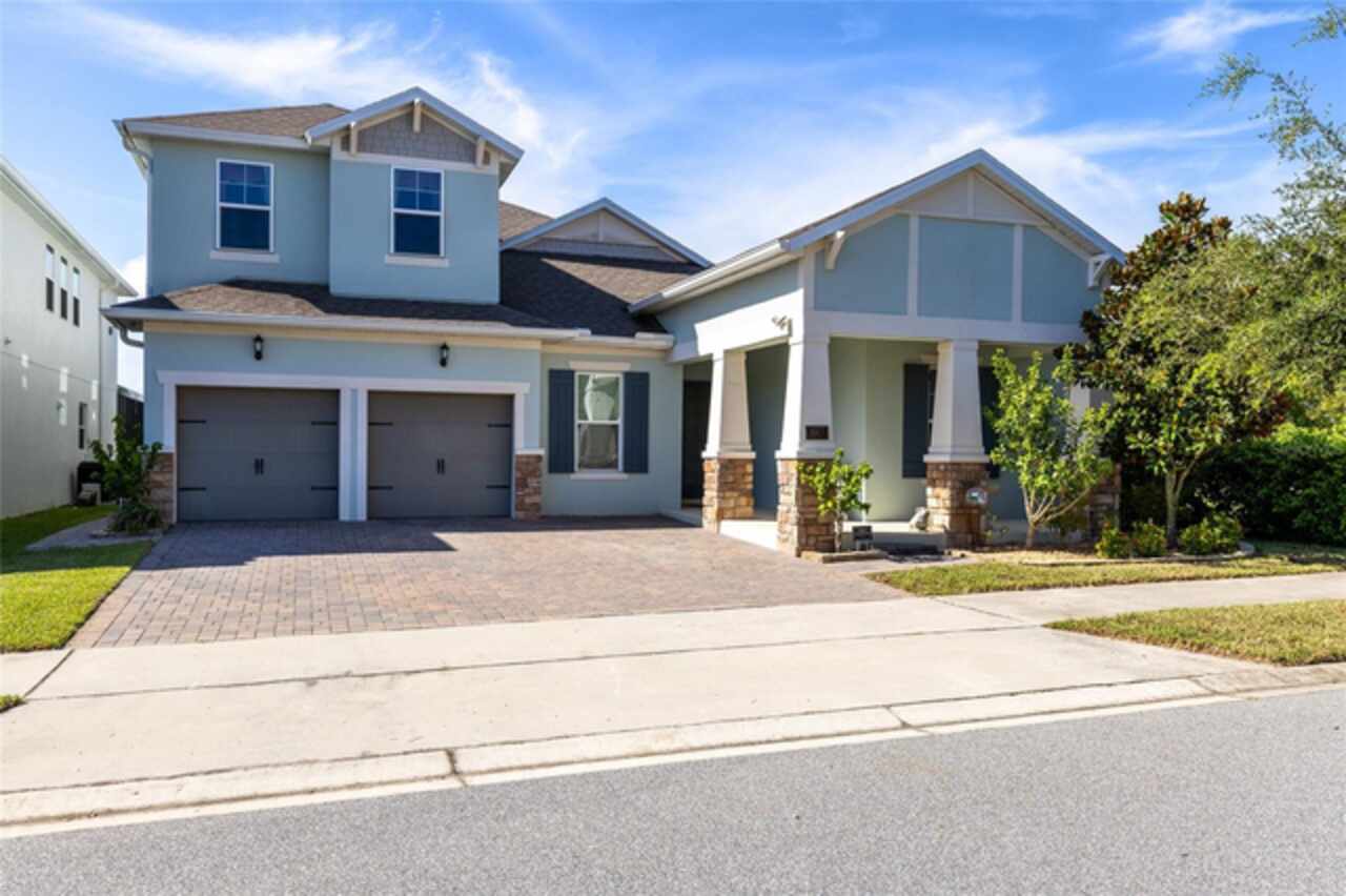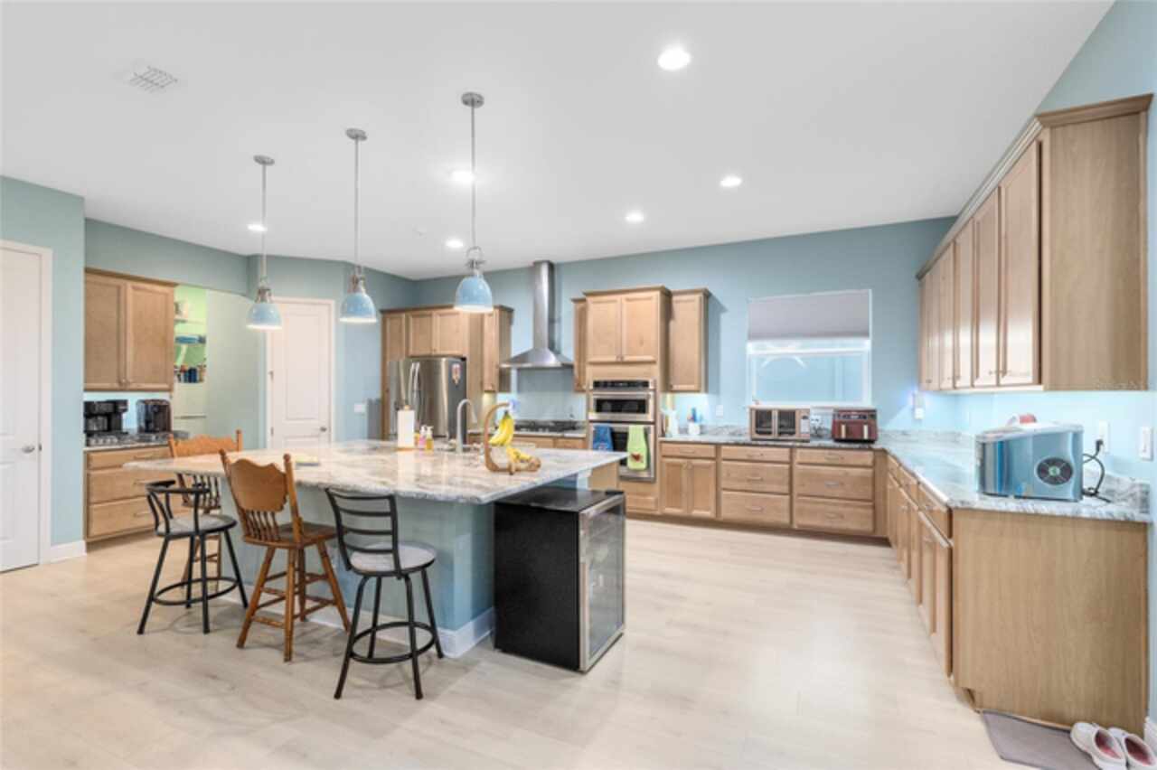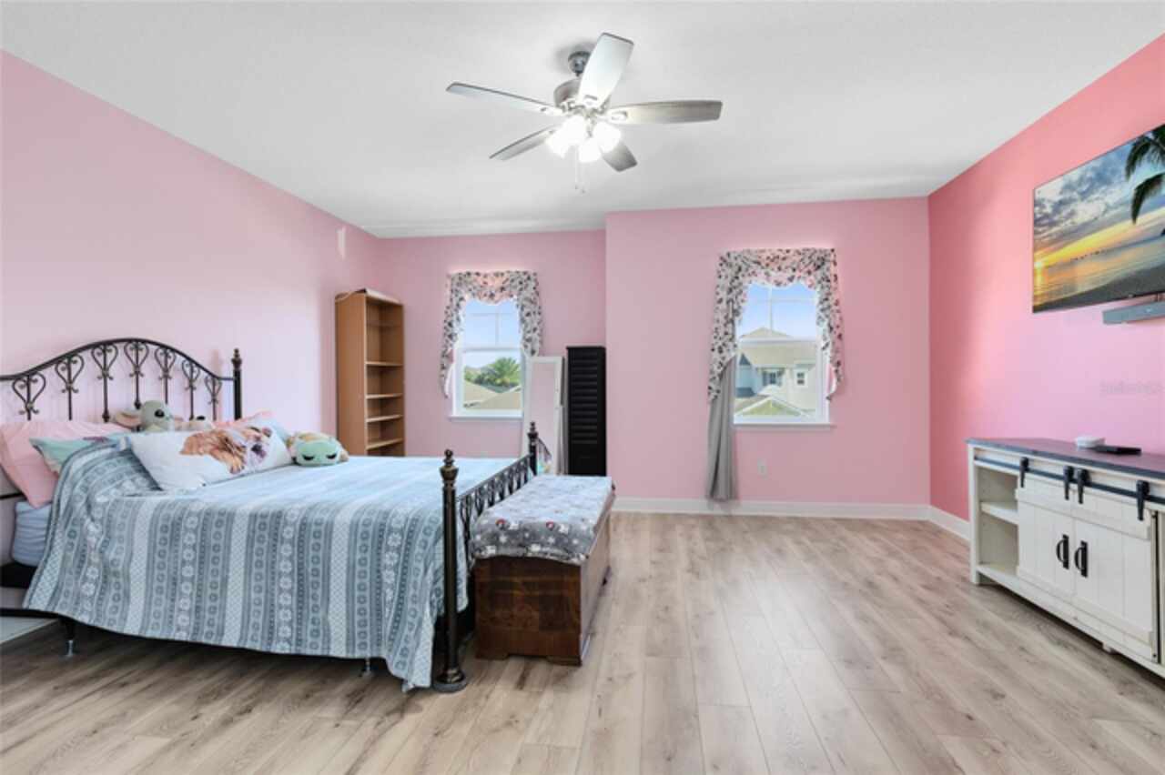 Welcome to this beautifully maintained two-story home blending thoughtful upgrades with inviting indoor and outdoor living spaces. Step inside to find an open layout filled with natural light, where laminate flooring flows throughout the main areas. The living and dining rooms connect seamlessly to the kitchen, which features granite countertops, pendant lighting, abundant cabinetry with an enlarged pantry, and a spacious island with seating. A gas cooktop fueled by a buried propane tank makes the kitchen ideal for both everyday meals and entertaining. The dining area is accented with wainscoting, while a display niche with built-in lighting adds charm and functionality. The primary suite offers a true retreat with a tray ceiling, bay window, and views of the backyard. Its upgraded bath includes an enlarged shower with rain and handheld showerheads, a built-in seat, and a double vanity. Additional bedrooms provide comfort and flexibility, while a large upstairs bonus room creates space for a media area, home office, or playroom. A full guest suite with a private bath on the second floor offers added convenience for visitors or extended stays. Outdoor living is a highlight with a screened lanai featuring professionally applied epoxy flooring, a ceiling fan, and a chlorine hot tub included in the sale. Beyond the lanai, the fenced backyard offers plenty of space to enjoy Florida living, complete with irrigation and open views. From the lanai, you can even watch Disney’s nightly fireworks. The garage is also finished with epoxy flooring and the driveway provides a third parking space for extra convenience. Additional features include a Culligan whole-house and under-sink water filtration system, modified laundry room, ceiling fans, and blinds throughout. Major systems — roof, AC, and water heater — are all just five years old and well maintained. The location is exceptional, just 1.3 miles from Walmart and the Hamlin shopping and dining district, with easy access to local conveniences and major highways. This home combines comfort, thoughtful upgrades, and a prime location, making it move-in ready for its next owners.