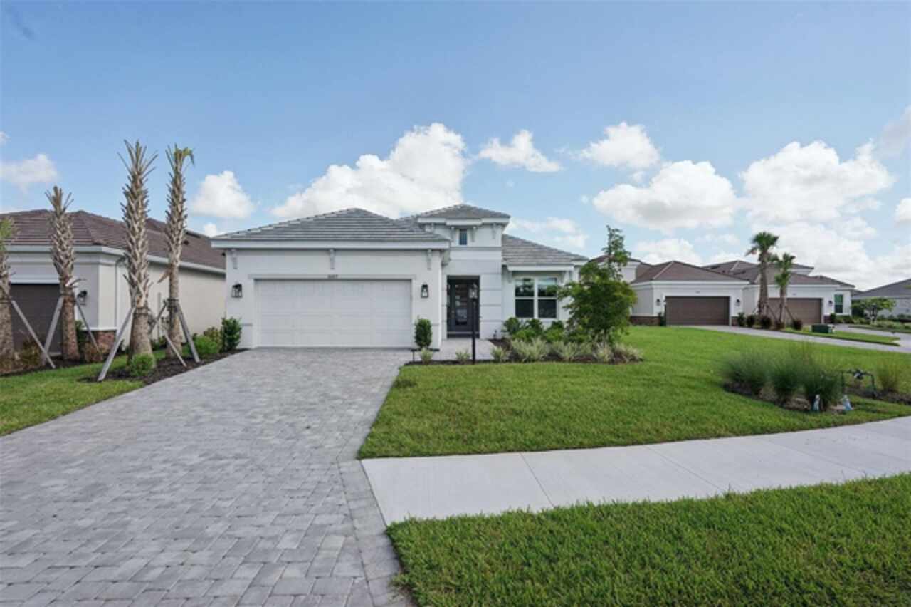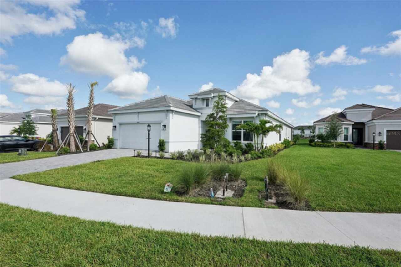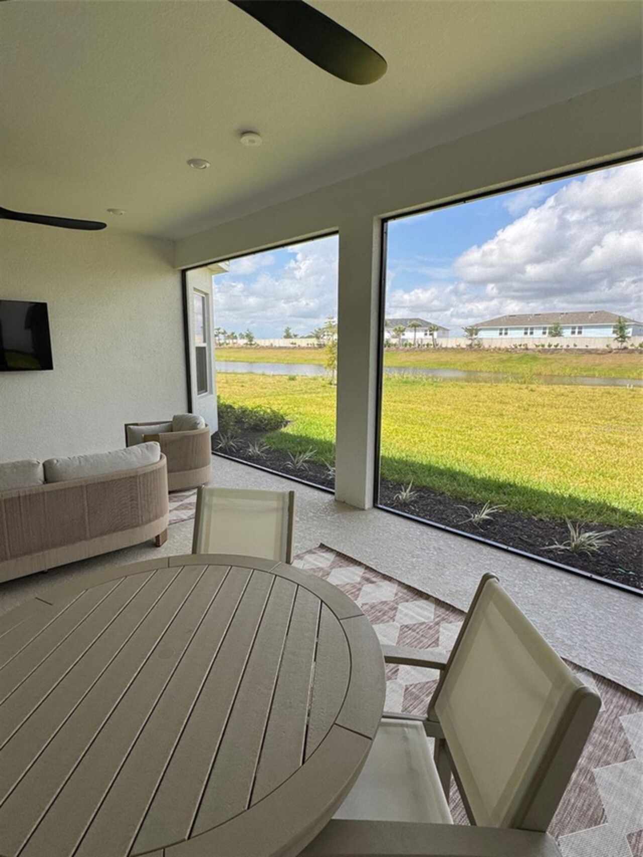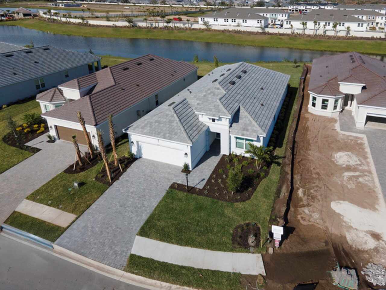 DON'T LOOK AT A WALL. Welcome to your BRAND NEW and upgraded 3-bedroom, 3-bathroom single-family home with a den on a premium lake lot in the sought-after Esplanade at Azario. This stunning residence features a tandem 3-car garage designed with luxury and functionality in mind. While golf is not deeded to the property, independent golf memberships can be obtained at the community's pro shop. Unique features and upgrades include a GOURMET KITCHEN complete with a range hood, gas cooktop, a 56-bottle wine fridge, and 42” soft-close cabinets. The home boasts 10’ tray ceilings with double crown molding, 8’ closet doors, and an extended covered lanai pre-plumbed and pre-wired for outdoor entertaining and a future pool. Additional enhancements include epoxy-coated garage floors, full landscape lighting with pathway, flower bed, palm tree uplighting, and prewiring for front and rear security cameras. Lawn maintenance is included in the HOA fees, offering convenience and peace of mind. Location & Community Features This home offers unparalleled privacy and access to resort-style living, situated in the exclusive gated community of Esplanade at Azario within the Lakewood Ranch. Indulge in various on-site amenities, including a culinary dining experience, casual poolside drinks, and numerous social and wellness activities. Community highlights feature an 18-hole championship golf course (with membership options), a pro shop and bunker bar, an aqua driving range, a full-time activities director, a resort-style pool with a poolside Bahama Bar, a spa/wellness center, and a culinary center with a teaching kitchen. Additional amenities include a state-of-the-art fitness center, clubhouse, 16 pickleball courts, 6 Har-Tru tennis courts, bocce ball courts, walking trails, a dog park, and flexible space for gaming and meetings. This exceptional home and vibrant community provide the perfect blend of luxury, comfort, and active living!