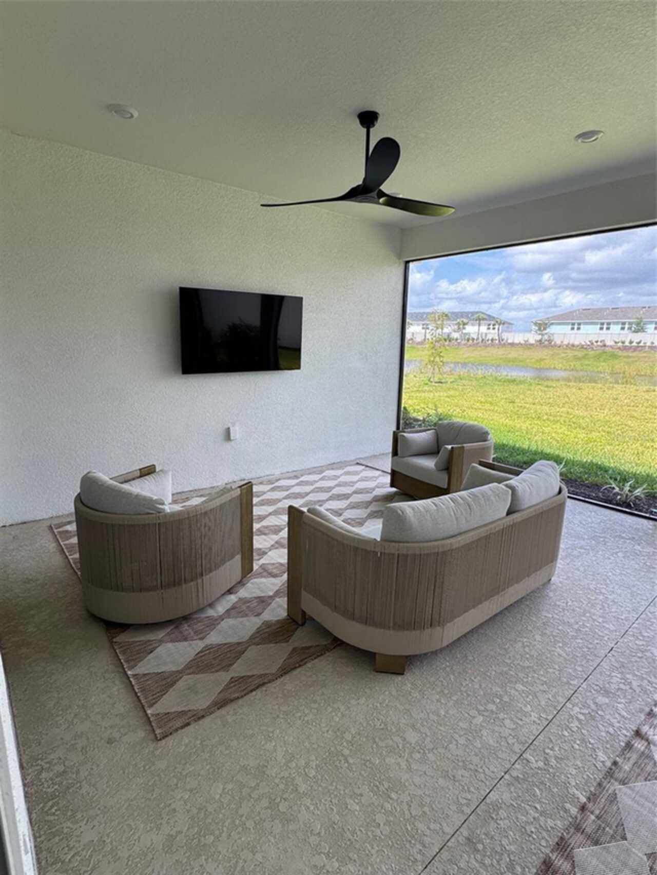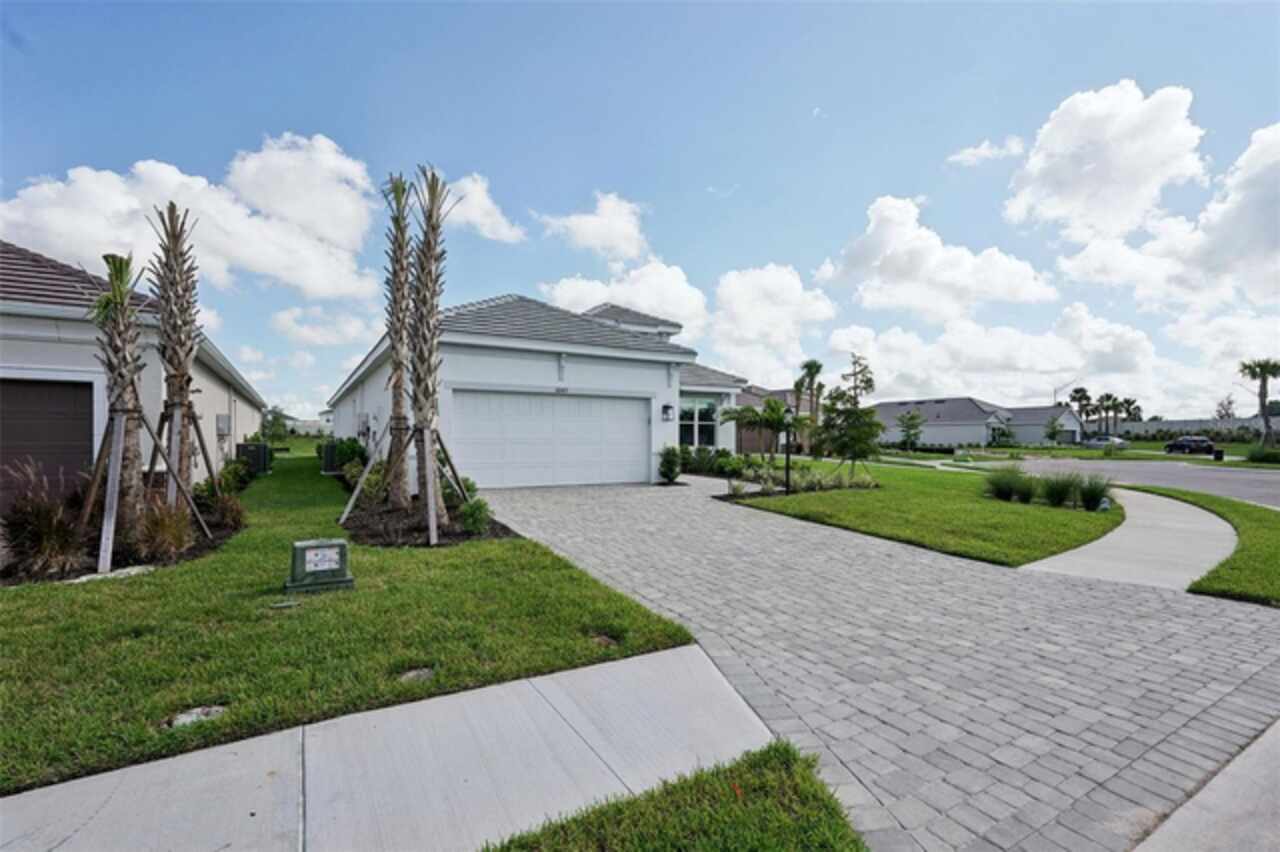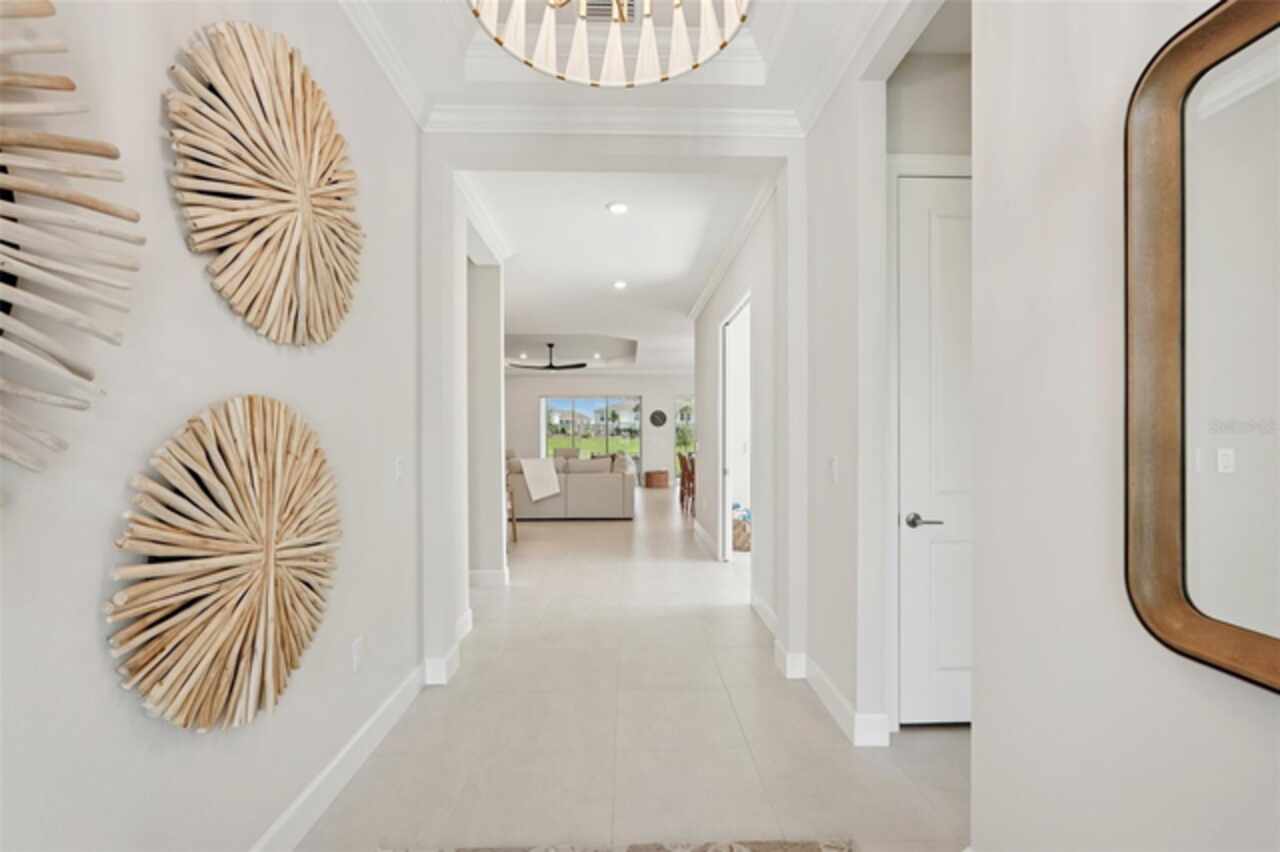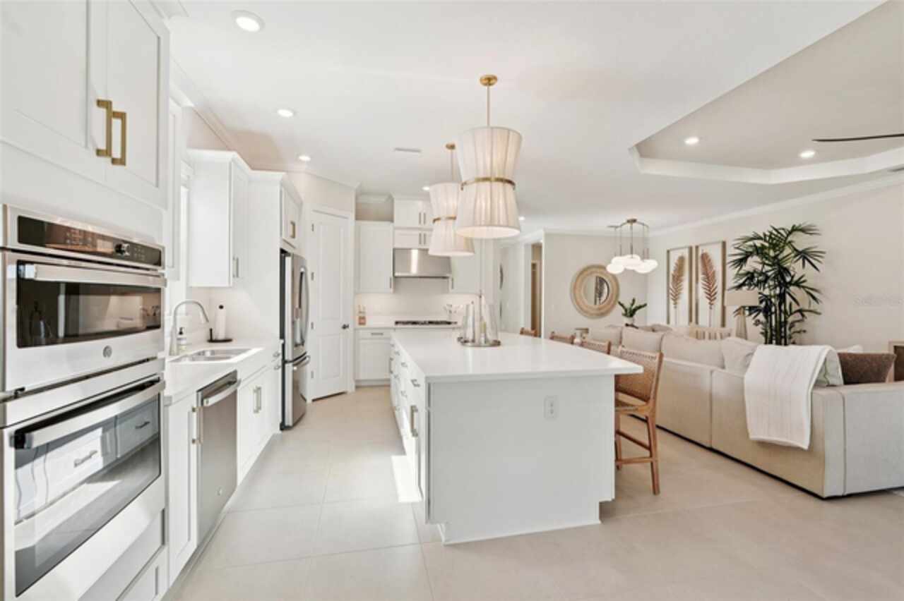 DON'T LOOK AT A WALL. Welcome to your BRAND NEW and upgraded 3-bedroom, 3-bathroom single-family home with a den on a premium lake lot in the sought-after Esplanade at Azario. This stunning residence features a tandem 3-car garage designed with luxury and functionality in mind. While golf is not deeded to the property, independent golf memberships can be obtained at the community's pro shop. Unique features and upgrades include a GOURMET KITCHEN complete with a range hood, gas cooktop, a 56-bottle wine fridge, and 42” soft-close cabinets. The home boasts 10’ tray ceilings with double crown molding, 8’ closet doors, and an extended covered lanai pre-plumbed and pre-wired for outdoor entertaining and a future pool. Additional enhancements include epoxy-coated garage floors, full landscape lighting with pathway, flower bed, palm tree uplighting, and prewiring for front and rear security cameras. Lawn maintenance is included in the HOA fees, offering convenience and peace of mind. Location & Community Features This home offers unparalleled privacy and access to resort-style living, situated in the exclusive gated community of Esplanade at Azario within the Lakewood Ranch. Indulge in various on-site amenities, including a culinary dining experience, casual poolside drinks, and numerous social and wellness activities. Community highlights feature an 18-hole championship golf course (with membership options), a pro shop and bunker bar, an aqua driving range, a full-time activities director, a resort-style pool with a poolside Bahama Bar, a spa/wellness center, and a culinary center with a teaching kitchen. Additional amenities include a state-of-the-art fitness center, clubhouse, 16 pickleball courts, 6 Har-Tru tennis courts, bocce ball courts, walking trails, a dog park, and flexible space for gaming and meetings. This exceptional home and vibrant community provide the perfect blend of luxury, comfort, and active living!