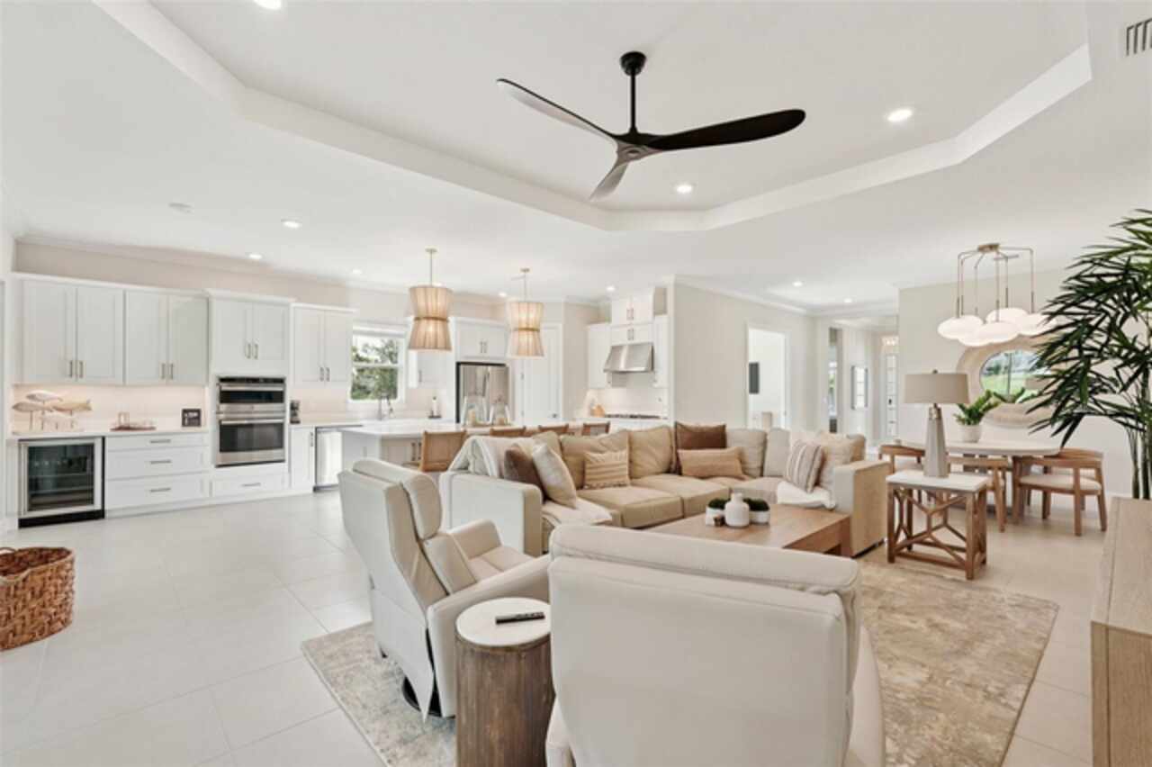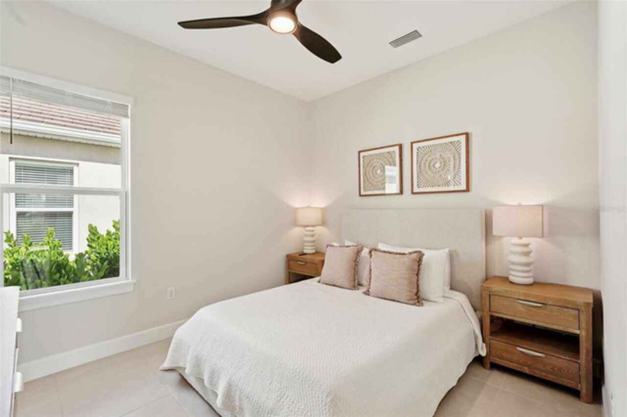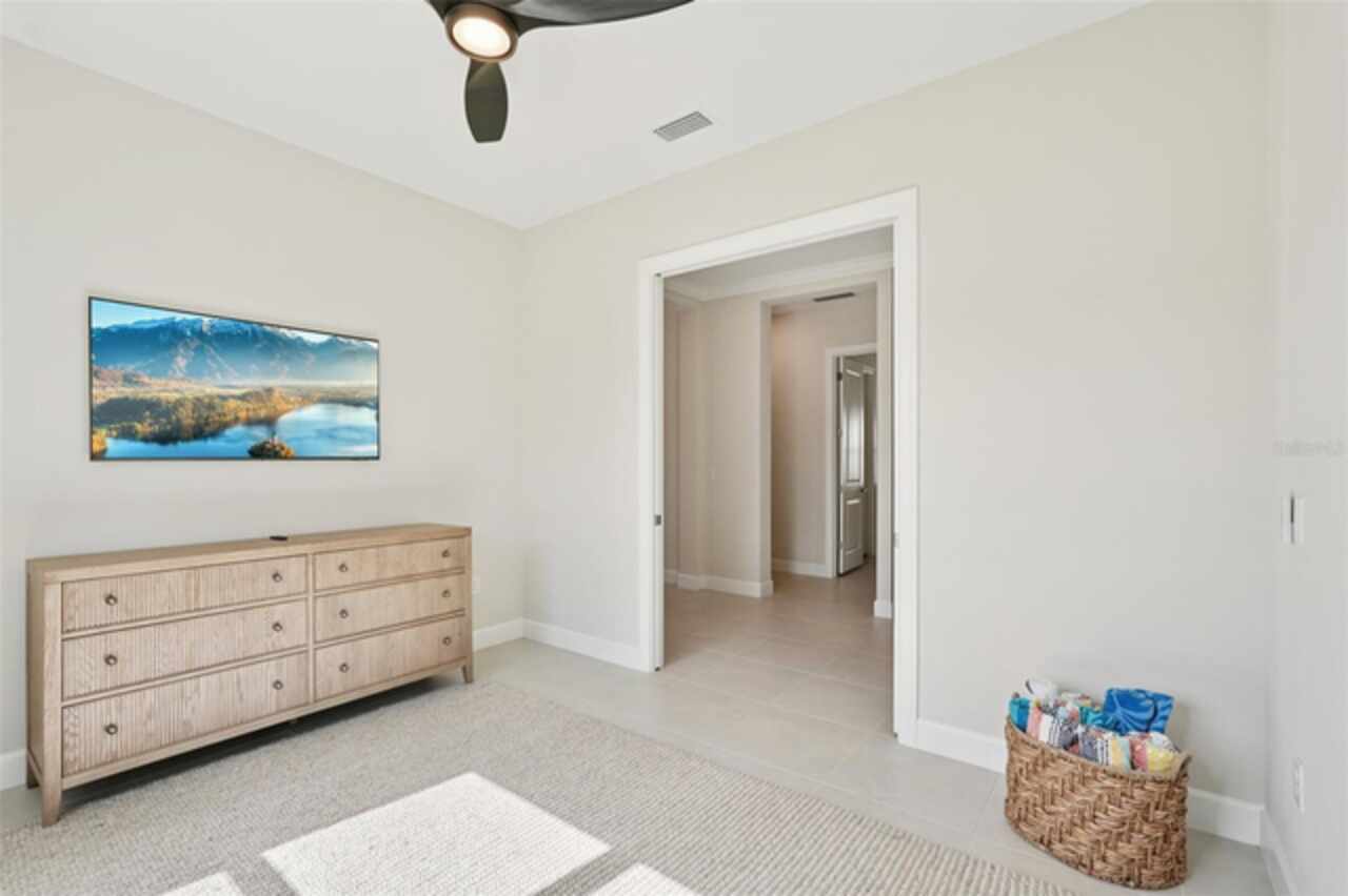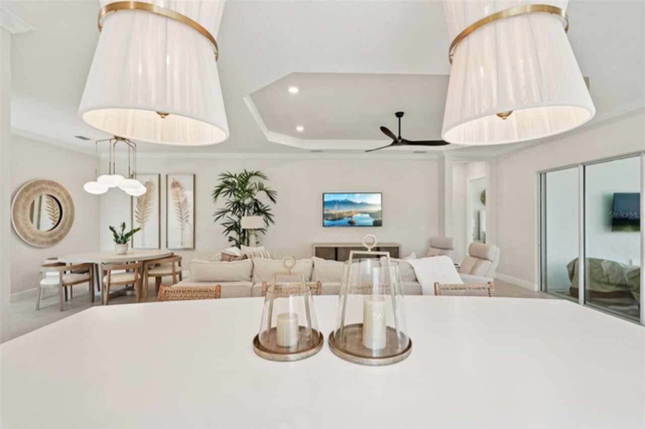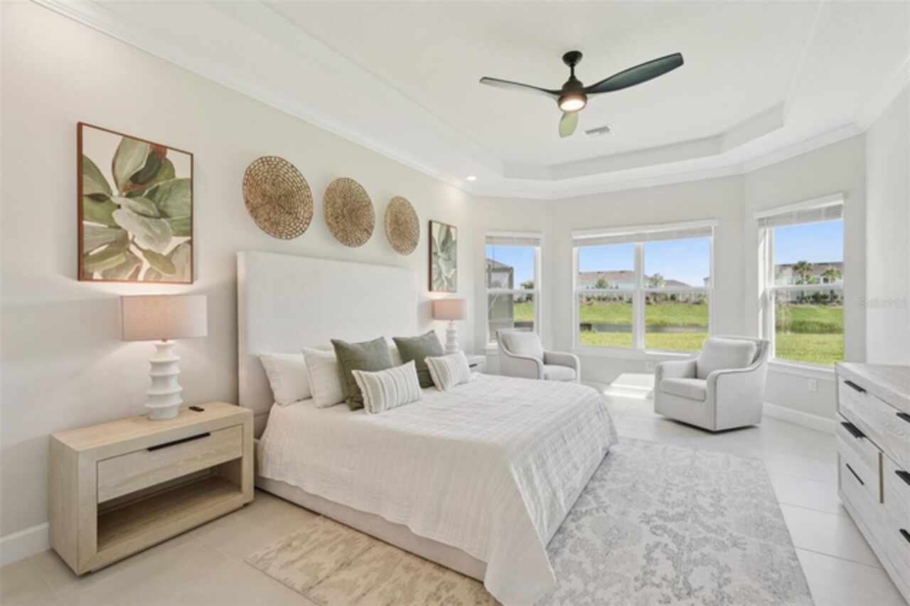 DON'T LOOK AT A WALL. Welcome to your BRAND NEW and upgraded 3-bedroom, 3-bathroom single-family home with a den on a premium lake lot in the sought-after Esplanade at Azario. This stunning residence features a tandem 3-car garage designed with luxury and functionality in mind. While golf is not deeded to the property, independent golf memberships can be obtained at the community's pro shop. Unique features and upgrades include a GOURMET KITCHEN complete with a range hood, gas cooktop, a 56-bottle wine fridge, and 42” soft-close cabinets. The home boasts 10’ tray ceilings with double crown molding, 8’ closet doors, and an extended covered lanai pre-plumbed and pre-wired for outdoor entertaining and a future pool. Additional enhancements include epoxy-coated garage floors, full landscape lighting with pathway, flower bed, palm tree uplighting, and prewiring for front and rear security cameras. Lawn maintenance is included in the HOA fees, offering convenience and peace of mind. Location & Community Features This home offers unparalleled privacy and access to resort-style living, situated in the exclusive gated community of Esplanade at Azario within the Lakewood Ranch. Indulge in various on-site amenities, including a culinary dining experience, casual poolside drinks, and numerous social and wellness activities. Community highlights feature an 18-hole championship golf course (with membership options), a pro shop and bunker bar, an aqua driving range, a full-time activities director, a resort-style pool with a poolside Bahama Bar, a spa/wellness center, and a culinary center with a teaching kitchen. Additional amenities include a state-of-the-art fitness center, clubhouse, 16 pickleball courts, 6 Har-Tru tennis courts, bocce ball courts, walking trails, a dog park, and flexible space for gaming and meetings. This exceptional home and vibrant community provide the perfect blend of luxury, comfort, and active living!