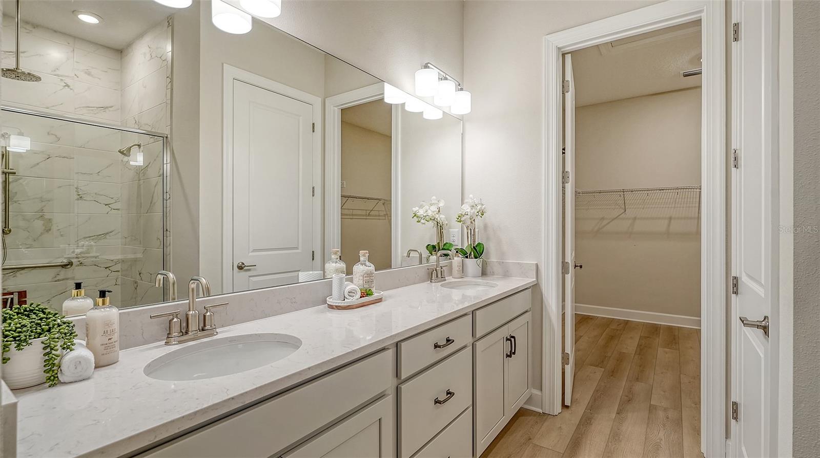Discover resort-style living at its finest in this fully loaded 3-bedroom, 3-bath plus office Lazio floor plan, located in the highly sought-after Esplanade at Azario in Lakewood Ranch. This exceptional, non-golf deeded home showcases impact glass windows and doors, designer finishes, and a stunning water view that sets the tone for luxury and relaxation. Step inside and experience effortless elegance with tray ceilings, crown molding, luxury vinyl plank flooring throughout, and an abundance of natural light. The gourmet kitchen is a chef’s dream, featuring Quartz countertops, a large center island, GE Monogram stainless appliances including a gas cooktop and range hood, wall-mounted oven and microwave, extended cabinetry with wine refrigerator, soft-close drawers, tile backsplash, and a spacious walk-in pantry. The open-concept great room flows seamlessly to the covered lanai with a heated saltwater pool and spa and a fully equipped outdoor kitchen, creating the perfect space for entertaining or quiet evenings watching the sunset. The primary suite is a true retreat, offering peaceful water views, a spacious walk-in closet, and a luxurious en-suite bath featuring a large walk-in shower with frameless glass, dual sink vanity, quartz countertops, and beautiful tile extending to the ceiling. Designed for modern living, the home also includes a laundry room with utility sink and cabinetry, epoxy garage flooring, glass front door with sidelights, and a tandem 3rd bay garage. Exterior enhancements include landscape lighting and bay window extensions that elevate the home’s curb appeal and livability. Located within Esplanade at Azario, residents enjoy world-class amenities—a resort-style pool and Bahama bar, full-service spa, state-of-the-art fitness center, sports courts, culinary center with teaching kitchen, on-site dining, and a full-time lifestyle director. Additional offerings include pickleball, tennis, bocce, walking trails, a dog park, community garden, and fire pit—all just minutes from Lakewood Ranch’s premier shopping, dining, and Gulf Coast beaches. This home offers the perfect blend of luxury, privacy, and low-maintenance living. Schedule your private showing today and experience the Esplanade lifestyle!