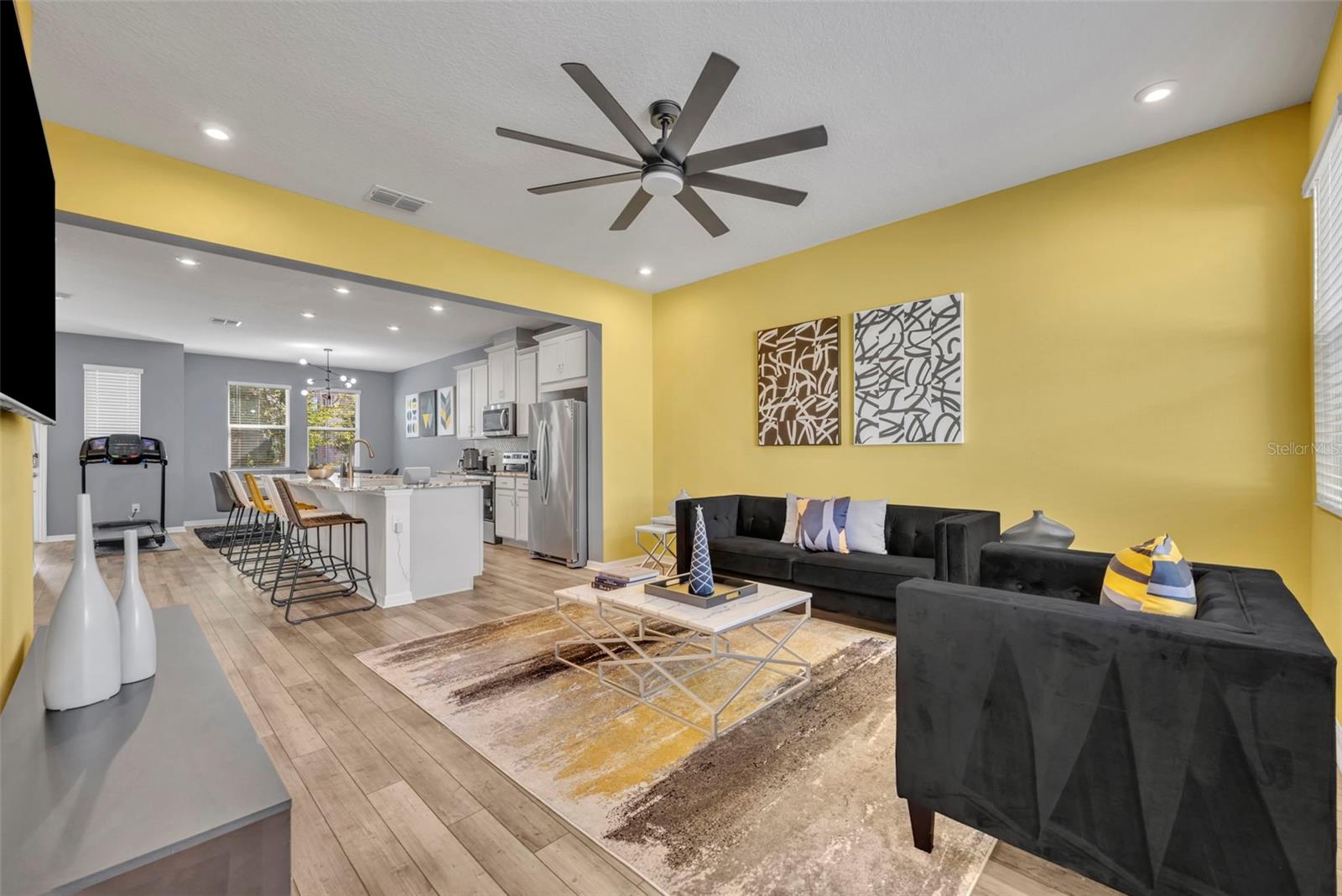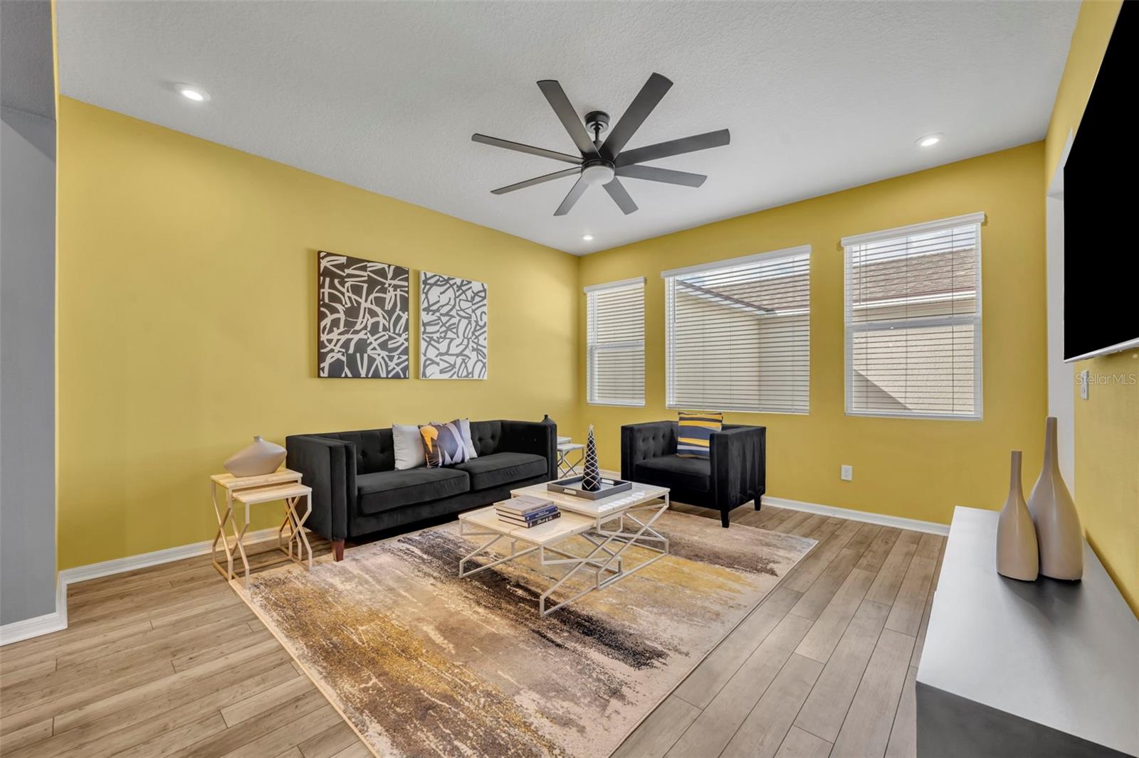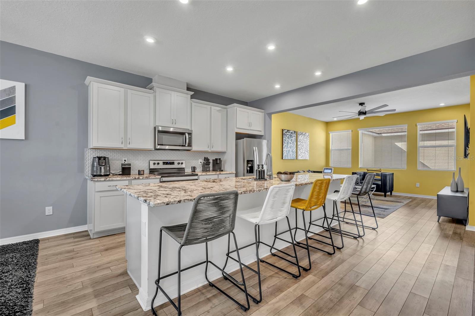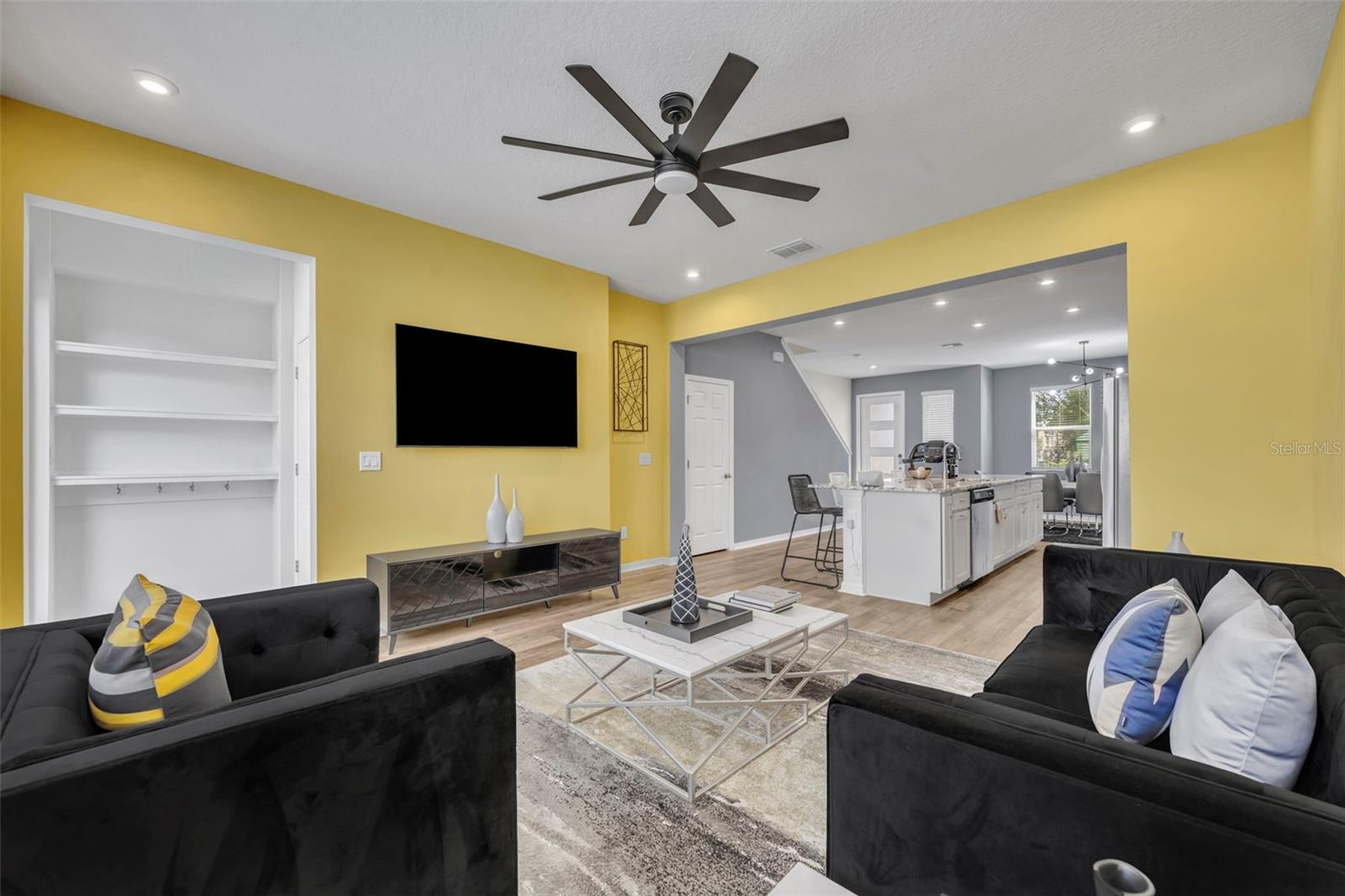 Ceiling Fans(s), High Ceilings, Kitchen/Family Room Combo, Open Floorplan, PrimaryBedroom Upstairs, Solid Wood Cabinets, Stone Counters, Thermostat, Walk-In Closet(s), Window Treatments