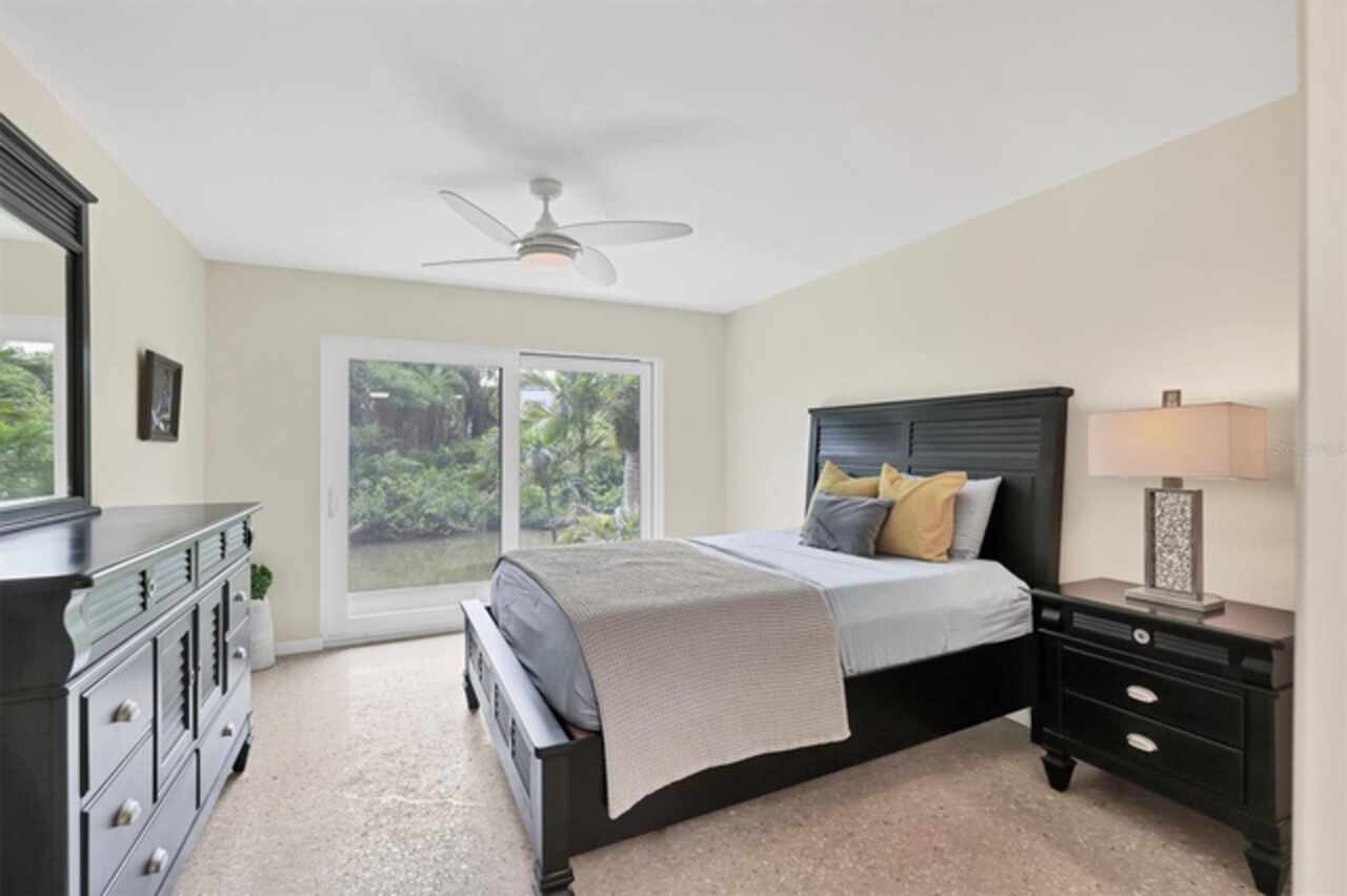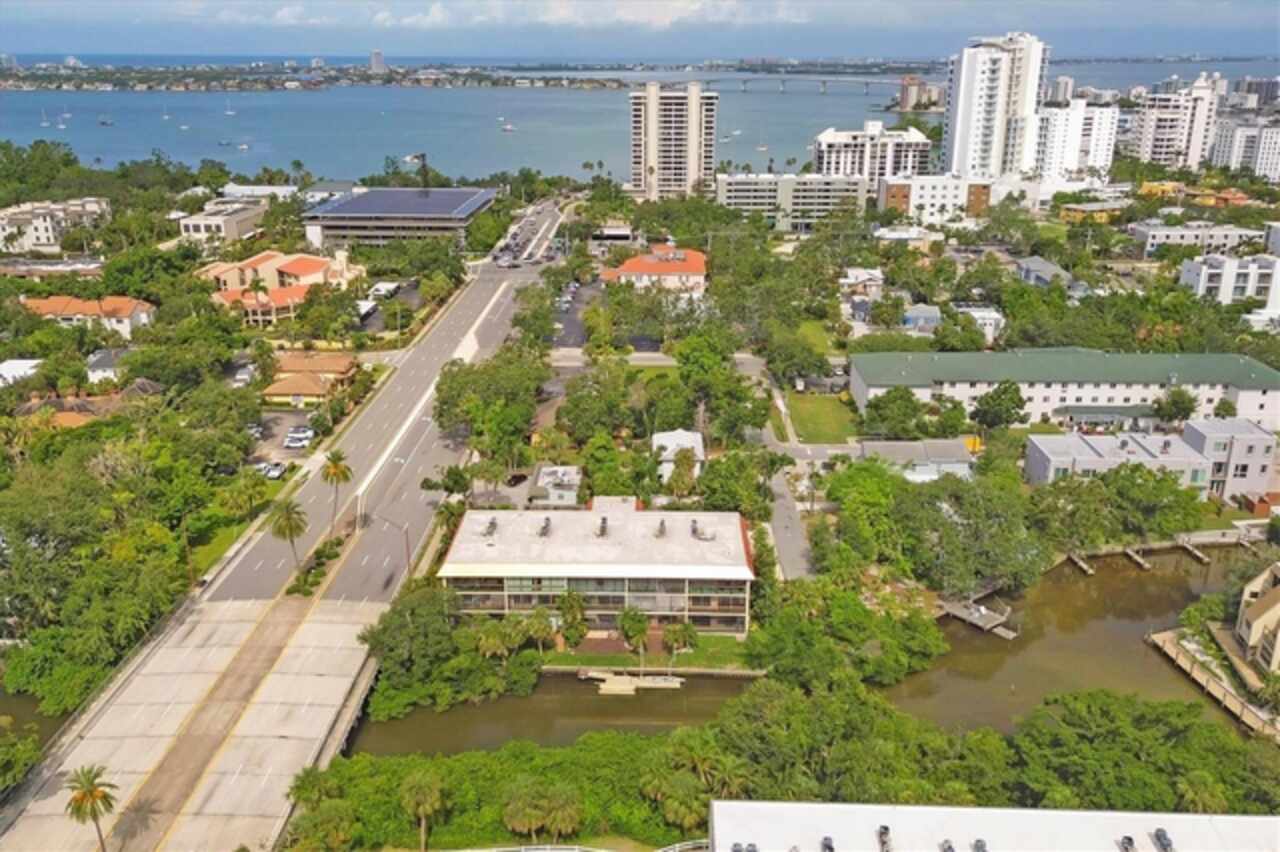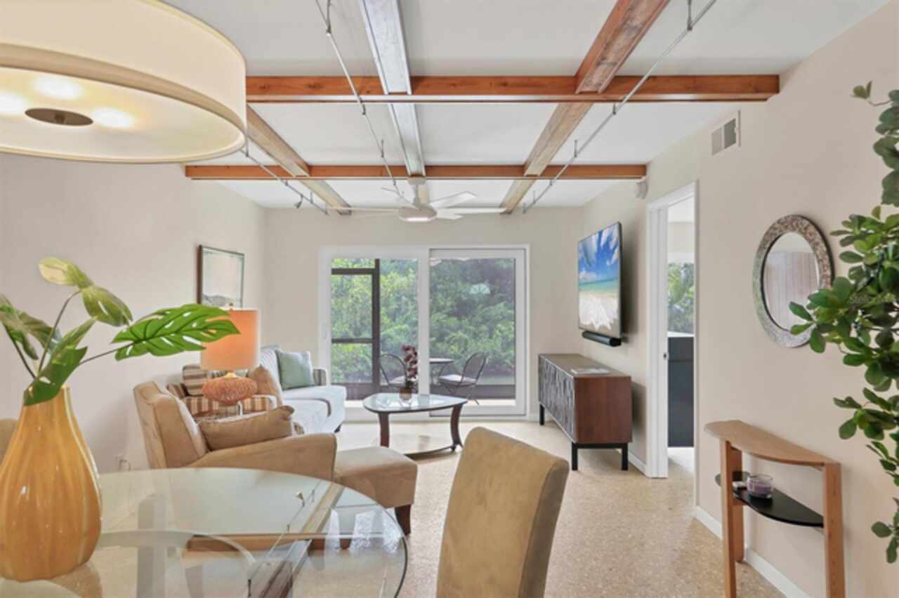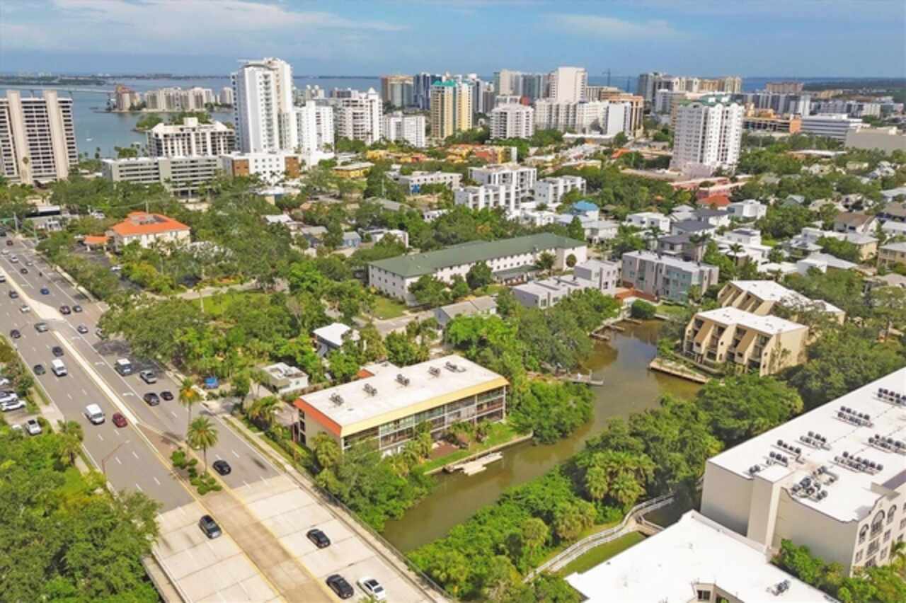 Waterfront and move-in ready, this beautifully updated first-floor condo offers effortless living in one of downtown Sarasota’s hidden gems – Bayou House. Perfectly situated in the heart of the city, yet tucked away on the tranquil Hudson Bayou, this 2-bedroom, 2-bath residence blends modern style with low-maintenance convenience in a prime walkable location. Polished concrete floors, impact windows and sliders, LED ceiling fans and lights, plus an open-concept layout create a clean, modern aesthetic throughout (all updated since 2020). The spacious great room features a wood-beam ceiling detail, sleek track lighting, and large sliders that open to a covered, screened lanai with full-view screen to enjoy calm bayou waters and lush, shaded banks. Fully equipped updated kitchen with soft-close cabinetry, butcher block countertops, subway tile backsplash, LG stainless steel appliances, under-cabinet lighting, and a center island. The primary suite includes direct lanai access, walk-in closet with built-ins, and a stylish ensuite bath with a floor-to-ceiling tiled shower, frameless glass enclosure, and granite countertop vanity. A second bedroom and updated bath provide comfortable space for guests or a home office. Bonus: in-unit Bosch washer and dryer. Bayou House offers assigned parking plus guest parking space, on-site storage, and a private community dock – ideal for launching a paddleboard or kayak right into the Bayou, just strokes from Sarasota Bay. HOA fees include water, trash, sewer, cable, landscaping, and flood insurance for true lock-and-leave ease. Whether you're looking for a full-time residence or a vacation escape, all of downtown Sarasota is at your doorstep. Walk to Selby Gardens, the Bayfront, Marina Jack, Burns Court, galleries, boutique shopping, fine dining, and cozy cafes. Just minutes to Lido Beach, St. Armands Circle and Siesta Key. First-floor, no-step living in the heart of Sarasota, this is Florida waterfront living at its best.