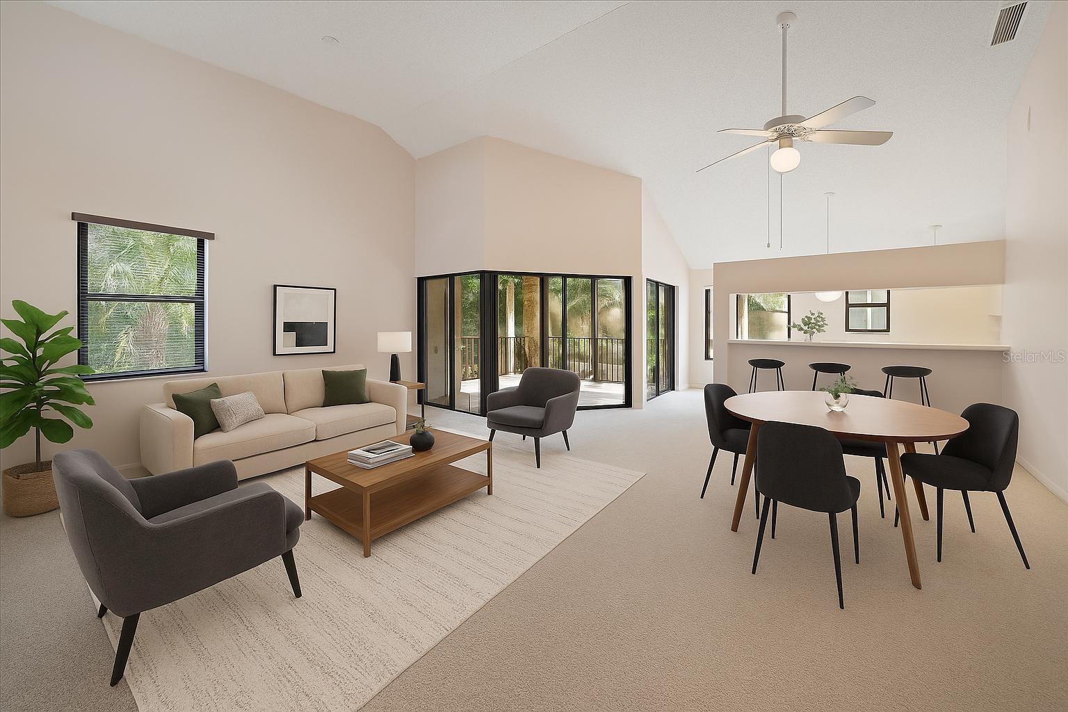 One or more photo(s) has been virtually staged. Discover the perfect blend of space, comfort, and opportunity in this desirable three-bedroom, two-bath end-unit condominium located in the highly sought-after gated community of The Landings. Enter through the welcoming first-level foyer and ascend to the light-filled main living area, where vaulted 13-foot ceilings create an airy, open ambiance. With approximately 1, 775 square feet of living space, this residence offers a well-designed split floor plan that ensures privacy while maintaining an effortless flow for everyday living and entertaining. The living and dining areas seamlessly connect to the kitchen, complete with a convenient pass-through bar—perfect for hosting gatherings or casual dining. The spacious primary suite serves as a relaxing retreat, featuring a large walk-in closet and an oversized ensuite bath with dual sinks and a spa-inspired shower. Two inviting guest bedrooms provide comfortable accommodations for family or visitors. Enjoy peaceful moments on the screened lanai, surrounded by lush natural scenery, or take advantage of the attached one-car garage for added convenience. As a resident, you’ll have access to The Landings Racquet Club, offering 8 Har-Tru tennis courts, pickleball, a heated swimming pool and spa, fitness center, meeting rooms, and a library—the perfect extension of your home and lifestyle. Set within a secure, 24-hour guard-gated community, The Landings is renowned for its scenic walking trails, lush tropical setting, and direct access to Sarasota Bay. Ideally situated near top-rated schools, world-class dining, shopping, arts, and the beautiful Gulf Coast beaches, this community embodies Sarasota living at its finest.