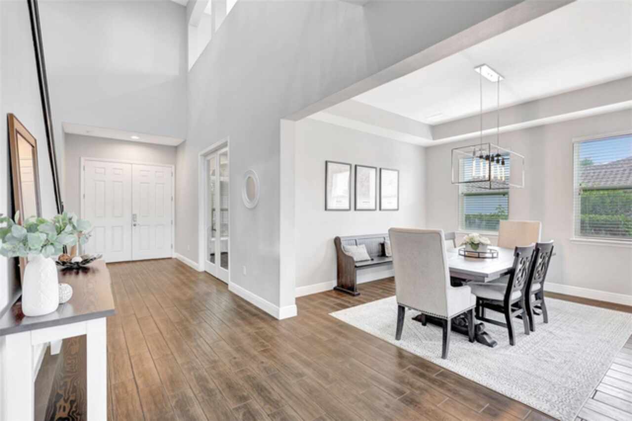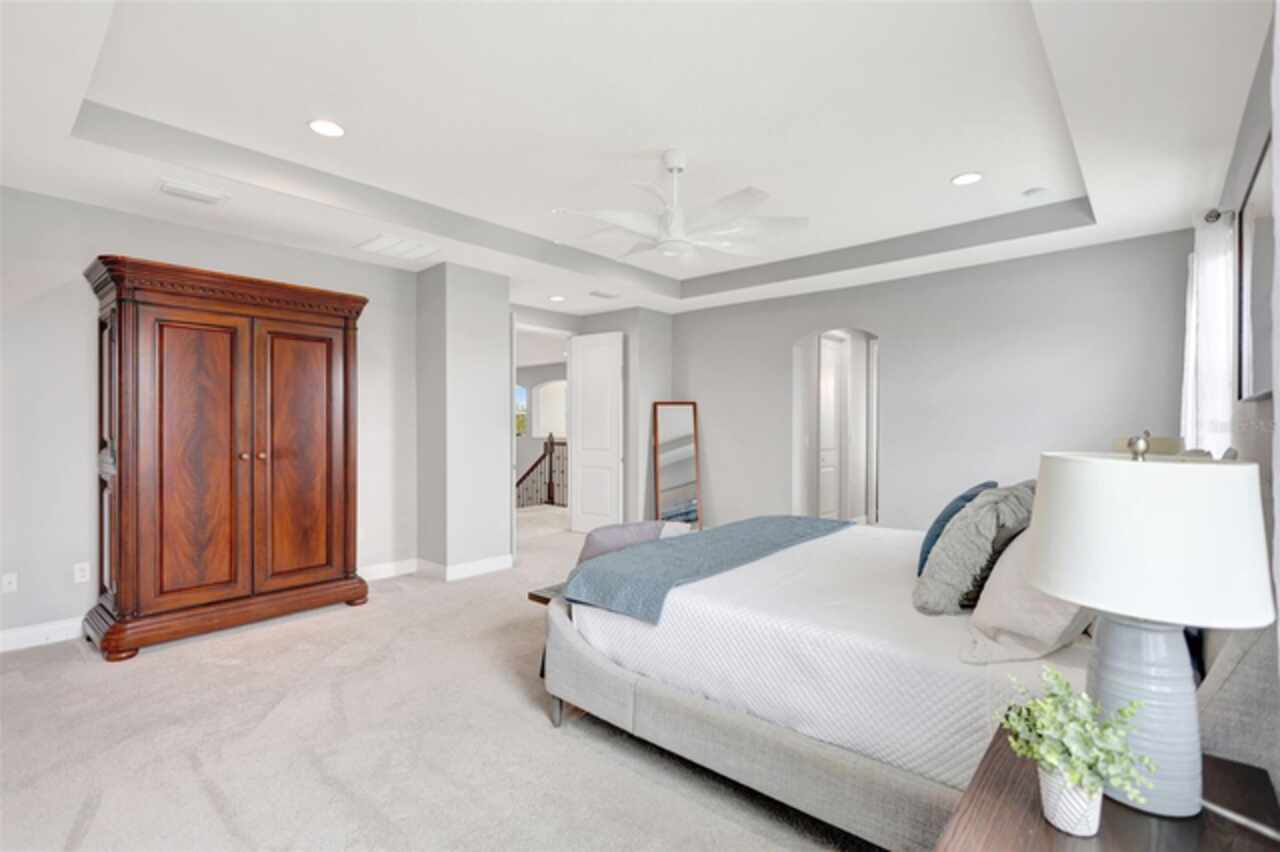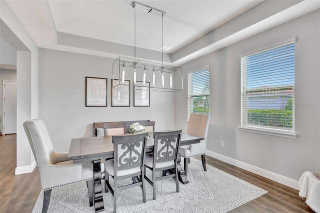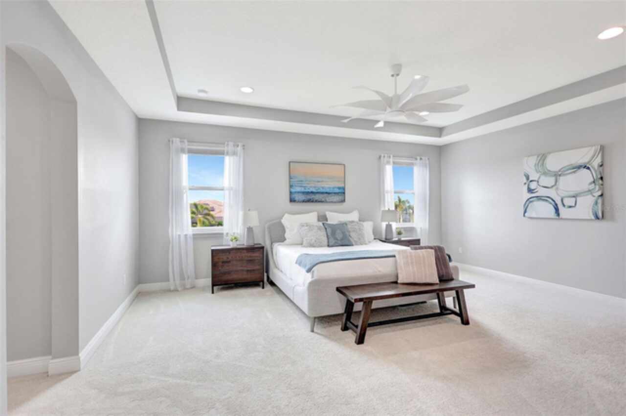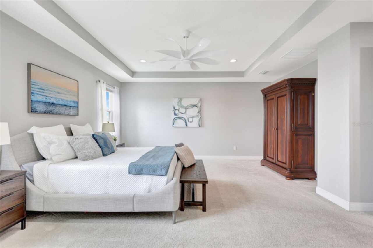 Eat-in Kitchen, High Ceilings, Open Floorplan, PrimaryBedroom Upstairs, Solid Wood Cabinets, Split Bedroom, Stone Counters, Tray Ceiling(s), Walk-In Closet(s), Window Treatments