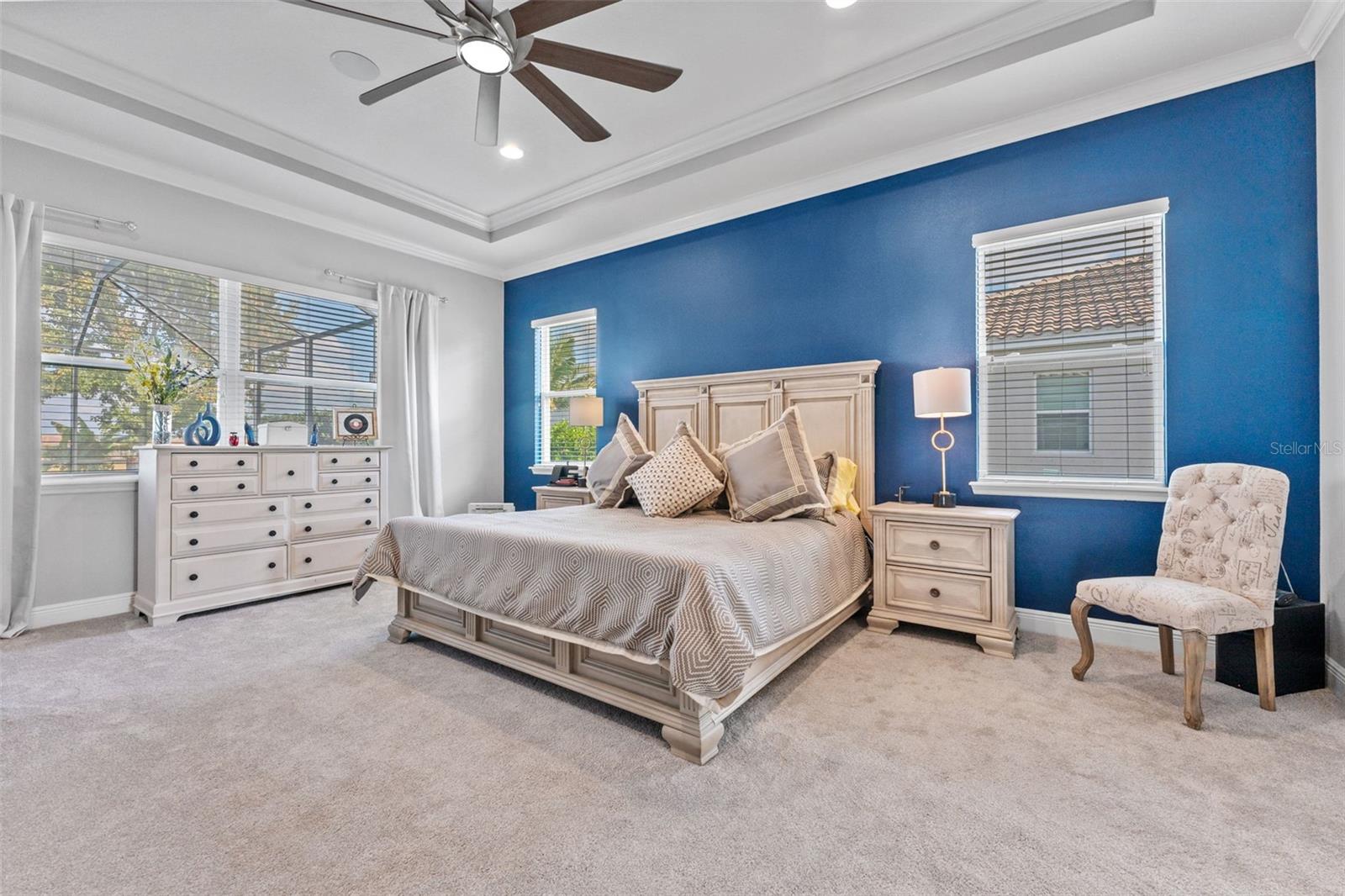 Crown Molding, Eat-in Kitchen, Kitchen/Family Room Combo, Primary Bedroom Main Floor, Solid Surface Counters, Solid Wood Cabinets, Split Bedroom, Thermostat, Tray Ceiling(s), Walk-In Closet(s), Window Treatments