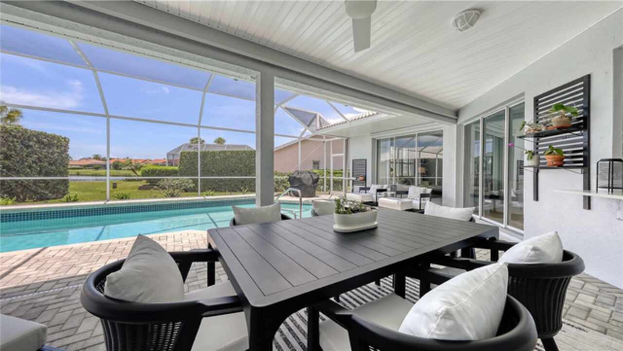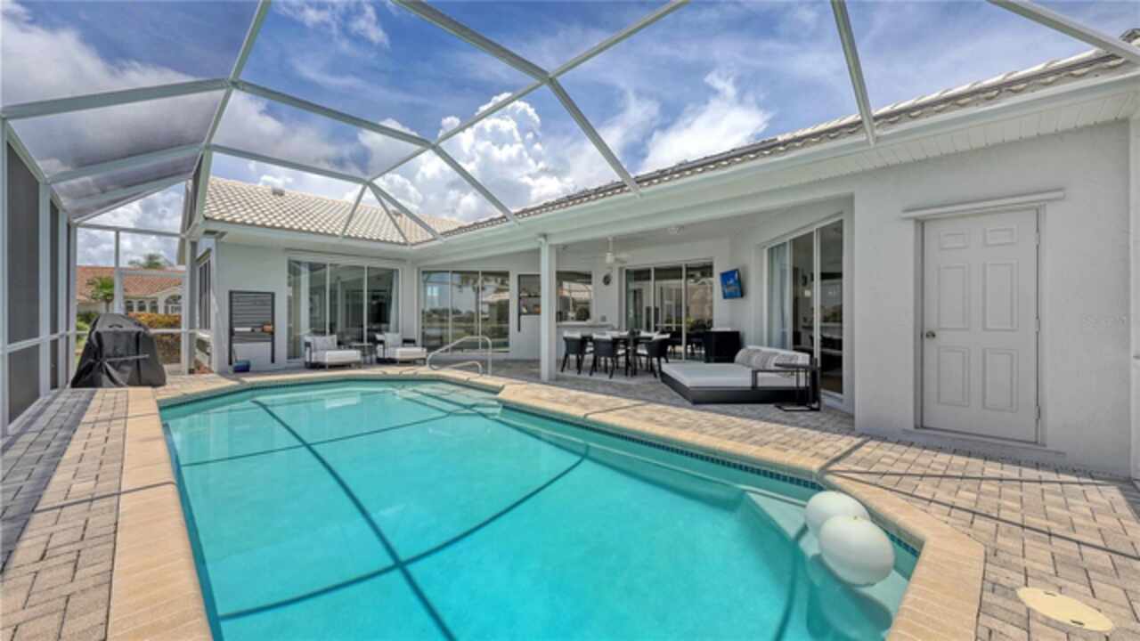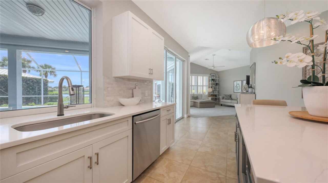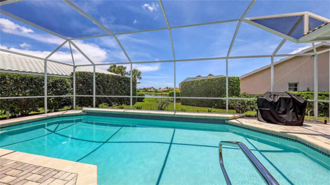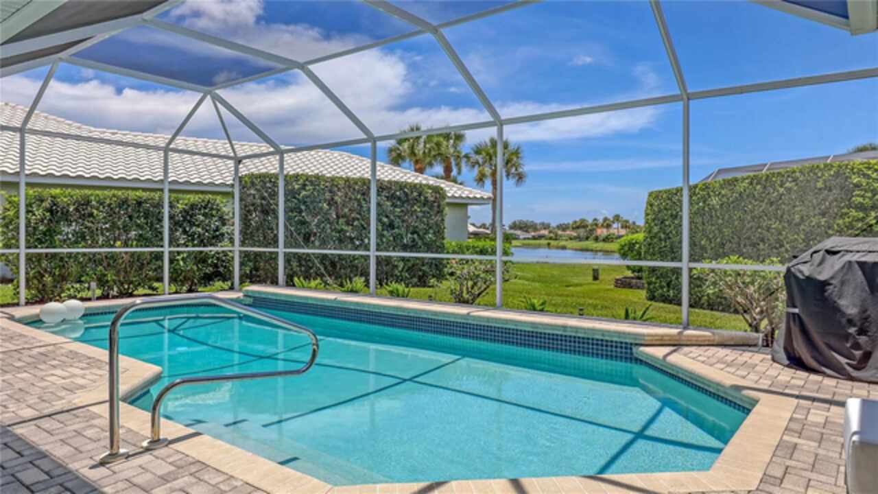 Under contract-accepting backup offers. Welcome to 1689 Valley Drive—a stylish and fully updated 3-bedroom, 2-bath home in one of Venice’s favorite gated communities. NO CDD FEE! Set on a large peaceful, lakefront corner lot, this home offers water views, a private pool, and a layout that’s both functional and beautiful. A hurricane screen on the lanai along with window shutters offers storm readiness and peace of mind. Inside, you’ll find a bright, open floor plan with high ceilings, pocket doors, neutral colors, and loads of natural light. The kitchen features white shaker cabinets, quartz countertops, stainless appliances, a large island, and gorgeous pendant lighting—perfect for casual meals or entertaining guests. The A/C was replaced in 2023. The custom-designed office space is a standout with tons of natural light, and a quiet setting that makes working from home a pleasure. Open the pocket sliders and step outside to your own private retreat featuring a paver patio, saltwater screened-in pool with solar panels and newer heat pump, a covered lanai space, and amazing lake views—great for relaxing, dining al fresco, or enjoying the Florida sunshine. Privacy hedges and landscape lighting add to the home's outdoor ambiance. The attached two-car garage has been upgraded with epoxy flooring and a built-in storage system. Everything in this home has been tastefully updated, so it’s completely move-in ready. Community heated pool and spa, fitness room, clubhouse and tennis courts. Optional golf memberships available! And with easy access to beaches, golf, restaurants, and shopping, the location couldn’t be better. If you’re looking for a meticulously maintained lakefront pool home in a secure, friendly neighborhood—this is it!