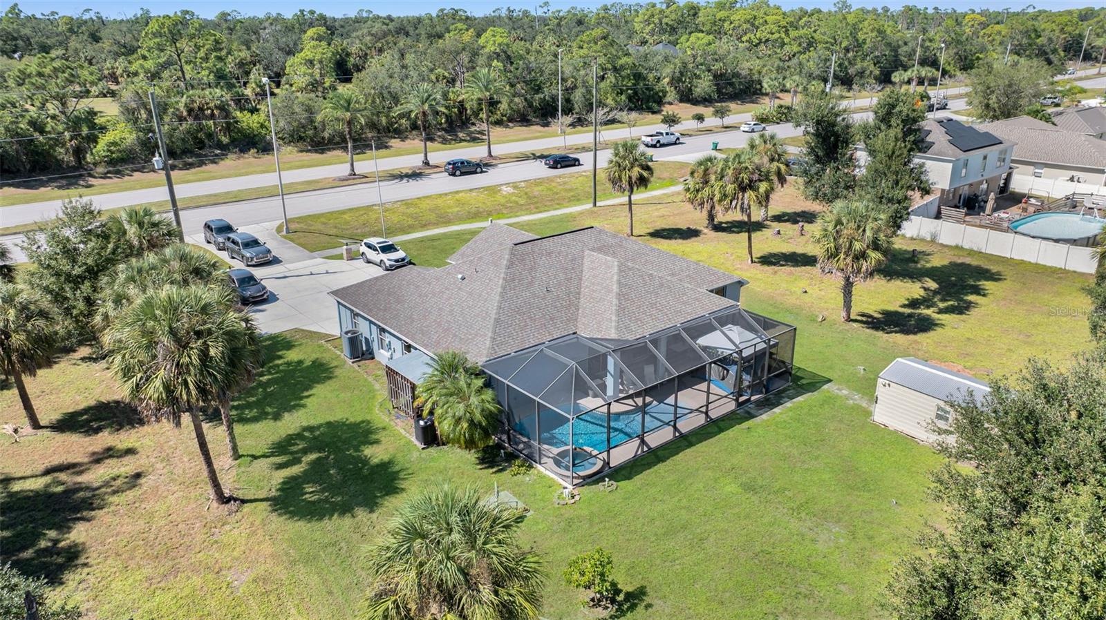Beautiful pool home on 1.37 acres located on the border between Port Charlotte and North Port! This spacious and inviting 3-bedroom, 2-bath home is perfectly situated on Toledo Blade Blvd, just minutes from US-41, shopping, dining, and all area conveniences. Inside, you’ll find bright, open living spaces with a room to the left of the entry featuring French doors that make it perfect for a home office, and a room to the right that can serve as a comfortable living or dining area. The master suite includes an ensuite bathroom with a separate shower, soaking tub, double sinks, and a makeup vanity, while the two additional bedrooms are located on the opposite side of the home and share a full bath. Enjoy outdoor living in your private screened pool with child safety fencing, a new lanai screen (2023), and a new pool pump (2024). Additional upgrades include a new roof (2023), new A/C (2018), new water heater (2022), a whole-house reverse osmosis system, air-conditioned garage, air-conditioned backyard shed, and 13 security cameras surrounding the property for added peace of mind. Set on an impressive 1.37-acre lot, this property offers plenty of room to spread out and the potential for special business-use exceptions or future rezoning opportunities (subject to county approval). Meticulously maintained, this home offers a clean, comfortable, and move-in-ready atmosphere. Its prime location on the border of Port Charlotte and North Port provides easy access to both communities, combining space, privacy, and exceptional value in one of Southwest Florida’s most desirable areas.