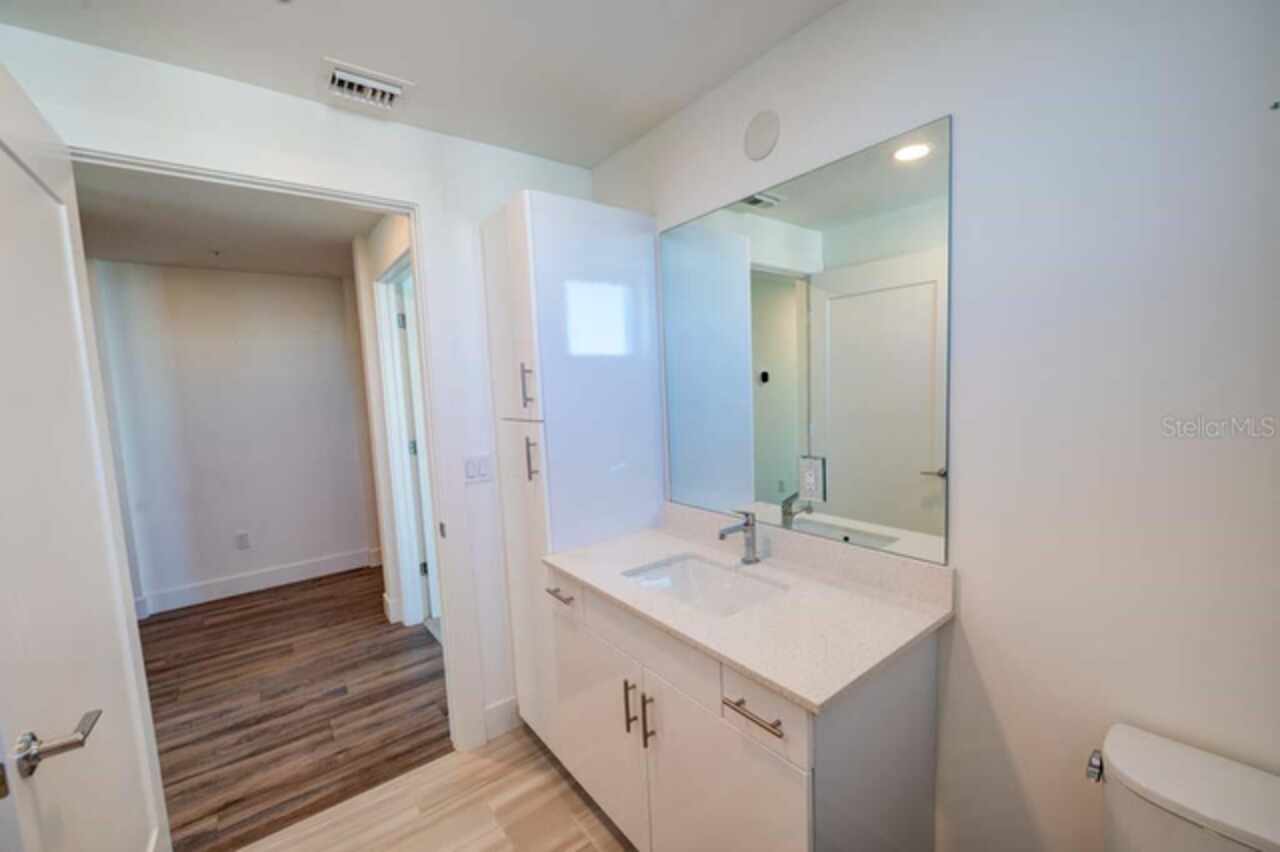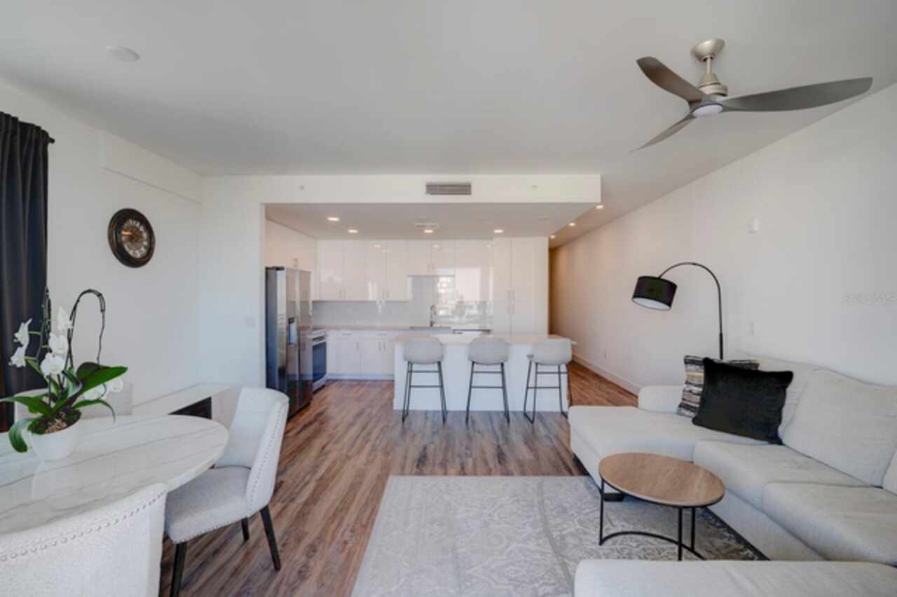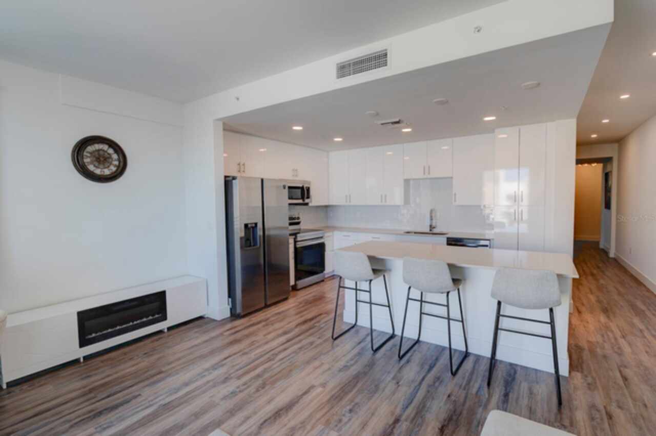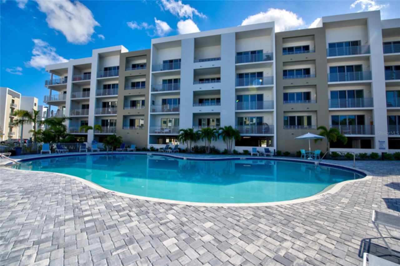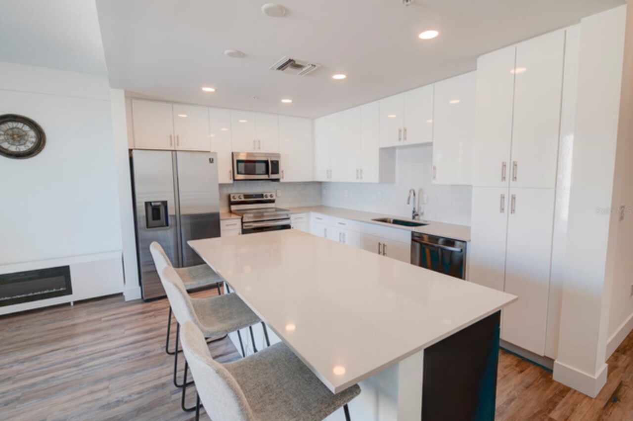 One or more photo(s) has been virtually staged. Penthouse , 5th floor, end unit, 2 bedroom , 2 full bath residence , 126 sf oversized terrace, Perfect as a primary or secondary home, or investment property where weekly rentals are permitted. The Strand! This Modern New Construction Waterfront and Bay access Condo, near Downtown Sarasota, Florida was completed in November 2022, beautifully decorated and designed PENTHOUSE, END UNIT with unmatched custom upgrades in this oversized open floor plan layout. The Kitchen/Dining/Living room gives a large, bright, open feeling. Upgraded, Two toned Modern high gloss cabinetry with pull outs and soft close drawers, terrazzo quartz island is amazing for eating, working, or to gather around at a cocktail party that will spill out onto the balcony thru the full wall of 9’ tall hurricane rated sliding glass doors. This beautiful unit offers two full bathrooms, with high gloss finished vanities and stone quartz countertops, one master bedroom with walking closet plus a large second bedroom.Convenient in-unit laundry room with Samsung washer and dryer, 1 under building assigned parking space, and private secure storage. Resort style amenities are fantastic including heated swimming pool/spa, fitness center, gas fire pit and grills, electric car charging stations, dog park, boardwalk, and kayak launch & storage. In addition to the fabulous surroundings and culture , walking distance of Downtown Sarasota, you can enjoy the restaurants, cafes and bars that are just a stone’s throw away from The Strand. Enjoy and explore the top-rated beaches and bays, waterfront parks just one step away. Sarasota was named one of the best places to live in the Country by U.S. News & World Report in the 2022 annual rankings which ranked Sarasota #9, making it the only Florida city to land in the Top 10. Make this exceptional residence, community and city your home today.