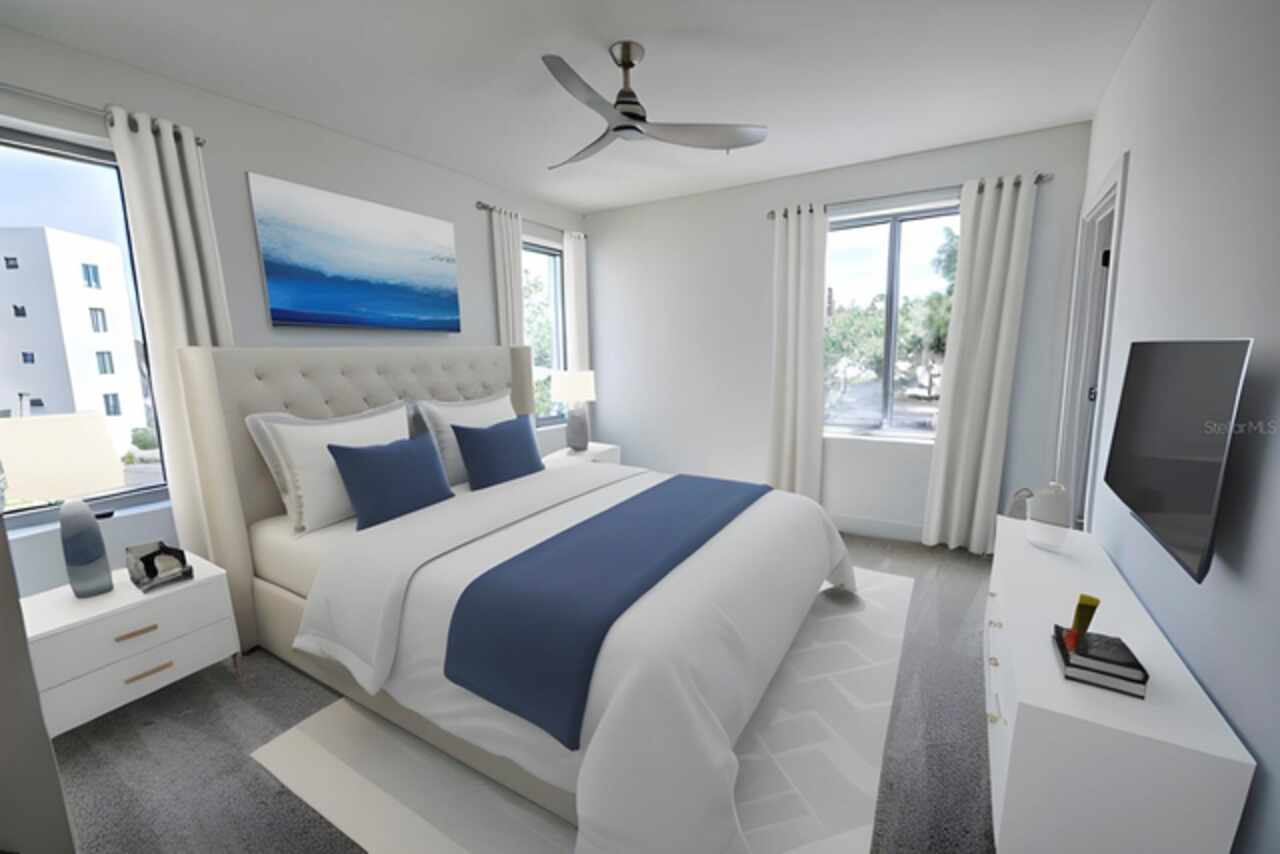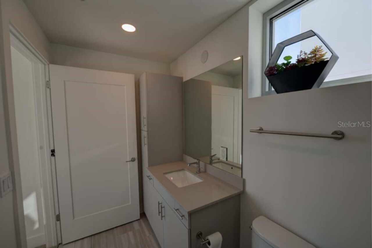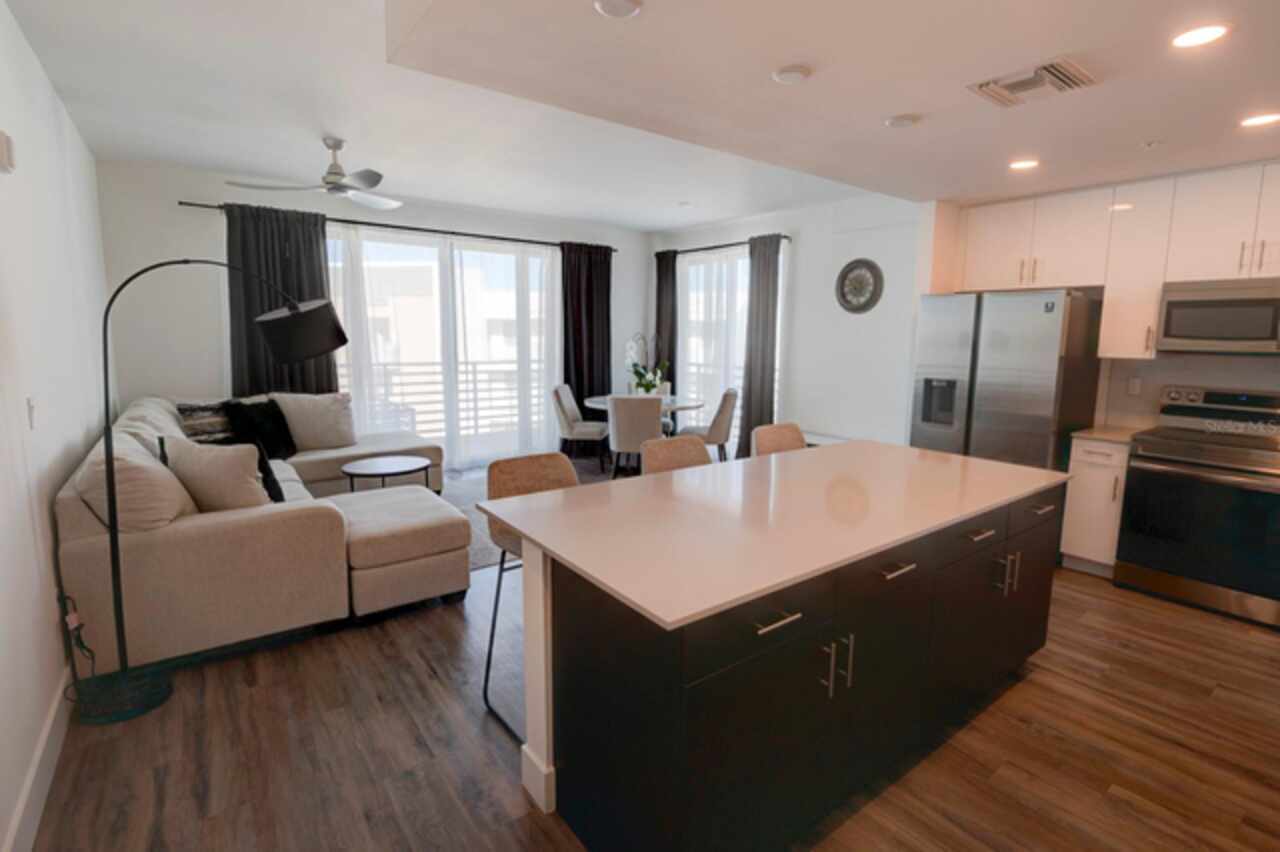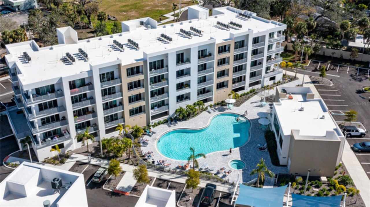 One or more photo(s) has been virtually staged. Penthouse , 5th floor, end unit, 2 bedroom , 2 full bath residence , 126 sf oversized terrace, Perfect as a primary or secondary home, or investment property where weekly rentals are permitted. The Strand! This Modern New Construction Waterfront and Bay access Condo, near Downtown Sarasota, Florida was completed in November 2022, beautifully decorated and designed PENTHOUSE, END UNIT with unmatched custom upgrades in this oversized open floor plan layout. The Kitchen/Dining/Living room gives a large, bright, open feeling. Upgraded, Two toned Modern high gloss cabinetry with pull outs and soft close drawers, terrazzo quartz island is amazing for eating, working, or to gather around at a cocktail party that will spill out onto the balcony thru the full wall of 9’ tall hurricane rated sliding glass doors. This beautiful unit offers two full bathrooms, with high gloss finished vanities and stone quartz countertops, one master bedroom with walking closet plus a large second bedroom.Convenient in-unit laundry room with Samsung washer and dryer, 1 under building assigned parking space, and private secure storage. Resort style amenities are fantastic including heated swimming pool/spa, fitness center, gas fire pit and grills, electric car charging stations, dog park, boardwalk, and kayak launch & storage. In addition to the fabulous surroundings and culture , walking distance of Downtown Sarasota, you can enjoy the restaurants, cafes and bars that are just a stone’s throw away from The Strand. Enjoy and explore the top-rated beaches and bays, waterfront parks just one step away. Sarasota was named one of the best places to live in the Country by U.S. News & World Report in the 2022 annual rankings which ranked Sarasota #9, making it the only Florida city to land in the Top 10. Make this exceptional residence, community and city your home today.