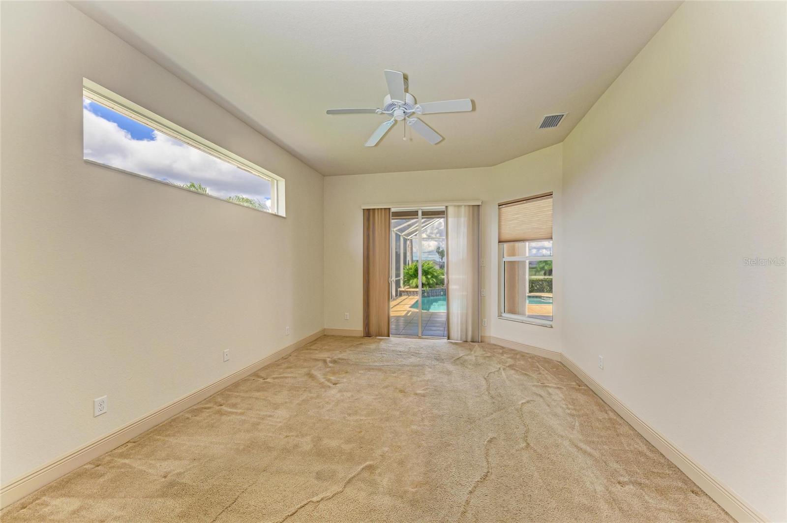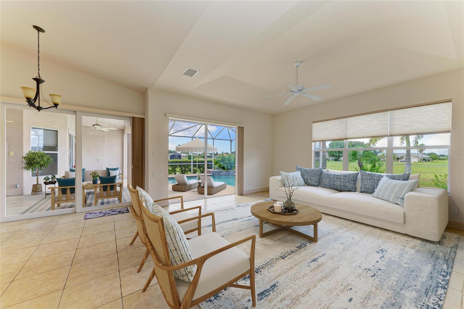 One or more photo(s) has been virtually staged. This custom pool home in Burnt Store Lakes blends timeless design, generous space, and the best of the Southwest Florida coastal lifestyle. Curb appeal begins with a front porch framed by stately pillars and full-glass double doors opening to elegant formal living and dining spaces. The open-concept kitchen and family room serve as the home’s heart, featuring wood cabinetry with 46-inch uppers, black granite countertops, stainless appliances, a built-in desk, breakfast bar, and large pantry for convenience. The great room and family room both feature zero-corner sliding glass doors, extending living space onto the screened lanai and heated pool area (25x13) with tile fountain—perfect for entertaining or quiet evenings outdoors. The split-bedroom floor plan includes three private en-suites, each offering its own bath and abundant storage. The primary suite enjoys pool access, dual walk-in closets, and a spa-inspired bath with double vanities, jetted tub, glass shower, and water closet. Throughout the home, you’ll appreciate plantation shutters, architectural shelving, transom windows, and neutral tile flooring that enhance its warm, coastal style. The laundry room adds functionality with a sink, cabinetry, and large closet, while the 31x21 three-car garage provides exceptional organized storage. Situated on nearly one-third acre with greenbelts behind and beside, this property offers both privacy and lush tropical landscaping. Launch your kayak from Bear Branch Creek and explore scenic mangrove trails into Charlotte Harbor, or enjoy the community park’s shaded pavilions and playground. Located along Punta Gorda’s Burnt Store Corridor, you’re minutes from Burnt Store Marina, offering Gulf access, waterfront dining at Cass Cay, executive golf, tennis, and pickleball—a true Southwest Florida lifestyle destination.