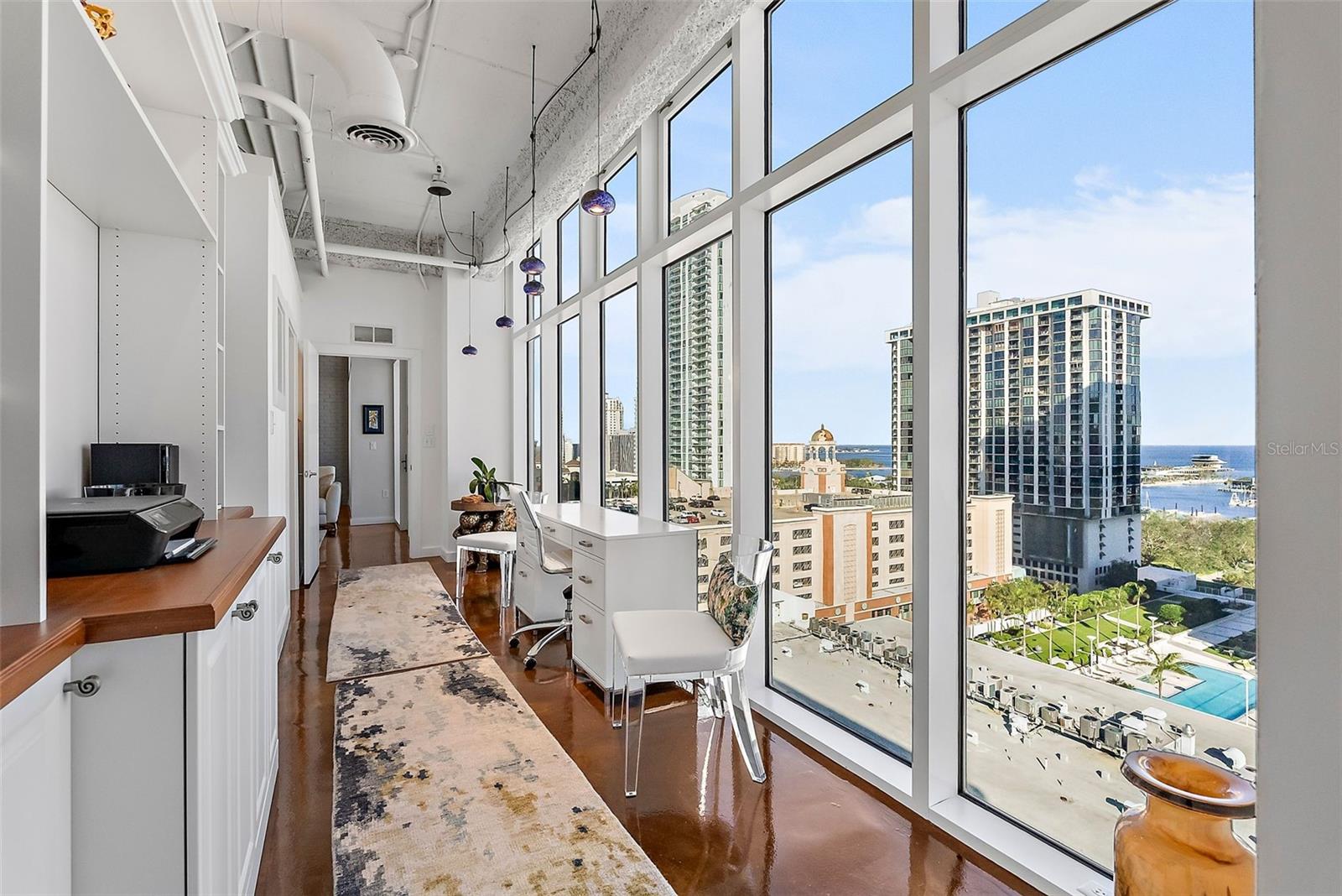 This one-of-a-kind penthouse at The McNulty Lofts is designed to captivate from the moment you step inside. Inundated in natural light, the spacious layout is brought to life by floor-to-ceiling windows that span the entire east side of the condo, offering stunning views of Tampa Bay. This extraordinary residence effortlessly blends modern luxury with breathtaking scenery, creating a truly unparalleled living experience. The breathtaking views are perfectly matched by the exquisite designer-grade finishes throughout this stunning penthouse. The light and airy kitchen has been thoughtfully updated with luxurious marble countertops that flow seamlessly into the backsplash and center island, creating a cohesive and elegant design. The all-white custom cabinetry, complete with soft-close drawers and pull-out racks, offers both style and functionality, while a built-in nook provides the perfect space for a coffee bar and wine fridge. Completing the space are all-new Bespoke appliances, including a state-of-the-art stove, oven, dishwasher, refrigerator, and microwave, ensuring a modern and sophisticated culinary experience. The open concept living spaces serve as the vibrant heart of this stunning penthouse, offering an organic flow that perfectly complements the true split floor plan. The unique layout includes a spacious sitting area off the primary suite, designed to double as the ultimate workspace. Immersed in natural light, this room redefines the home office experience. Say goodbye to uninspiring, tucked-away workspaces, making this one of the most enviable home offices in downtown St. Pete. This stunning office space doesn’t sacrifice functionality for beauty. Custom-built bookshelves and storage line the back wall, providing ample space for organization while enhancing the room’s sophisticated design. The sitting room seamlessly transitions into the expansive primary bedroom, where the floor-to-ceiling windows continue to impress. Imagine waking up each morning to breathtaking, panoramic views of the sun rising over Tampa Bay—a daily masterpiece to start your day. Or sleep in with automated Lutron black out window treatments in your primary. The luxury of this penthouse extends into the primary walk-in closet. This generously sized closet boasts custom-built features, offering two thoughtfully separated sections and an entire back wall of sleek shelving—perfectly suited to showcase your collection of bags and shoes with style and ease. The second bedroom rivals the primary in size and features a versatile layout with an ensuite bathroom. An oversized walk-in closet with custom-built shelving provides ample storage, while soaring 11-foot ceilings create space for a loft above the closet and laundry room—ideal for seasonal items. Additional upgrades include Lutron window treatments, designer lighting, and a high-performance Trane HVAC system (2022). McNulty Lofts offers a boutique living experience with only 83 residences, on-site management, a fitness center, and a newly renovated lobby. Residents enjoy two private parking spaces and a prime Downtown St. Pete location. Step outside to top-tier restaurants, shops, serene parks, museums, and iconic theaters like The Dali Museum and The Mahaffey Theater. With landmarks such as St. Pete Pier and Vinoy Park nearby, this penthouse blends luxury, culture, and convenience for an extraordinary downtown lifestyle.