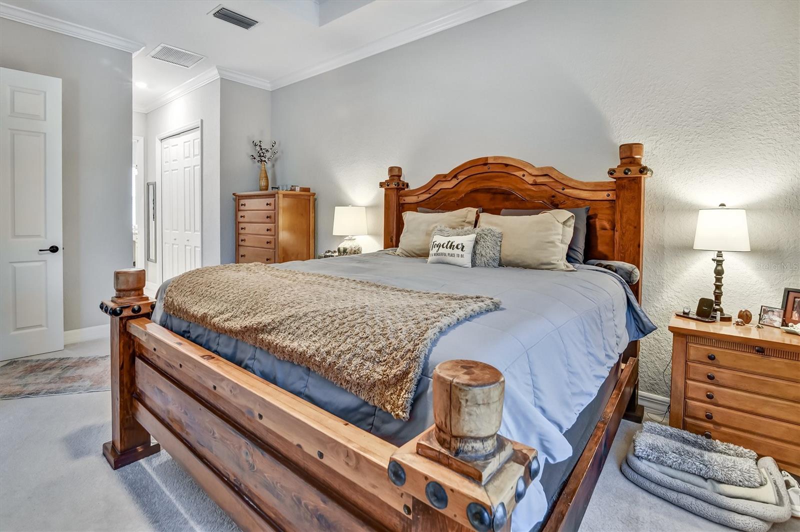 Ceiling Fans(s), Crown Molding, Dry Bar, Eat-in Kitchen, High Ceilings, In Wall Pest System, Kitchen/Family Room Combo, Open Floorplan, Primary Bedroom Main Floor, Smart Home, Solid Surface Counters, Solid Wood Cabinets, Stone Counters, Thermostat, Tray Ceiling(s), Walk-In Closet(s), Window Treatments