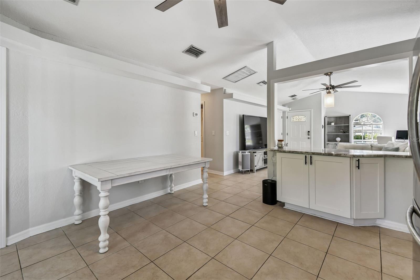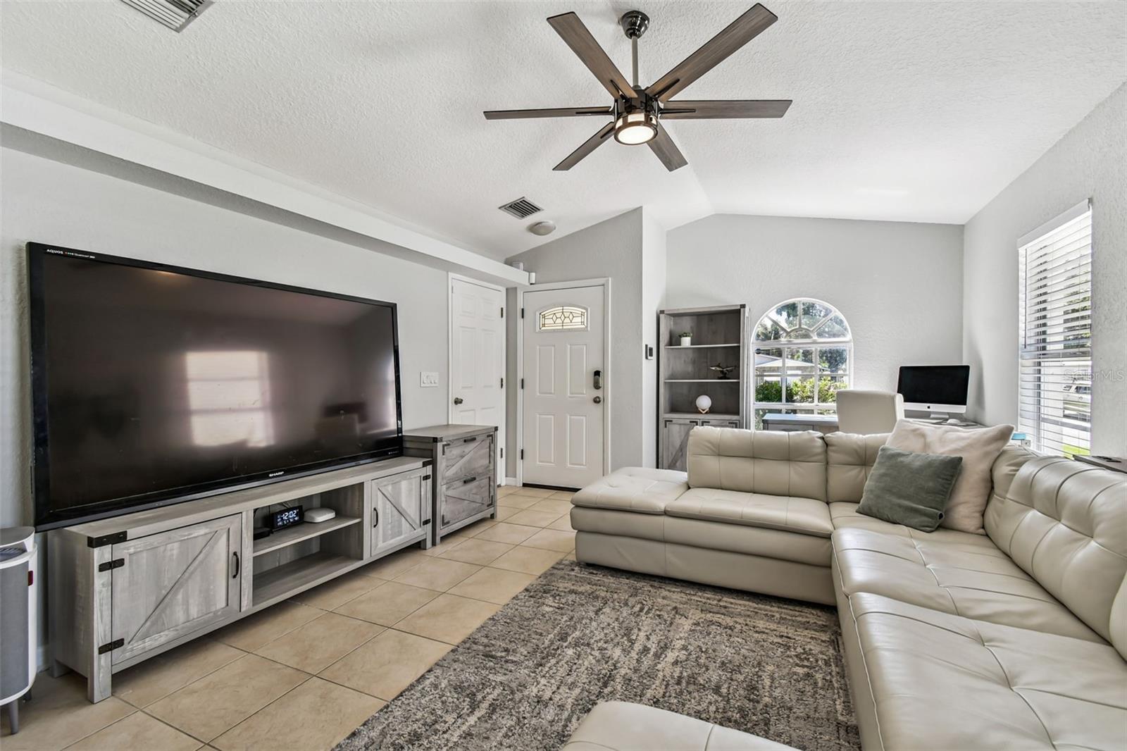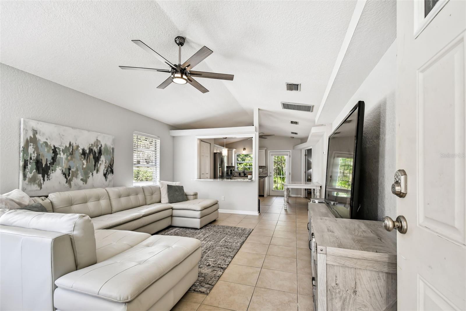 Ceiling Fans(s), Eat-in Kitchen, High Ceilings, Kitchen/Family Room Combo, Open Floorplan, Solid Wood Cabinets, Split Bedroom, Stone Counters, Thermostat, Vaulted Ceiling(s), Walk-In Closet(s), Window Treatments