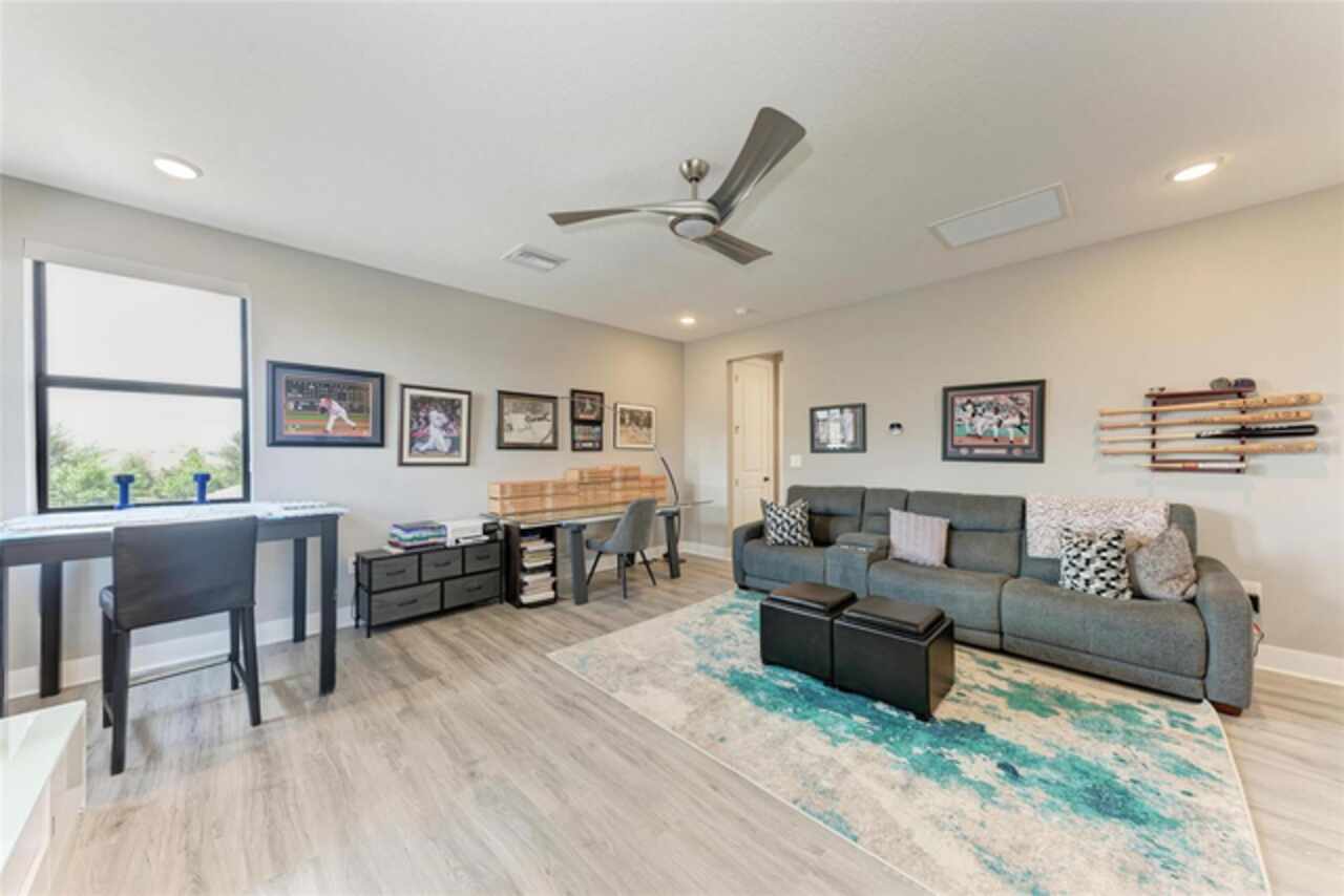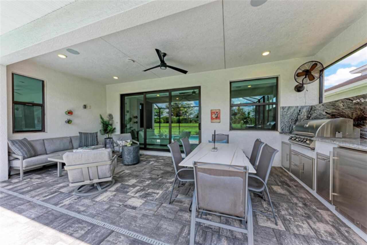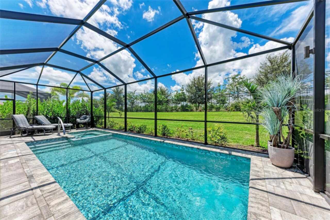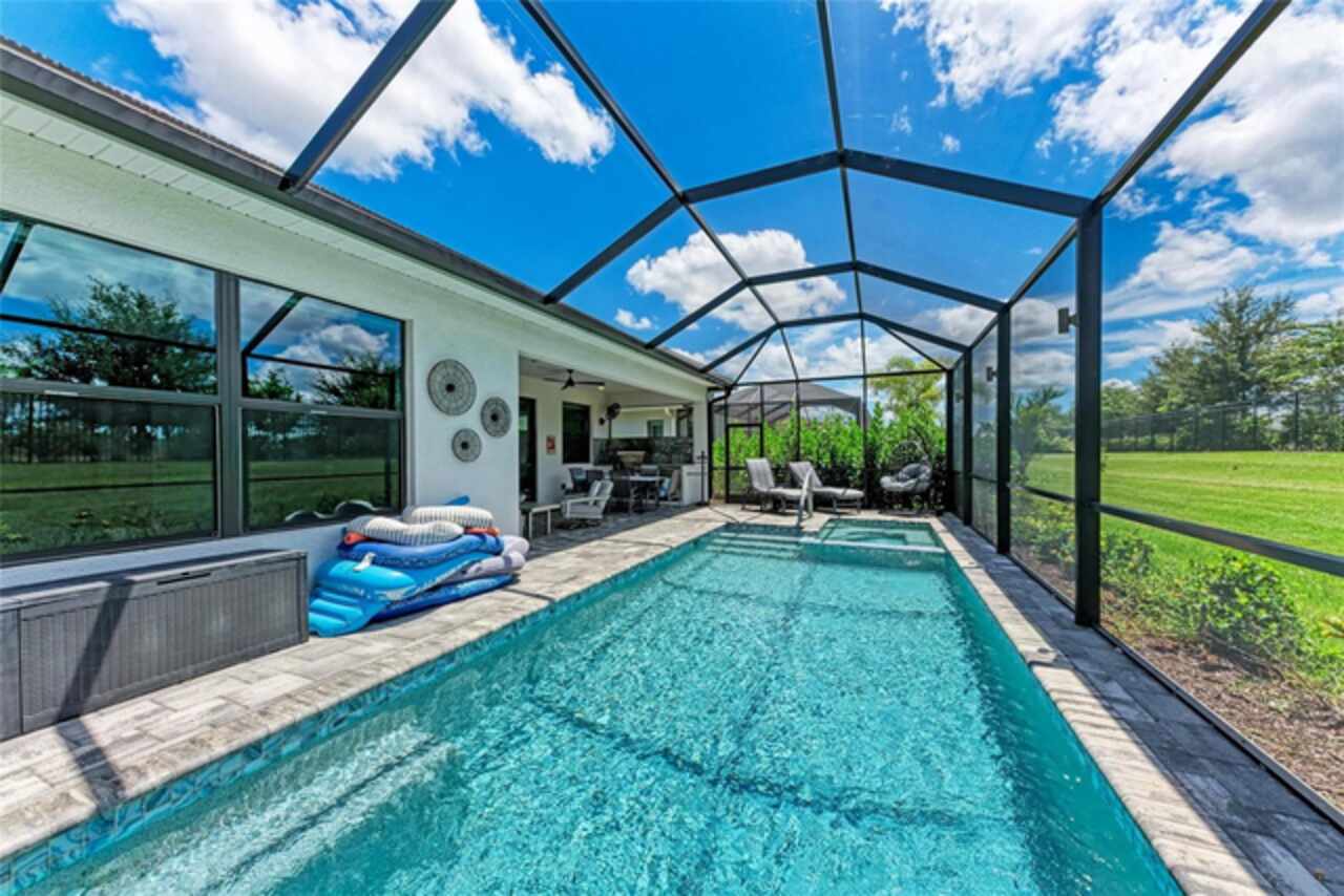 Just bring your suitcase—this turnkey home is move-in ready and can be sold fully furnished at your request. The choice is yours! Skip the 9 month wait for new construction — move into your dream home in just 30 days! Experience the perfect blend of luxury, comfort, and resort-style living in this exquisite 4-bedroom + flex room, 4-bathroom pool home located in Cresswind, Lakewood Ranch’s premier 55+ community. Thoughtfully upgraded inside and out, this home offers refined living spaces, a serene backyard retreat, and access to world-class amenities — all without the wait. Hurricane-impact windows and a whole-house generator hookup provide year-round security. Inside, the open-concept design is filled with elegant finishes and high-end upgrades. The gourmet kitchen is a chef’s delight, boasting an upgraded microwave/oven, Insta-hot faucet, custom-finished pantry, and a stunning stone-accented island — perfect for entertaining. The great room impresses with a custom feature wall, built-in entertainment system, motorized shades, and an added architectural column for style and dimension. The owner’s suite is a true retreat, featuring dual shower heads, motorized shades, finished closets, and additional outlets for convenience. Guest bedrooms and the versatile flex room offer custom cabinetry, a Murphy bed, built-in desk, and ceiling fans. Fresh interior paint and professionally cleaned/sealed tile floors with a 5-year warranty complete the move-in-ready appeal. The upstairs is perfect for family or out of town guests. Outdoor Living at Its Finest Step outside to your private oasis. The expansive screened lanai features a custom outdoor kitchen, ceiling fan, speakers, TV hookup, and ambient cage lighting. Relax in the resort-style saltwater pool and spa, complete with a pool railing and extra spa step for ease. Upgraded travertine pavers, lush landscaping, stone pathways, and an extended concrete pad create a perfect space for entertaining or unwinding in style. Additional Upgrades Include a whole-home water filtration system, wireless access points in the lanai and great room, front path and lanai lighting whole-house gutters & enhanced irrigation system timed garage and entryway lighting. The unbeatable Location is just minutes from the Lakewood Ranch Library, Waterside Place, shopping, dining, and UTC, with easy access to I-75, downtown Sarasota, and the Gulf Coast’s stunning beaches. This pet-friendly, well-managed 55+ community offers over 250 acres of amenities, including a resident-exclusive clubhouse, SmartFit/EGym training center, yoga and art studios, card rooms, pickleball and tennis courts, bocce, walking trails, an event lawn for food trucks, and a heated resort pool and spa — all overseen by a full-time lifestyle director. Don’t wait months for new construction — this upgraded luxury home is ready for you today. Schedule your private showing and start living the Lakewood Ranch lifestyle now!