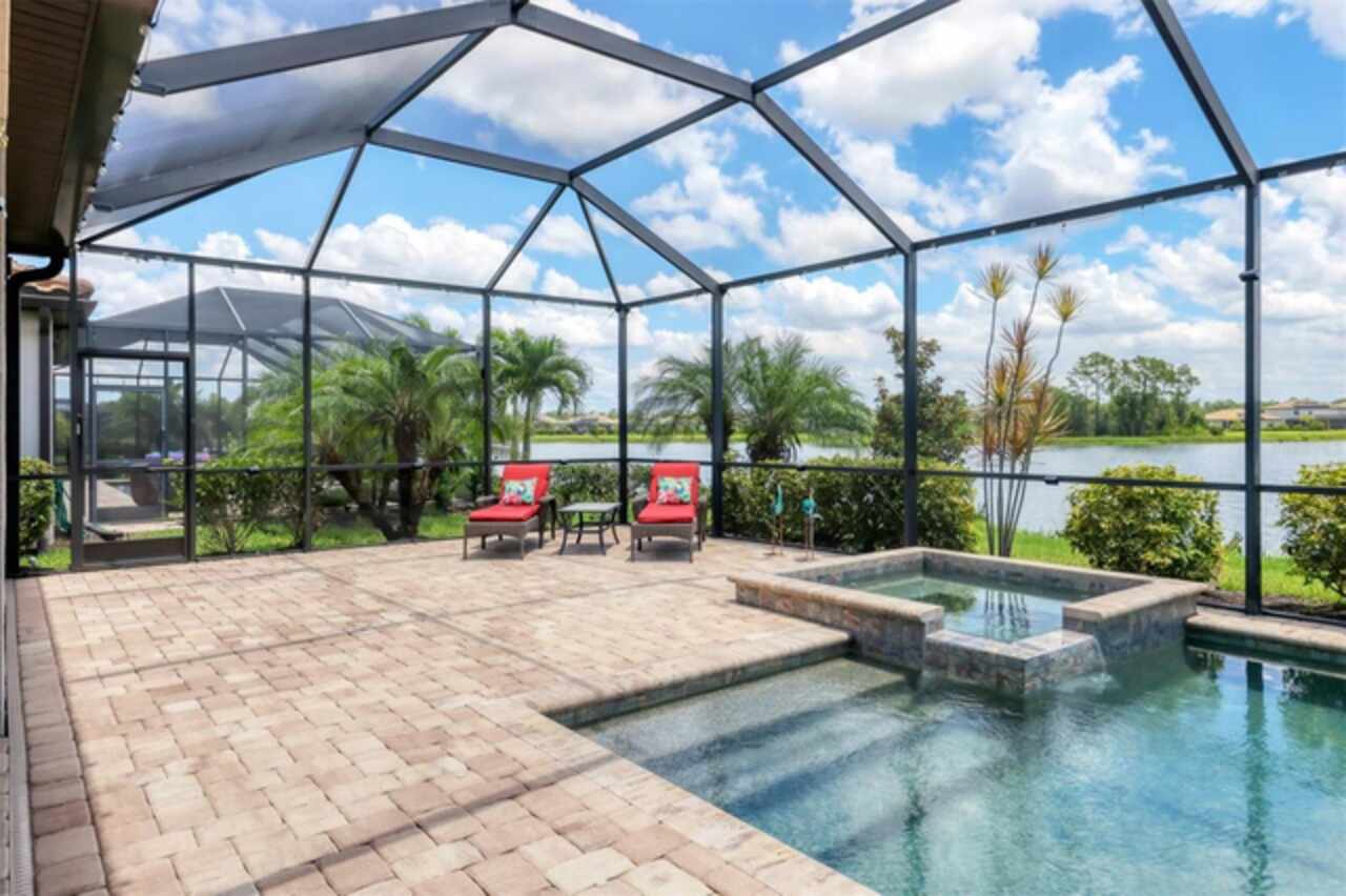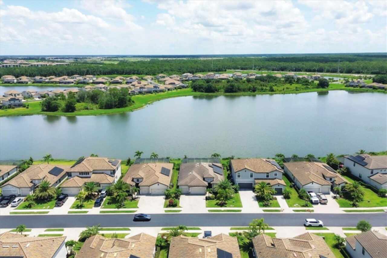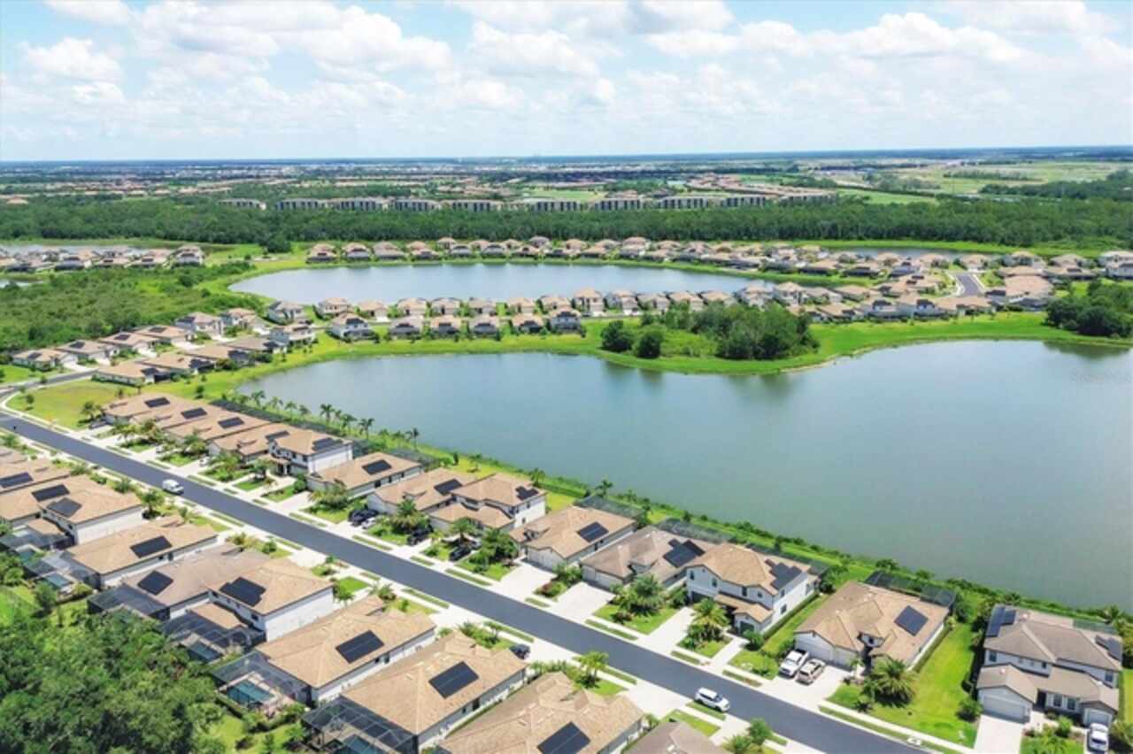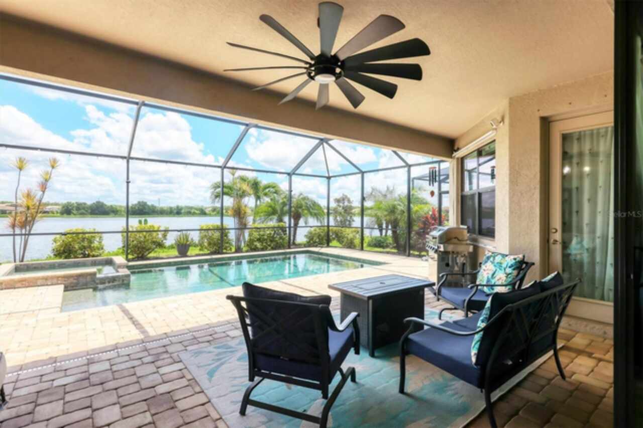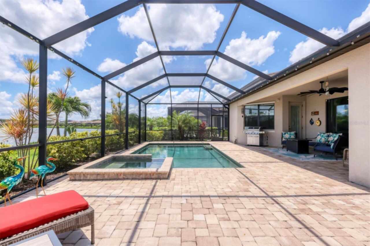 Welcome to your Florida dream home in Polo Run — the first solar-powered neighborhood in Lakewood Ranch. This stunning Lennar Princeton II model offers a blend of luxury, energy efficiency and peace of mind, all set on a premium homesite with breathtaking sunrise and sunset views over the water. This home features four spacious bedrooms and two baths within an open floor plan. Elegant architectural details include arched doorways, crown molding, neutral tile flooring and tray ceiling with custom wood inlays. This home is designed for gathering with the central, airy great room, featuring a newly installed shiplap accent wall and built-in electric fireplace with shelving (2023). Right off the great room, the kitchen offers a setting for entertaining with its angled island, pendant lighting, white cabinetry, stainless steel appliances and a cozy breakfast nook overlooking the pool. Sliding glass doors lead to an expansive paver lanai where you can relax beside your private saltwater pool and spa, heated by solar power and updated with a new pool pump in 2023. The lanai offers spectacular water views and a tranquil setting to enjoy morning coffee and evening sunsets. The serene primary suite also enjoys sweeping lake views and features a tray ceiling, large walk-in closet and a spacious en-suite bath with dual sinks and a walk-in shower. Three additional bedrooms and a guest bath offer comfort and flexibility for family and guests. This home is filled with upgrades, including a new HVAC system and Halo UV light air purifier installed in 2023, a tankless water heater, a water softener, hurricane shutters, and a whole-home gas generator for added security and efficiency. Curb appeal abounds with a tasteful stone façade, paver driveway and lush tropical landscaping, all maintained by the HOA. A spacious three-car garage provides plenty of room for vehicles and storage. Polo Run residents enjoy a vibrant, maintenance-free lifestyle with access to resort-style amenities, including a clubhouse, resort-style pool, fitness center, bocce ball, tennis, pickleball and basketball courts. The community also features a dog park, children's playground, and a full calendar of social activities like exercise classes, water aerobics, trivia nights and card games. Conveniently near shopping, dining and with quick access to Interstate 75, this solar-powered home offers luxury, location and peace of mind in one of Lakewood Ranch’s premier communities. Don’t miss your opportunity to live beautifully and sustainably in Polo Run and schedule your private tour today.