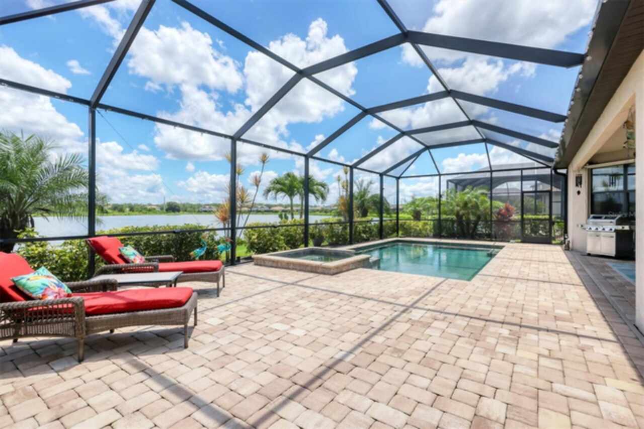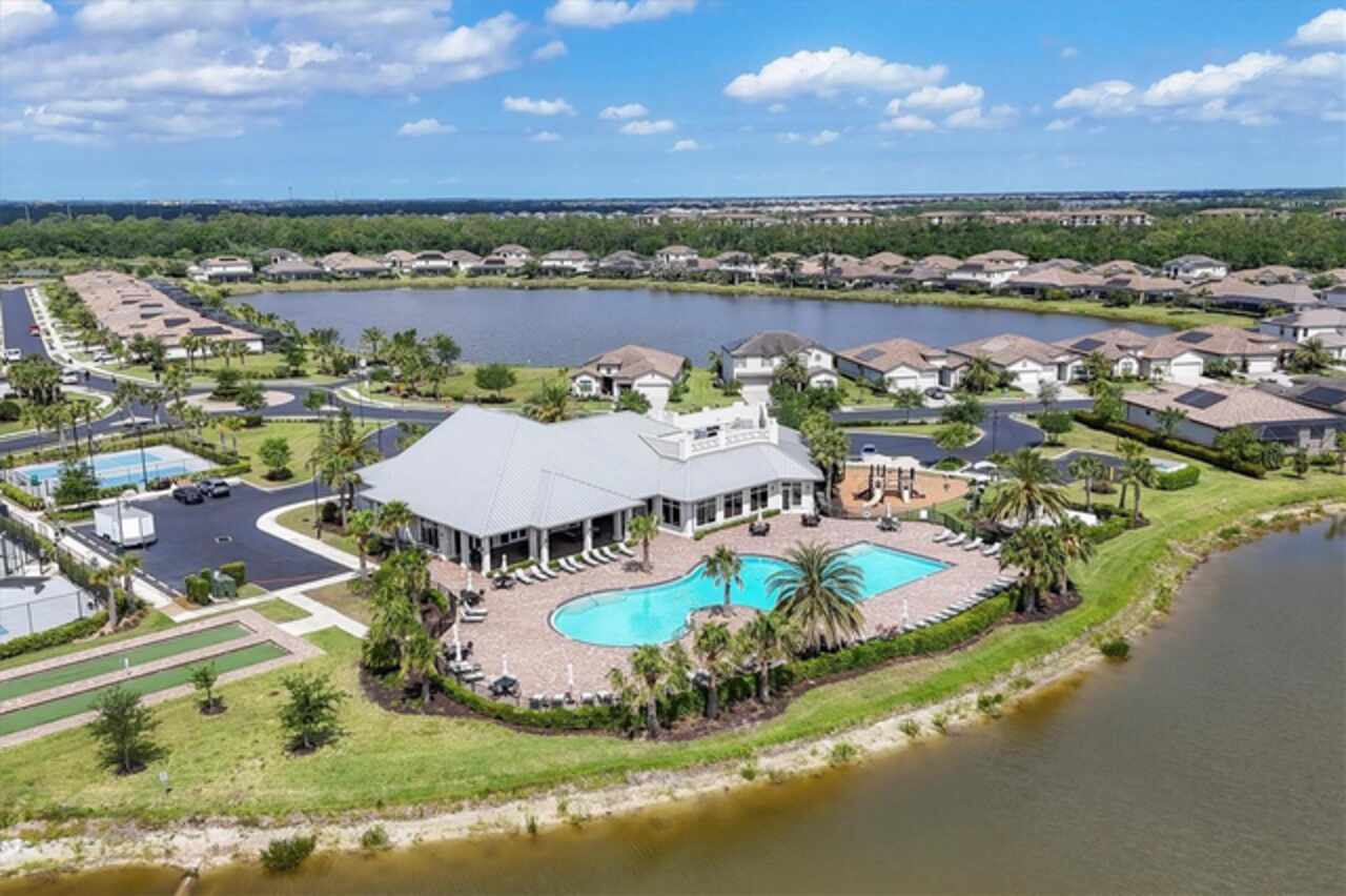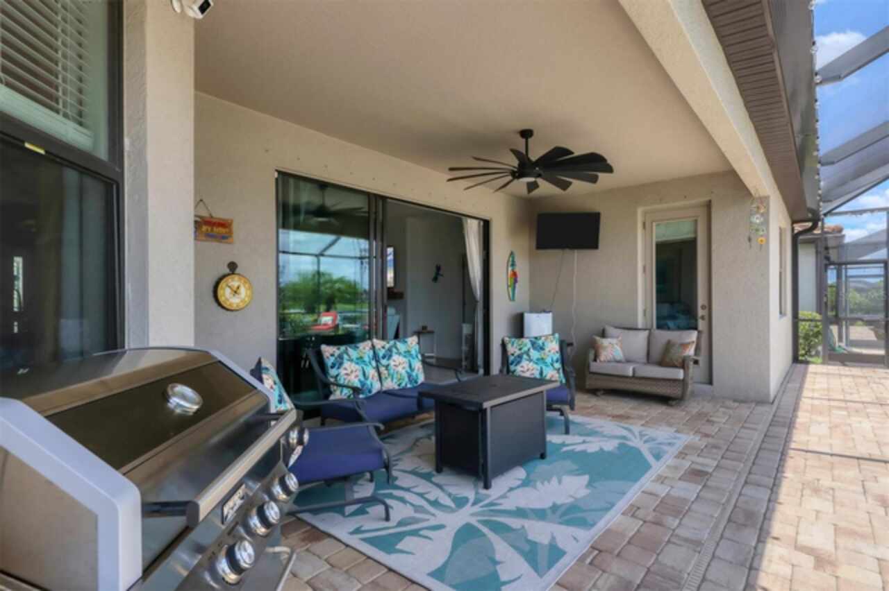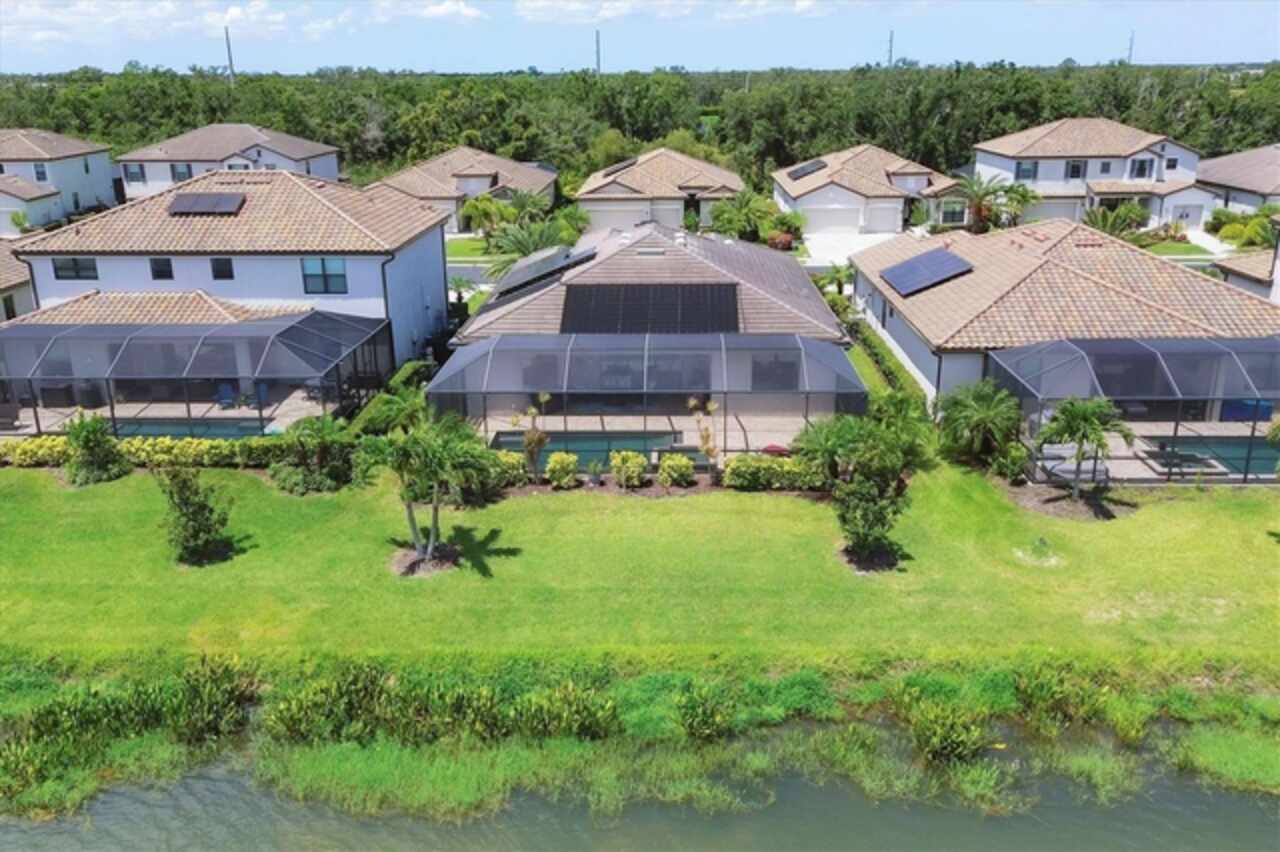 Welcome to your Florida dream home in Polo Run — the first solar-powered neighborhood in Lakewood Ranch. This stunning Lennar Princeton II model offers a blend of luxury, energy efficiency and peace of mind, all set on a premium homesite with breathtaking sunrise and sunset views over the water. This home features four spacious bedrooms and two baths within an open floor plan. Elegant architectural details include arched doorways, crown molding, neutral tile flooring and tray ceiling with custom wood inlays. This home is designed for gathering with the central, airy great room, featuring a newly installed shiplap accent wall and built-in electric fireplace with shelving (2023). Right off the great room, the kitchen offers a setting for entertaining with its angled island, pendant lighting, white cabinetry, stainless steel appliances and a cozy breakfast nook overlooking the pool. Sliding glass doors lead to an expansive paver lanai where you can relax beside your private saltwater pool and spa, heated by solar power and updated with a new pool pump in 2023. The lanai offers spectacular water views and a tranquil setting to enjoy morning coffee and evening sunsets. The serene primary suite also enjoys sweeping lake views and features a tray ceiling, large walk-in closet and a spacious en-suite bath with dual sinks and a walk-in shower. Three additional bedrooms and a guest bath offer comfort and flexibility for family and guests. This home is filled with upgrades, including a new HVAC system and Halo UV light air purifier installed in 2023, a tankless water heater, a water softener, hurricane shutters, and a whole-home gas generator for added security and efficiency. Curb appeal abounds with a tasteful stone façade, paver driveway and lush tropical landscaping, all maintained by the HOA. A spacious three-car garage provides plenty of room for vehicles and storage. Polo Run residents enjoy a vibrant, maintenance-free lifestyle with access to resort-style amenities, including a clubhouse, resort-style pool, fitness center, bocce ball, tennis, pickleball and basketball courts. The community also features a dog park, children's playground, and a full calendar of social activities like exercise classes, water aerobics, trivia nights and card games. Conveniently near shopping, dining and with quick access to Interstate 75, this solar-powered home offers luxury, location and peace of mind in one of Lakewood Ranch’s premier communities. Don’t miss your opportunity to live beautifully and sustainably in Polo Run and schedule your private tour today.