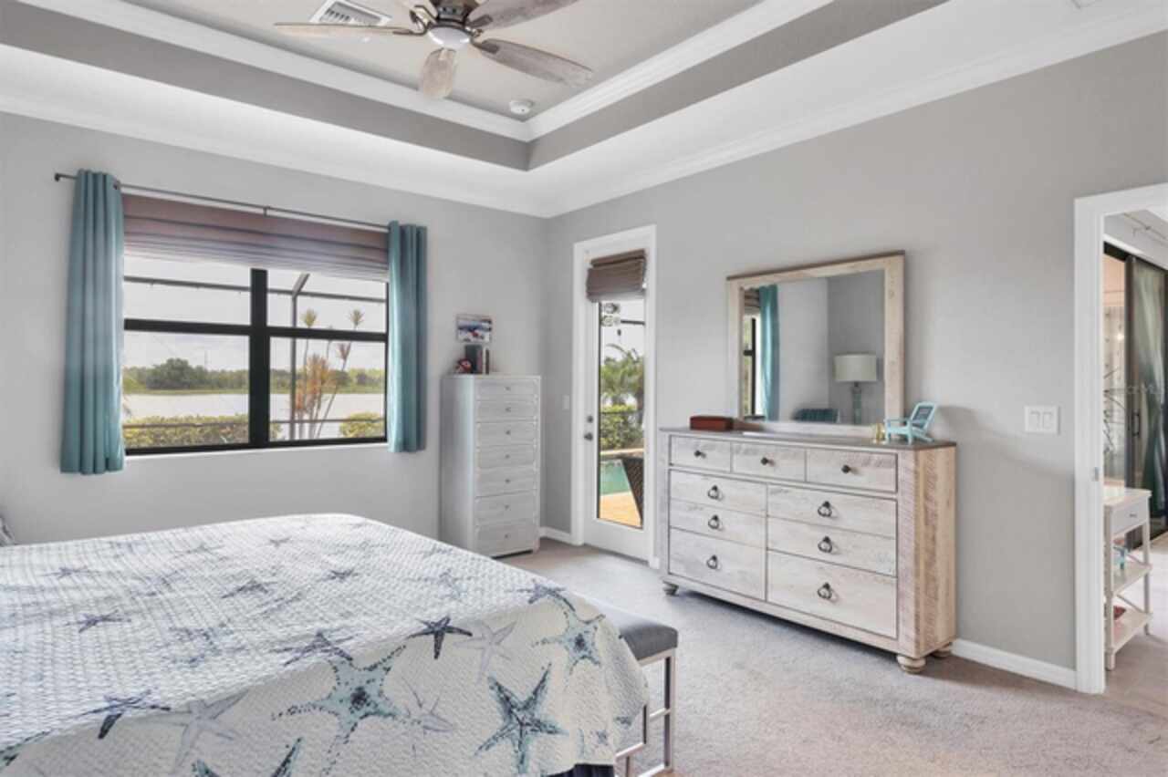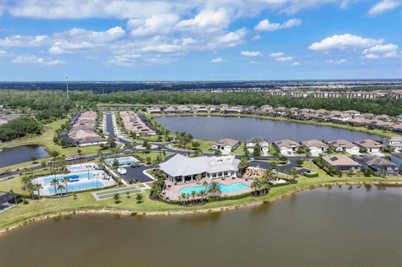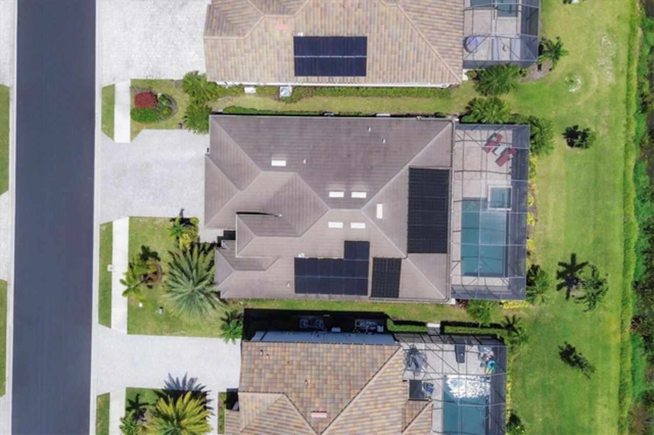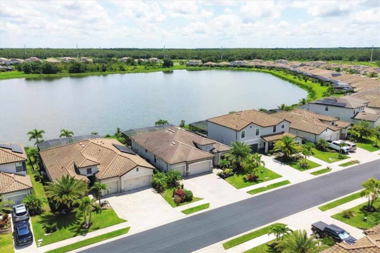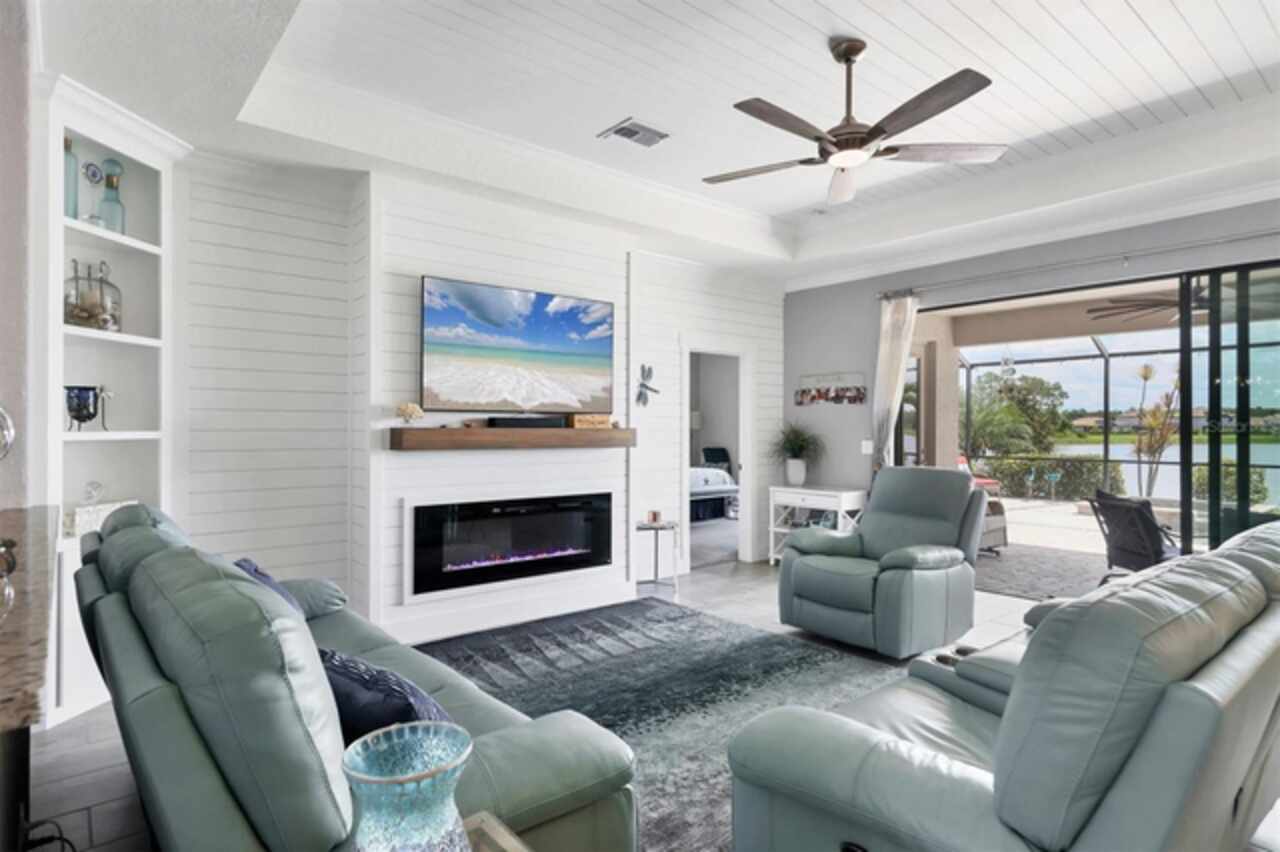 Welcome to your Florida dream home in Polo Run — the first solar-powered neighborhood in Lakewood Ranch. This stunning Lennar Princeton II model offers a blend of luxury, energy efficiency and peace of mind, all set on a premium homesite with breathtaking sunrise and sunset views over the water. This home features four spacious bedrooms and two baths within an open floor plan. Elegant architectural details include arched doorways, crown molding, neutral tile flooring and tray ceiling with custom wood inlays. This home is designed for gathering with the central, airy great room, featuring a newly installed shiplap accent wall and built-in electric fireplace with shelving (2023). Right off the great room, the kitchen offers a setting for entertaining with its angled island, pendant lighting, white cabinetry, stainless steel appliances and a cozy breakfast nook overlooking the pool. Sliding glass doors lead to an expansive paver lanai where you can relax beside your private saltwater pool and spa, heated by solar power and updated with a new pool pump in 2023. The lanai offers spectacular water views and a tranquil setting to enjoy morning coffee and evening sunsets. The serene primary suite also enjoys sweeping lake views and features a tray ceiling, large walk-in closet and a spacious en-suite bath with dual sinks and a walk-in shower. Three additional bedrooms and a guest bath offer comfort and flexibility for family and guests. This home is filled with upgrades, including a new HVAC system and Halo UV light air purifier installed in 2023, a tankless water heater, a water softener, hurricane shutters, and a whole-home gas generator for added security and efficiency. Curb appeal abounds with a tasteful stone façade, paver driveway and lush tropical landscaping, all maintained by the HOA. A spacious three-car garage provides plenty of room for vehicles and storage. Polo Run residents enjoy a vibrant, maintenance-free lifestyle with access to resort-style amenities, including a clubhouse, resort-style pool, fitness center, bocce ball, tennis, pickleball and basketball courts. The community also features a dog park, children's playground, and a full calendar of social activities like exercise classes, water aerobics, trivia nights and card games. Conveniently near shopping, dining and with quick access to Interstate 75, this solar-powered home offers luxury, location and peace of mind in one of Lakewood Ranch’s premier communities. Don’t miss your opportunity to live beautifully and sustainably in Polo Run and schedule your private tour today.