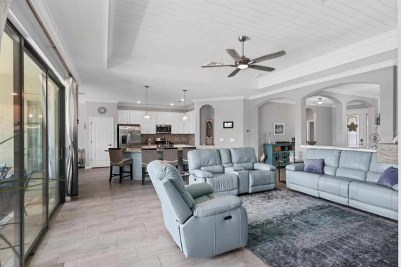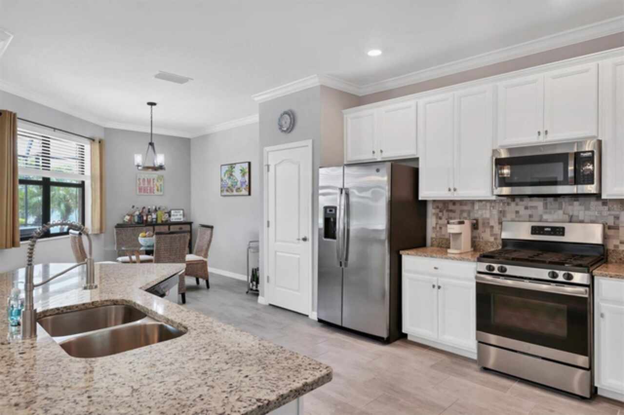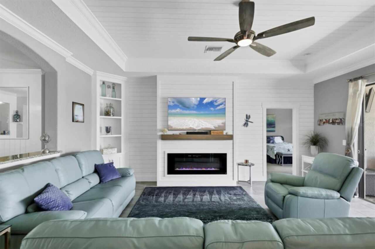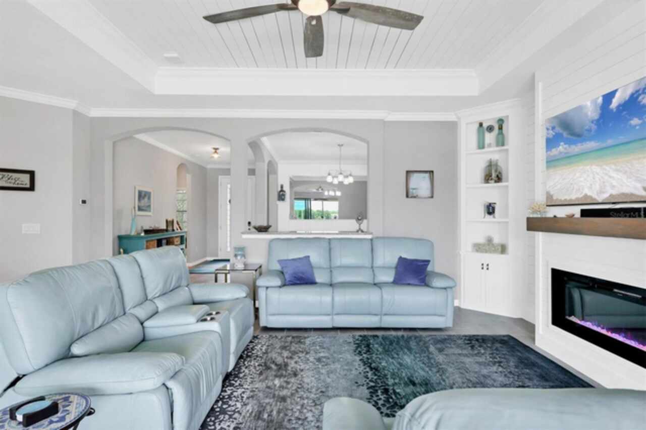 Welcome to your Florida dream home in Polo Run — the first solar-powered neighborhood in Lakewood Ranch. This stunning Lennar Princeton II model offers a blend of luxury, energy efficiency and peace of mind, all set on a premium homesite with breathtaking sunrise and sunset views over the water. This home features four spacious bedrooms and two baths within an open floor plan. Elegant architectural details include arched doorways, crown molding, neutral tile flooring and tray ceiling with custom wood inlays. This home is designed for gathering with the central, airy great room, featuring a newly installed shiplap accent wall and built-in electric fireplace with shelving (2023). Right off the great room, the kitchen offers a setting for entertaining with its angled island, pendant lighting, white cabinetry, stainless steel appliances and a cozy breakfast nook overlooking the pool. Sliding glass doors lead to an expansive paver lanai where you can relax beside your private saltwater pool and spa, heated by solar power and updated with a new pool pump in 2023. The lanai offers spectacular water views and a tranquil setting to enjoy morning coffee and evening sunsets. The serene primary suite also enjoys sweeping lake views and features a tray ceiling, large walk-in closet and a spacious en-suite bath with dual sinks and a walk-in shower. Three additional bedrooms and a guest bath offer comfort and flexibility for family and guests. This home is filled with upgrades, including a new HVAC system and Halo UV light air purifier installed in 2023, a tankless water heater, a water softener, hurricane shutters, and a whole-home gas generator for added security and efficiency. Curb appeal abounds with a tasteful stone façade, paver driveway and lush tropical landscaping, all maintained by the HOA. A spacious three-car garage provides plenty of room for vehicles and storage. Polo Run residents enjoy a vibrant, maintenance-free lifestyle with access to resort-style amenities, including a clubhouse, resort-style pool, fitness center, bocce ball, tennis, pickleball and basketball courts. The community also features a dog park, children's playground, and a full calendar of social activities like exercise classes, water aerobics, trivia nights and card games. Conveniently near shopping, dining and with quick access to Interstate 75, this solar-powered home offers luxury, location and peace of mind in one of Lakewood Ranch’s premier communities. Don’t miss your opportunity to live beautifully and sustainably in Polo Run and schedule your private tour today.