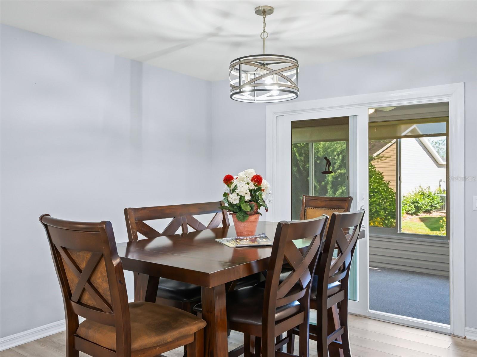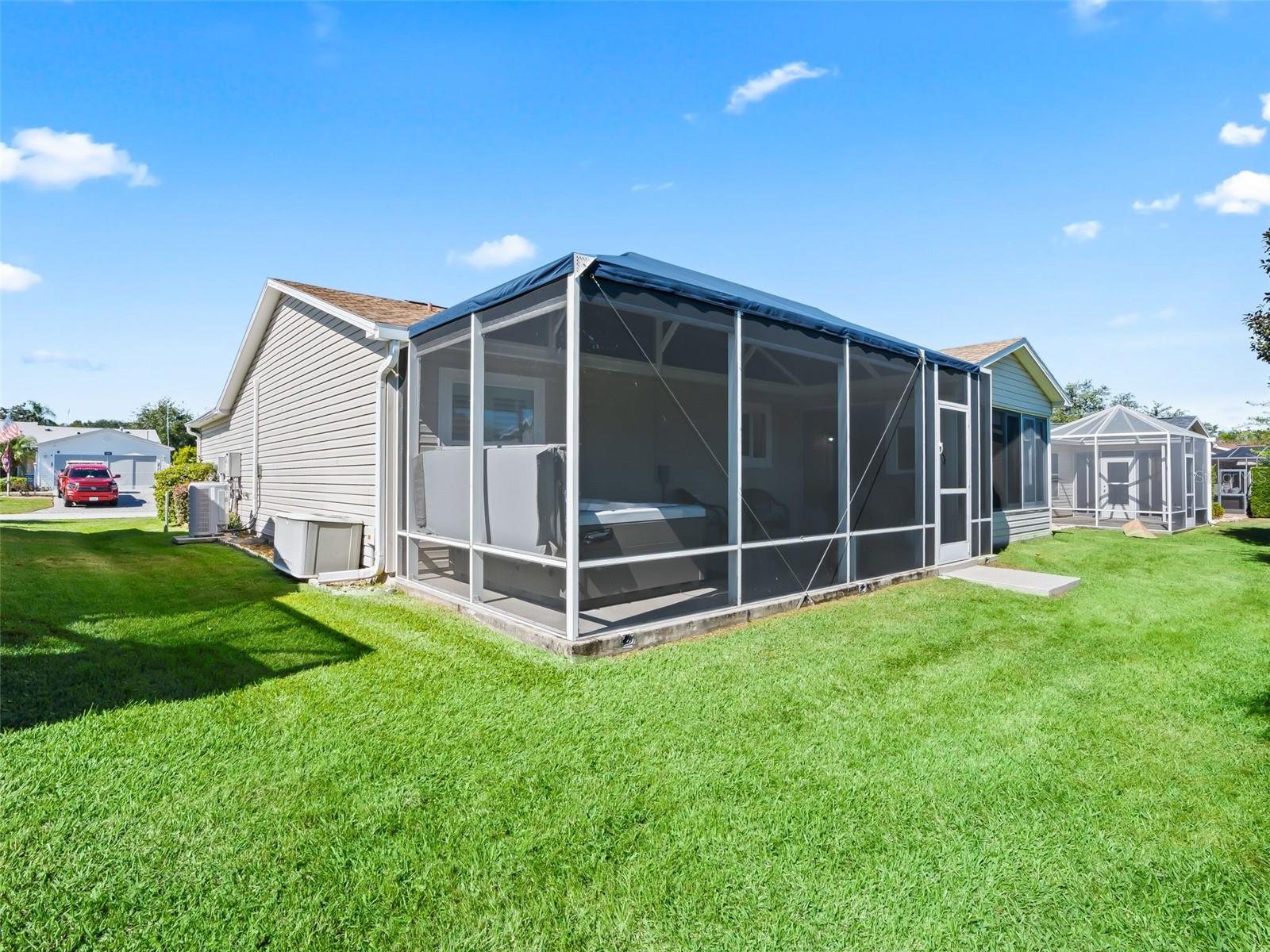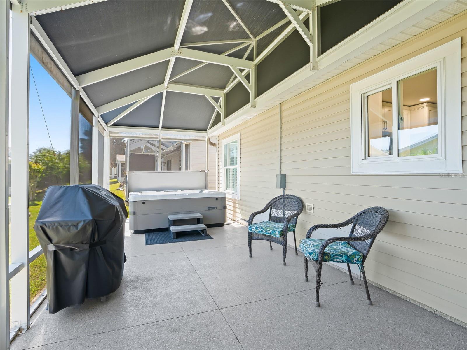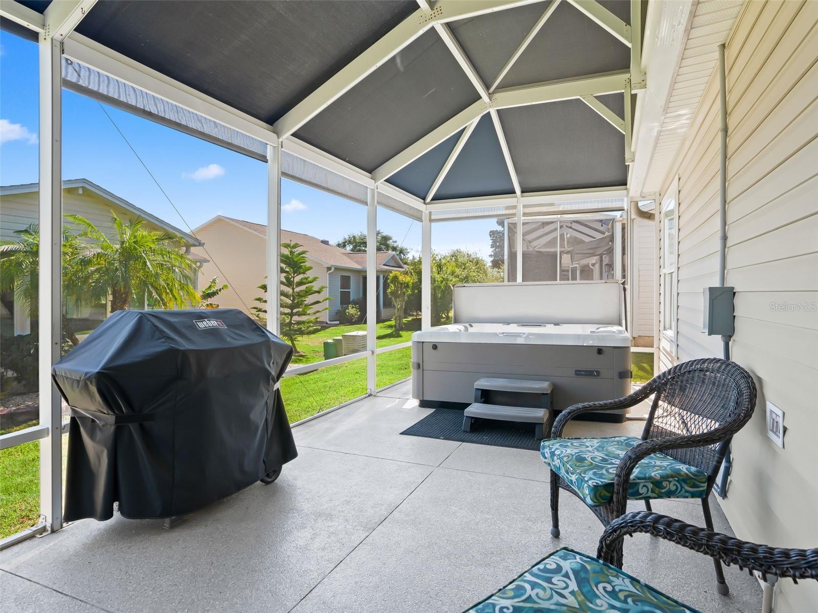 Welcome home to this beautifully UPDATED AMARILLO model (1, 392 SF heated) in the Village of Piedmont with NO BOND! ROOF 2020, HVAC 2015. PLANTATION SHUTTERS, knockdown (NO POPCORN) ceilings, and NO CARPET- luxury laminate flooring throughout with no transitions!! All three bedrooms feature CUSTOM CALIFORNIA CLOSETS, including LARGE WALK-IN master closet. The completely UPGRADED KITCHEN offers STAINLESS STEEL Appliances, CROWNED SHAKER CABINETS TO THE CEILING w/ PULL-OUTS, GORGEOUS WHITE GRANITE, specialty TILE BACKSPLASH, and a FARMHOUSE SINK. Both baths have GRANITE-topped white vanities and UPGRADED LIGHTING. Enjoy year-round comfort in the EAST-FACING ENCLOSED LANAI with NEW 2024 non-impact windows and door, leading to a COVERED BIRDCAGE with a 2024 BULLFROG SPA/HOT TUB—perfect for relaxing after a day of recreation or an evening out. There’s also a SCREENED FRONT PORCH, UPDATED LIGHT FIXTURES AND FANS throughout, and an INSIDE LAUNDRY with washer, dryer, and cabinetry. The garage is a dream: utility sink, built-in cabinets, workbench, ABUNDANT STORAGE, and an extra refrigerator/freezer included. MOSTLY FURNISHED/ PART TURNKEY—just bring a few personal touches and start enjoying The Villages lifestyle!