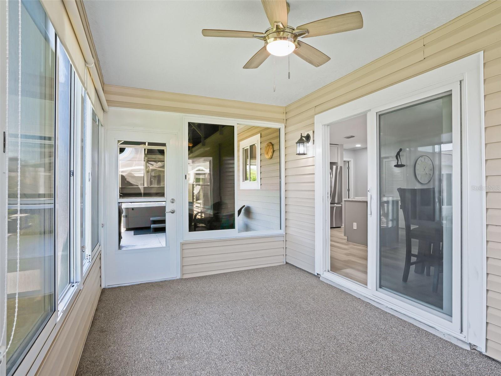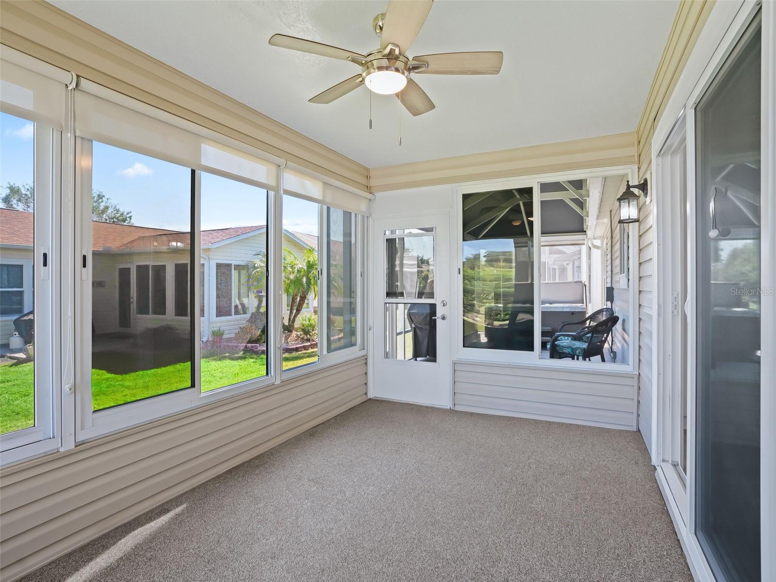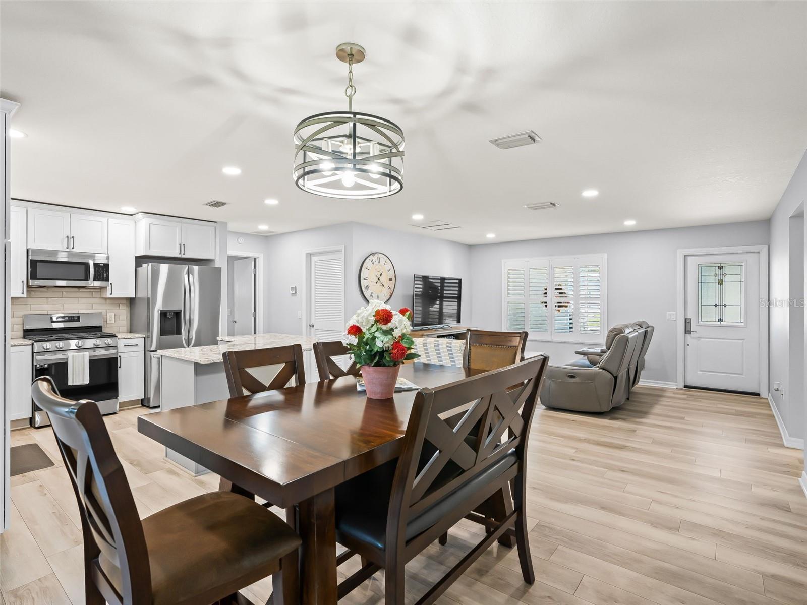 Welcome home to this beautifully UPDATED AMARILLO model (1, 392 SF heated) in the Village of Piedmont with NO BOND! ROOF 2020, HVAC 2015. PLANTATION SHUTTERS, knockdown (NO POPCORN) ceilings, and NO CARPET- luxury laminate flooring throughout with no transitions!! All three bedrooms feature CUSTOM CALIFORNIA CLOSETS, including LARGE WALK-IN master closet. The completely UPGRADED KITCHEN offers STAINLESS STEEL Appliances, CROWNED SHAKER CABINETS TO THE CEILING w/ PULL-OUTS, GORGEOUS WHITE GRANITE, specialty TILE BACKSPLASH, and a FARMHOUSE SINK. Both baths have GRANITE-topped white vanities and UPGRADED LIGHTING. Enjoy year-round comfort in the EAST-FACING ENCLOSED LANAI with NEW 2024 non-impact windows and door, leading to a COVERED BIRDCAGE with a 2024 BULLFROG SPA/HOT TUB—perfect for relaxing after a day of recreation or an evening out. There’s also a SCREENED FRONT PORCH, UPDATED LIGHT FIXTURES AND FANS throughout, and an INSIDE LAUNDRY with washer, dryer, and cabinetry. The garage is a dream: utility sink, built-in cabinets, workbench, ABUNDANT STORAGE, and an extra refrigerator/freezer included. MOSTLY FURNISHED/ PART TURNKEY—just bring a few personal touches and start enjoying The Villages lifestyle!