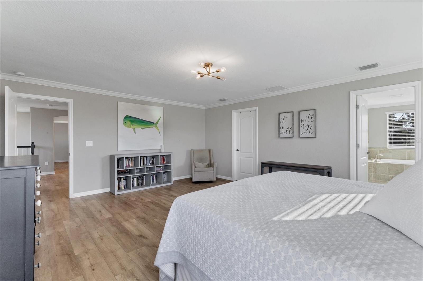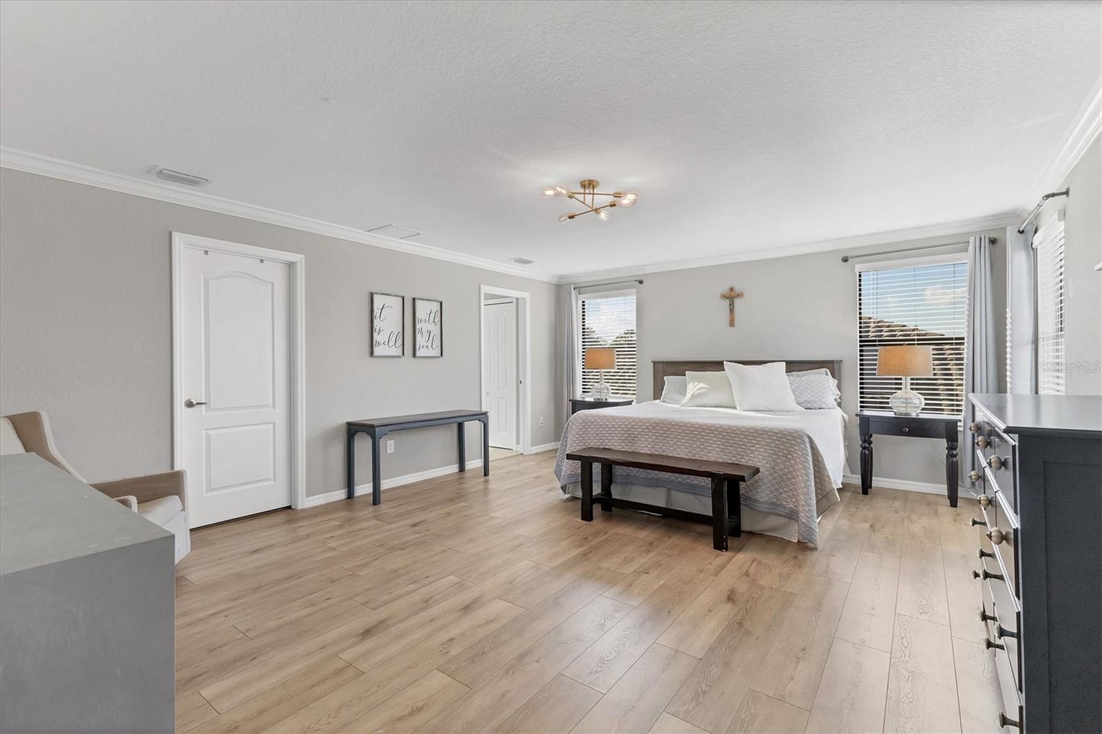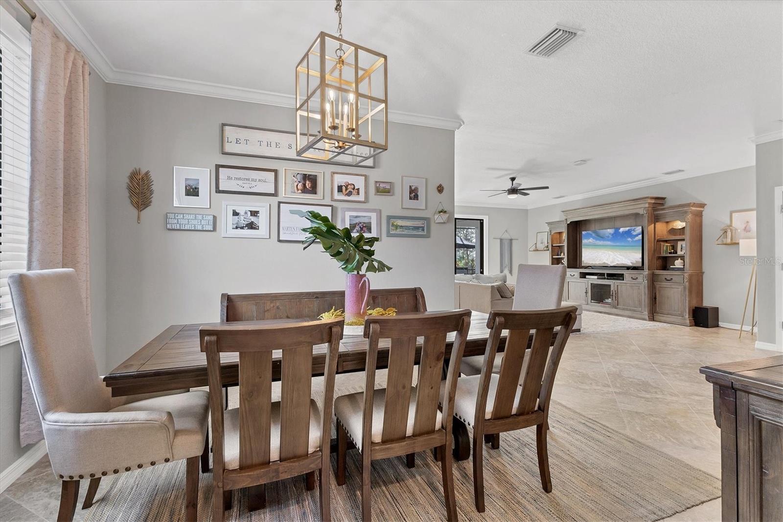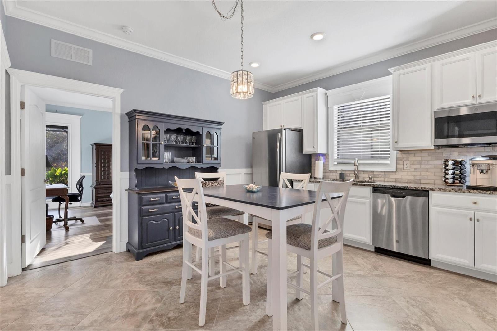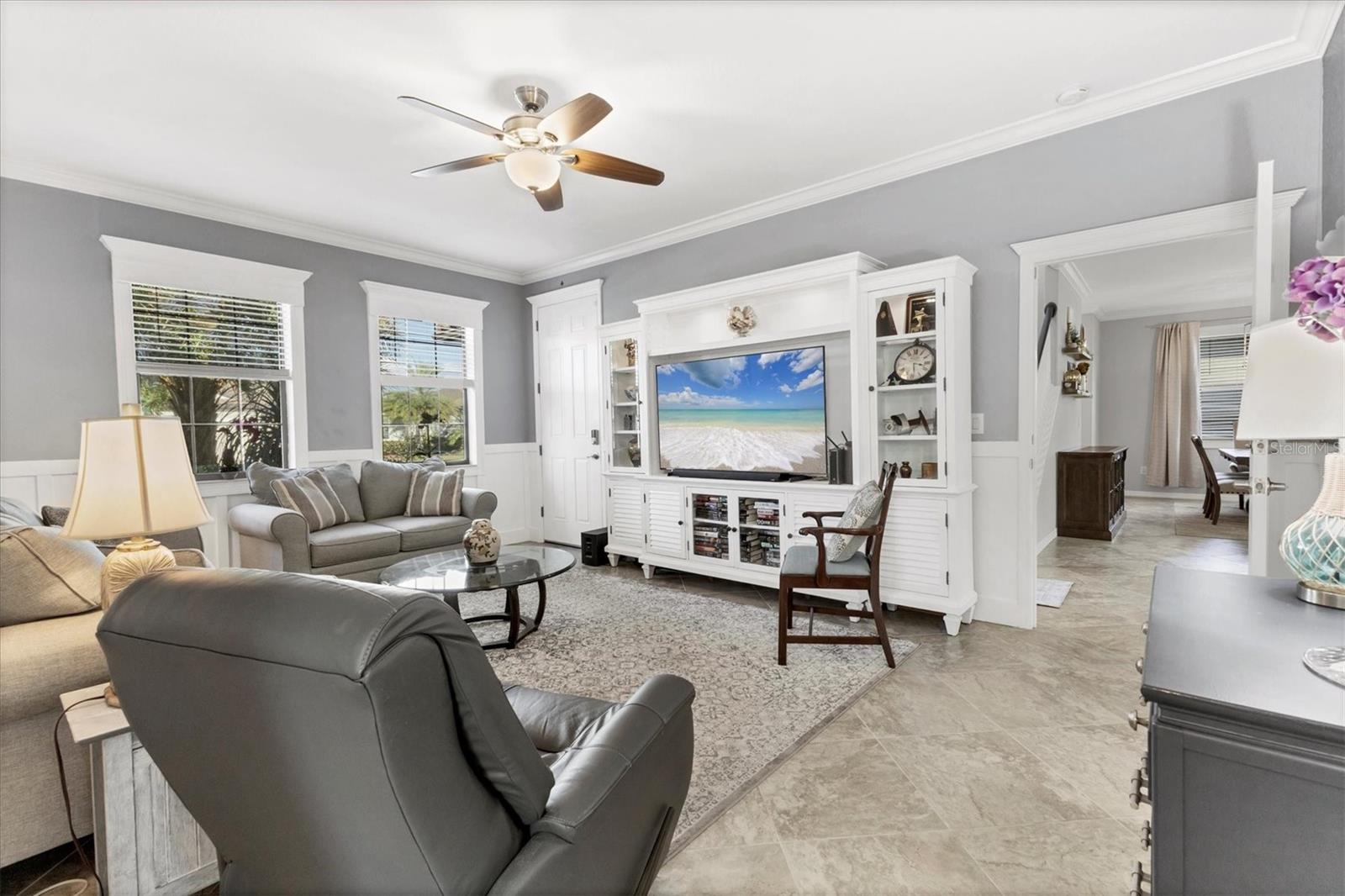 Ceiling Fans(s), Chair Rail, Crown Molding, Kitchen/Family Room Combo, PrimaryBedroom Upstairs, Stone Counters, Thermostat, Walk-In Closet(s), Window Treatments