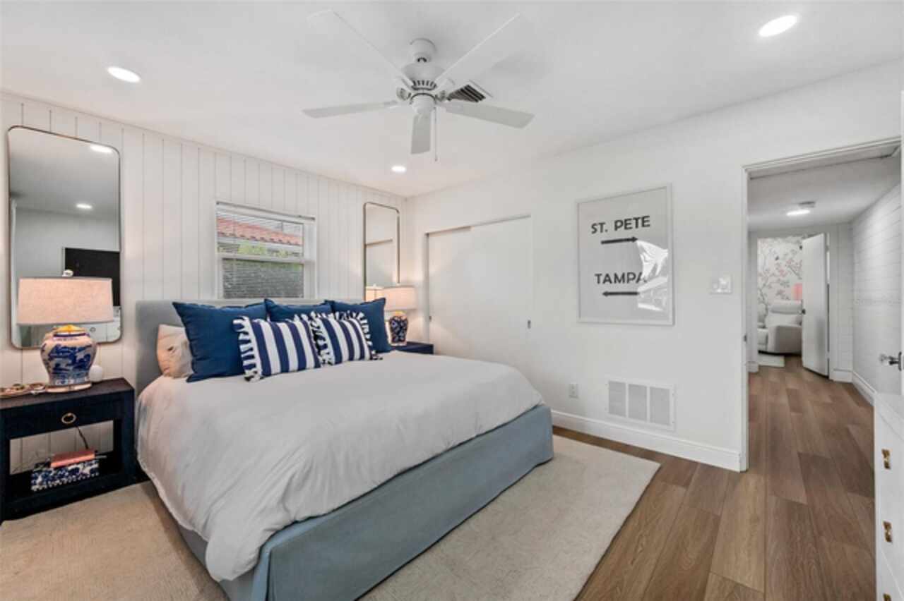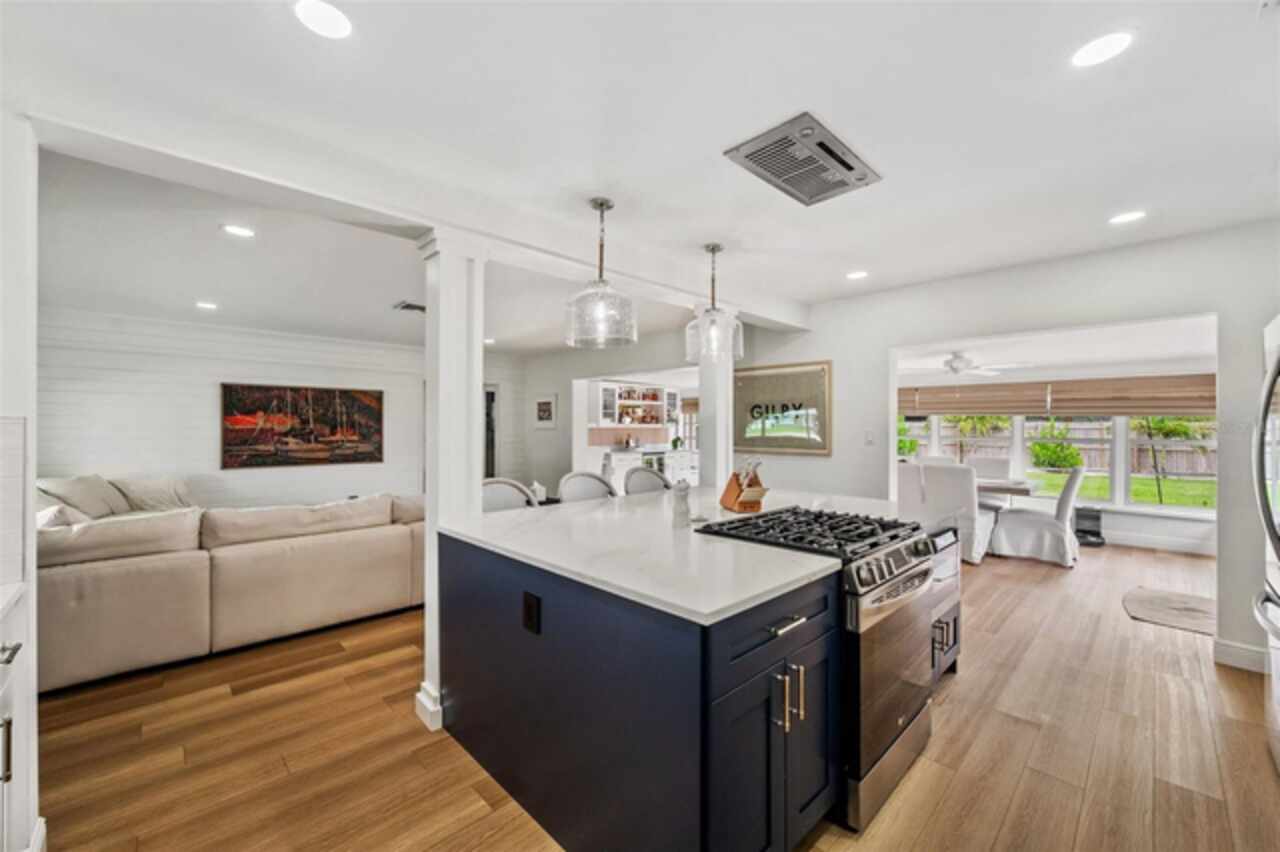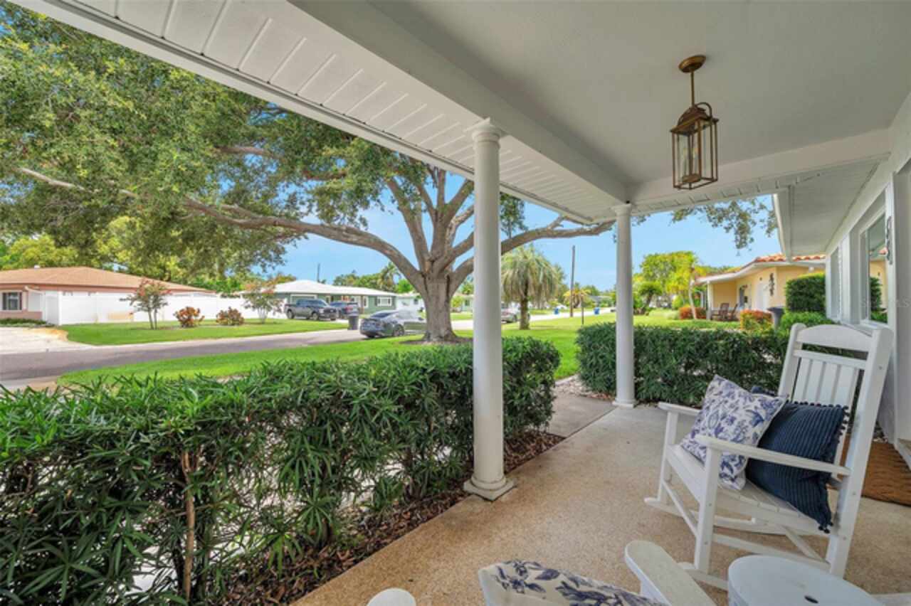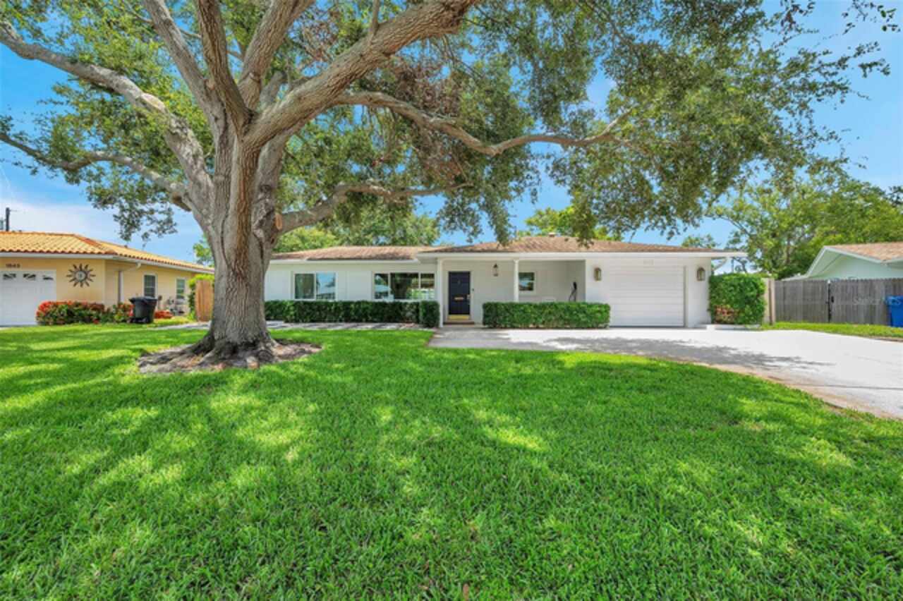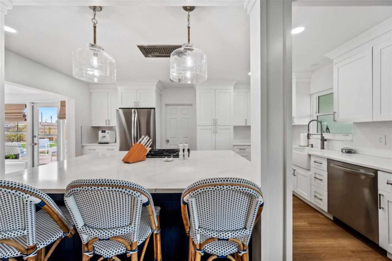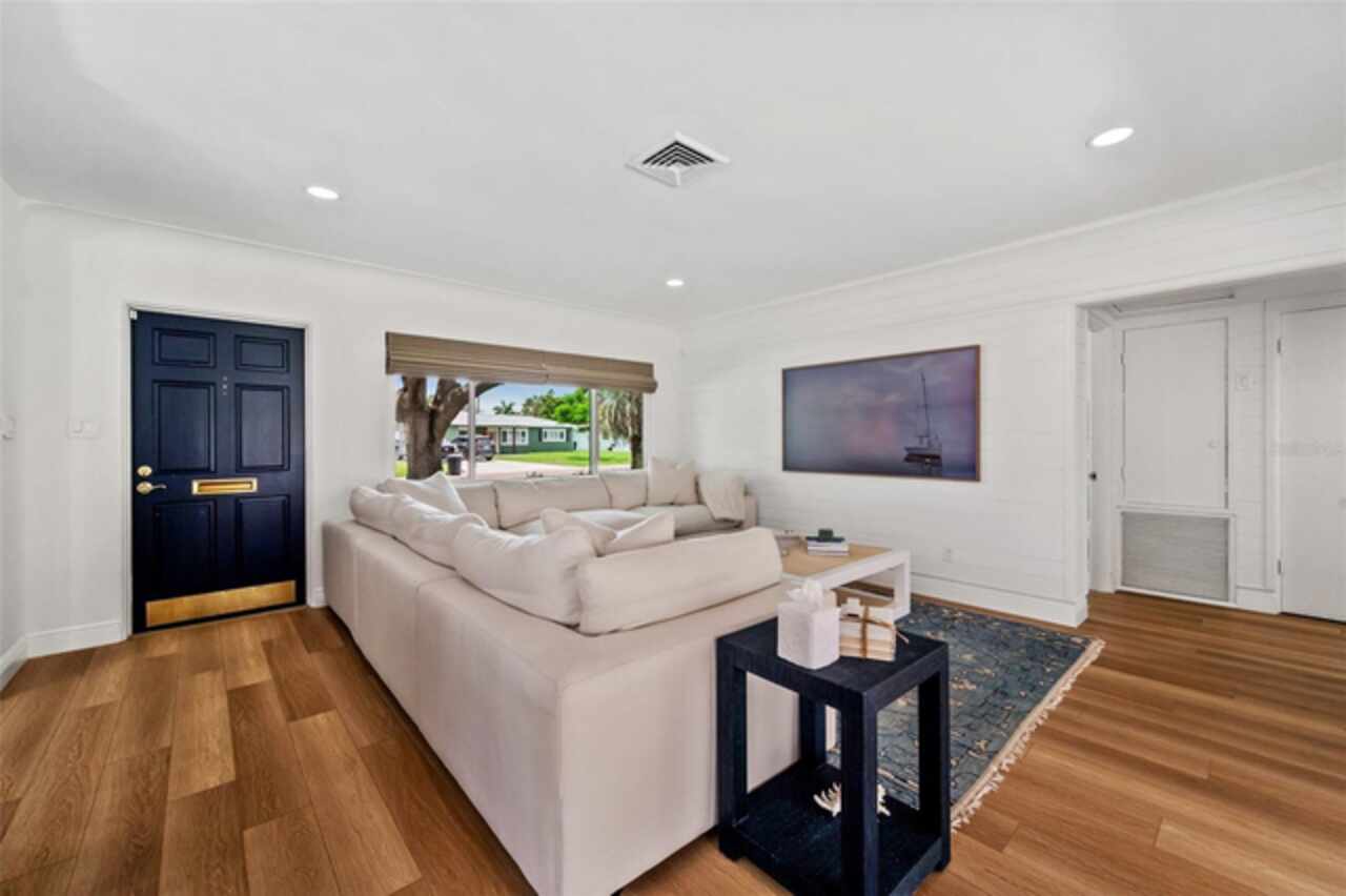 Welcome to this fully remodeled 2-bedroom, 2-bathroom block home with 1, 421 sq ft of living space, a 1-car garage, and timeless coastal charm. Situated high and dry on a quiet street with no flood zone concerns. A welcoming front porch and a large, beautiful shade tree add charm and curb appeal to the front yard. Step inside to an open-concept layout with soft coastal tones, recessed lighting, and luxury vinyl plank flooring throughout. The spacious living room features a shiplap accent wall, and the primary bedroom also includes a stylish shiplap feature for added character. The updated eat-in kitchen is a showstopper with a large center island, propane gas range, ceiling-mounted hood, apron-front farm sink, subway tile backsplash, granite countertops, shaker cabinetry, bar seating, and an undermount microwave. A sun-drenched bonus room at the rear offers formal dining or flex space, complete with a dry bar, wine cooler, and access to the expansive travertine tile patio and beautifully landscaped, fenced backyard with ample room for a pool. The main bathroom boasts a double vanity and large LED mirror. The garage includes the original second bathroom (not in heated sq ft), providing potential to convert into an owner’s suite. Additional highlights include impact-rated windows and doors, Tesla EV charger, and fresh interior/exterior paint. Just minutes to I-275, shopping, dining, beaches, and vibrant downtown St. Pete.