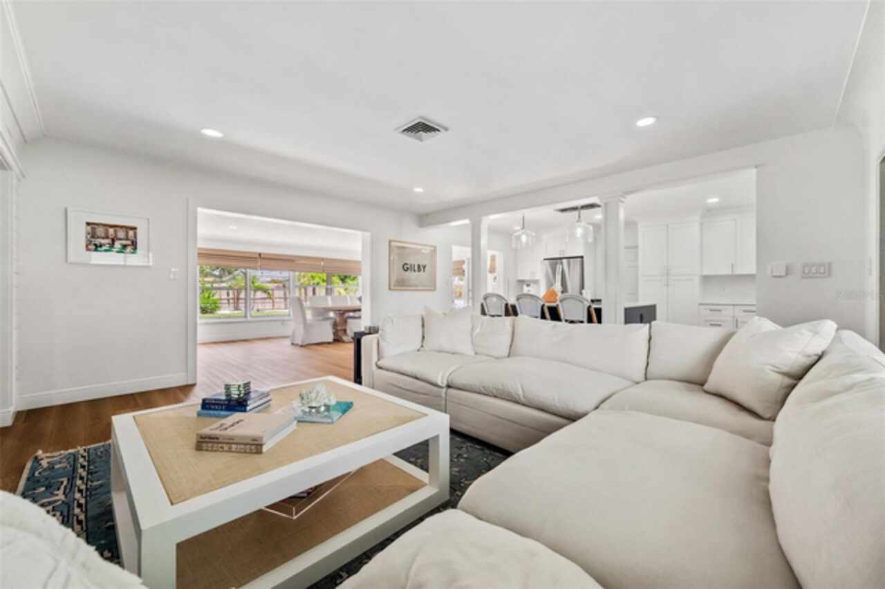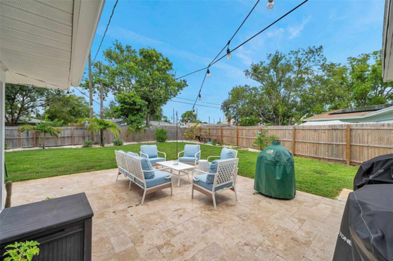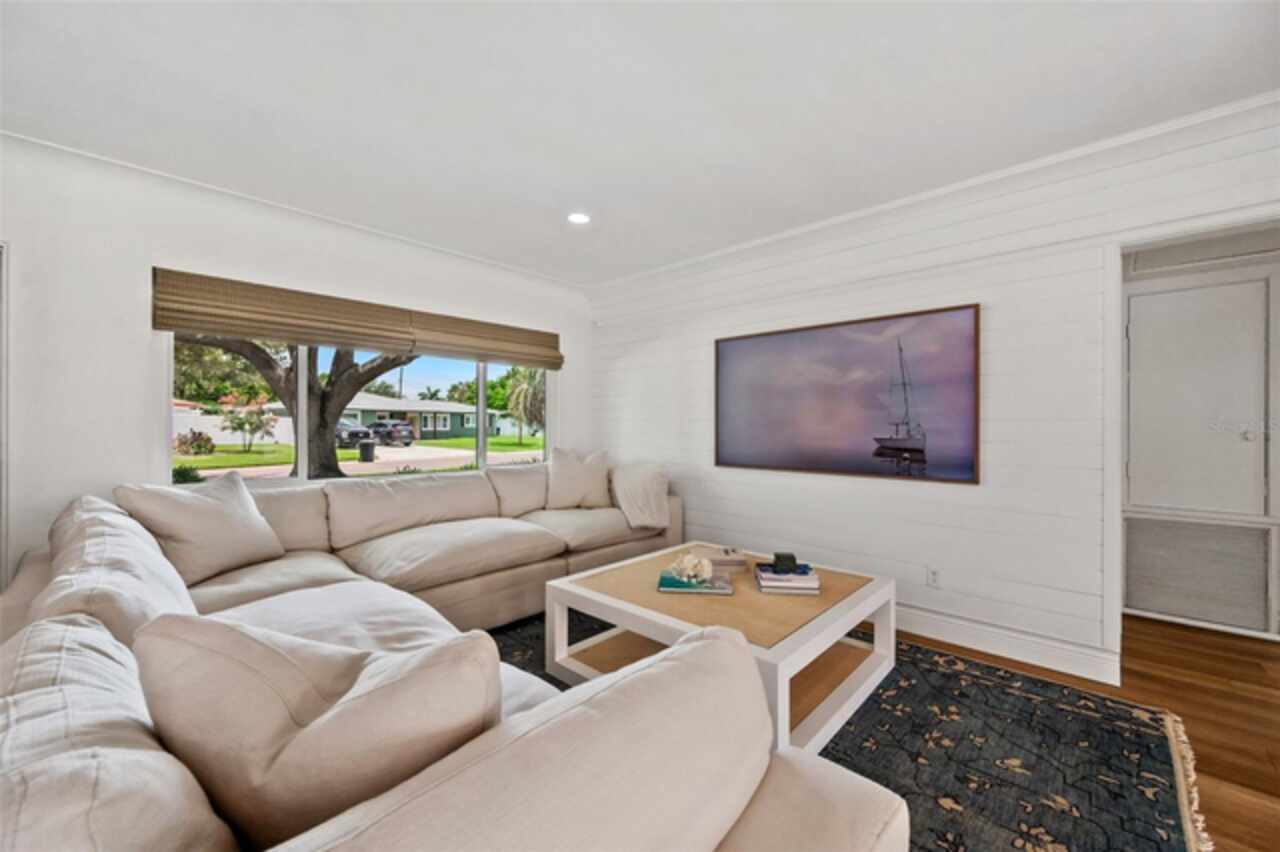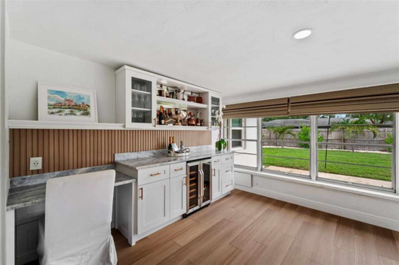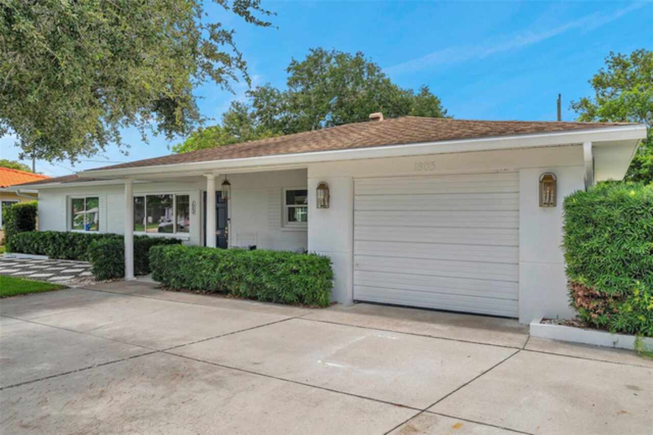 Welcome to this fully remodeled 2-bedroom, 2-bathroom block home with 1, 421 sq ft of living space, a 1-car garage, and timeless coastal charm. Situated high and dry on a quiet street with no flood zone concerns. A welcoming front porch and a large, beautiful shade tree add charm and curb appeal to the front yard. Step inside to an open-concept layout with soft coastal tones, recessed lighting, and luxury vinyl plank flooring throughout. The spacious living room features a shiplap accent wall, and the primary bedroom also includes a stylish shiplap feature for added character. The updated eat-in kitchen is a showstopper with a large center island, propane gas range, ceiling-mounted hood, apron-front farm sink, subway tile backsplash, granite countertops, shaker cabinetry, bar seating, and an undermount microwave. A sun-drenched bonus room at the rear offers formal dining or flex space, complete with a dry bar, wine cooler, and access to the expansive travertine tile patio and beautifully landscaped, fenced backyard with ample room for a pool. The main bathroom boasts a double vanity and large LED mirror. The garage includes the original second bathroom (not in heated sq ft), providing potential to convert into an owner’s suite. Additional highlights include impact-rated windows and doors, Tesla EV charger, and fresh interior/exterior paint. Just minutes to I-275, shopping, dining, beaches, and vibrant downtown St. Pete.