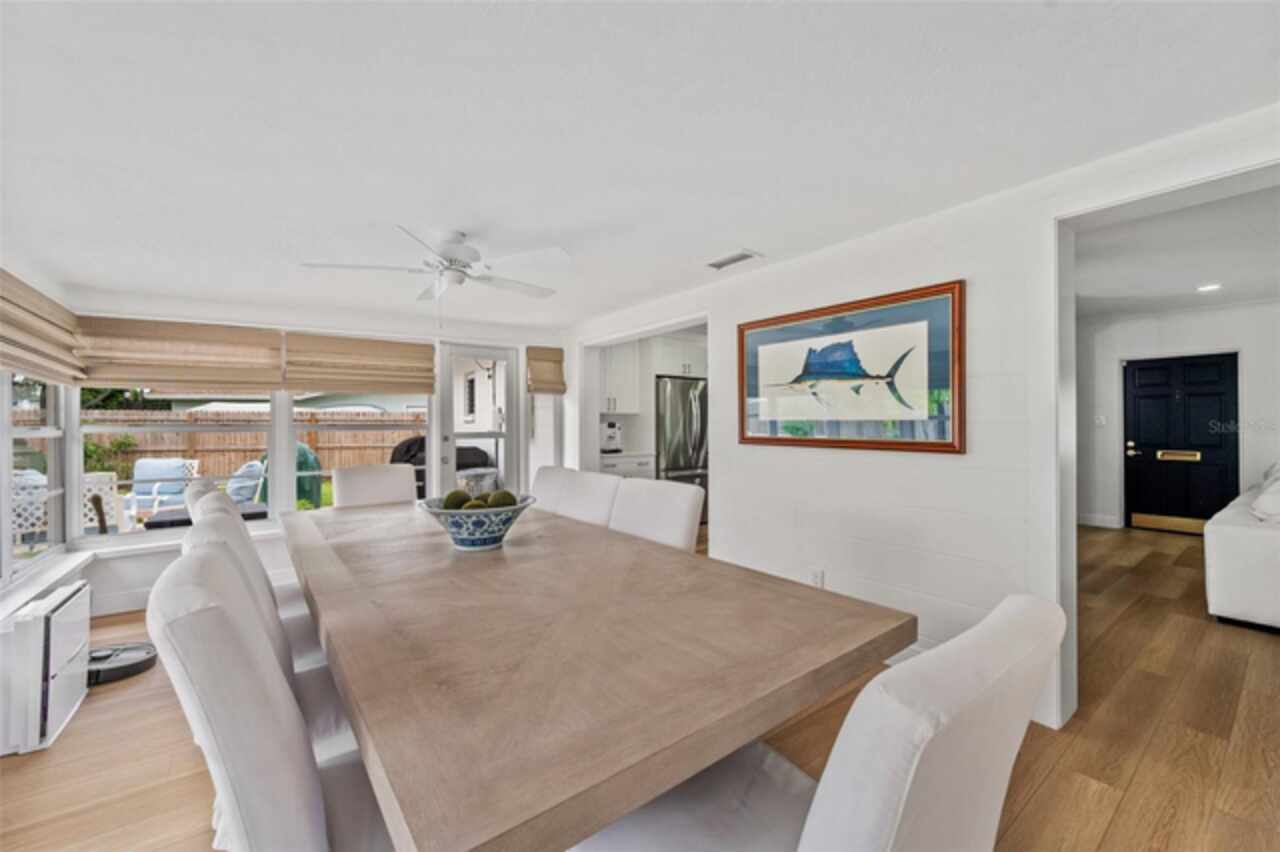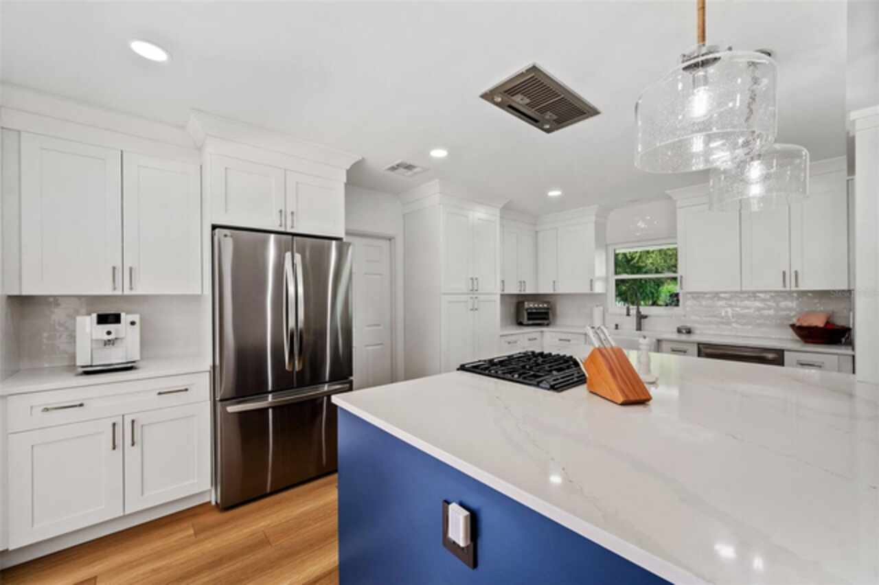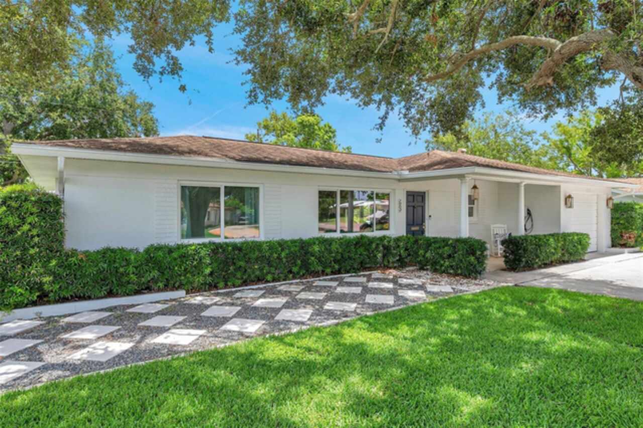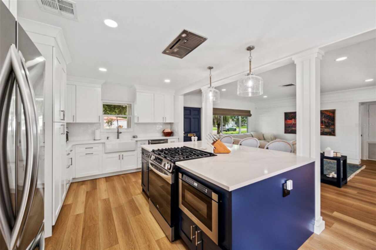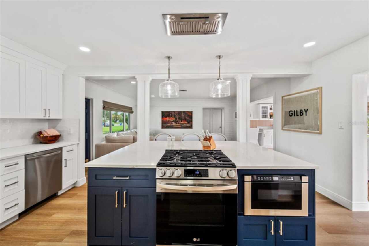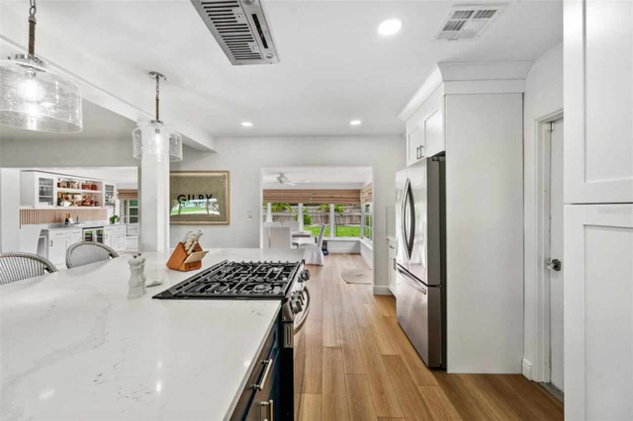 Welcome to this fully remodeled 2-bedroom, 2-bathroom block home with 1, 421 sq ft of living space, a 1-car garage, and timeless coastal charm. Situated high and dry on a quiet street with no flood zone concerns. A welcoming front porch and a large, beautiful shade tree add charm and curb appeal to the front yard. Step inside to an open-concept layout with soft coastal tones, recessed lighting, and luxury vinyl plank flooring throughout. The spacious living room features a shiplap accent wall, and the primary bedroom also includes a stylish shiplap feature for added character. The updated eat-in kitchen is a showstopper with a large center island, propane gas range, ceiling-mounted hood, apron-front farm sink, subway tile backsplash, granite countertops, shaker cabinetry, bar seating, and an undermount microwave. A sun-drenched bonus room at the rear offers formal dining or flex space, complete with a dry bar, wine cooler, and access to the expansive travertine tile patio and beautifully landscaped, fenced backyard with ample room for a pool. The main bathroom boasts a double vanity and large LED mirror. The garage includes the original second bathroom (not in heated sq ft), providing potential to convert into an owner’s suite. Additional highlights include impact-rated windows and doors, Tesla EV charger, and fresh interior/exterior paint. Just minutes to I-275, shopping, dining, beaches, and vibrant downtown St. Pete.