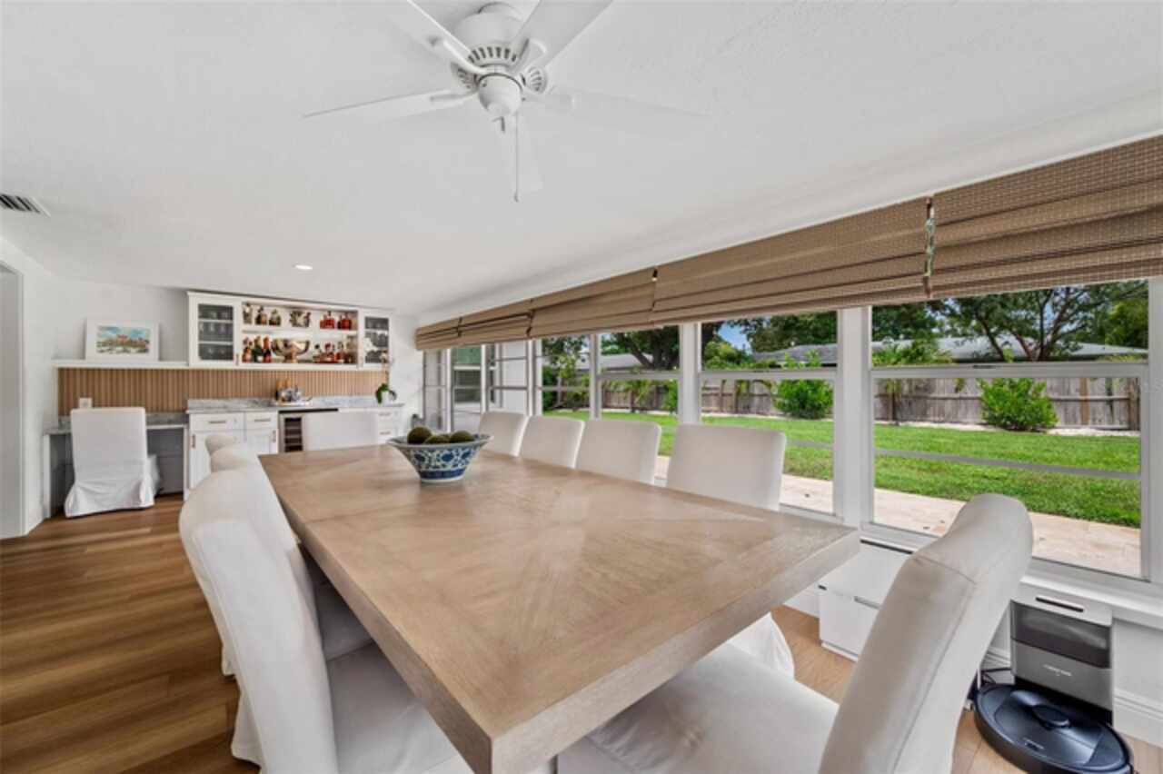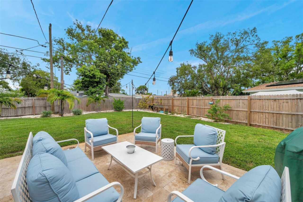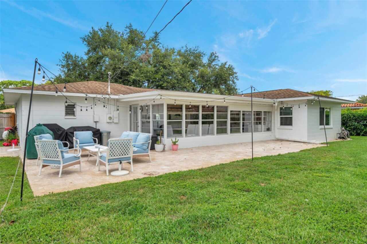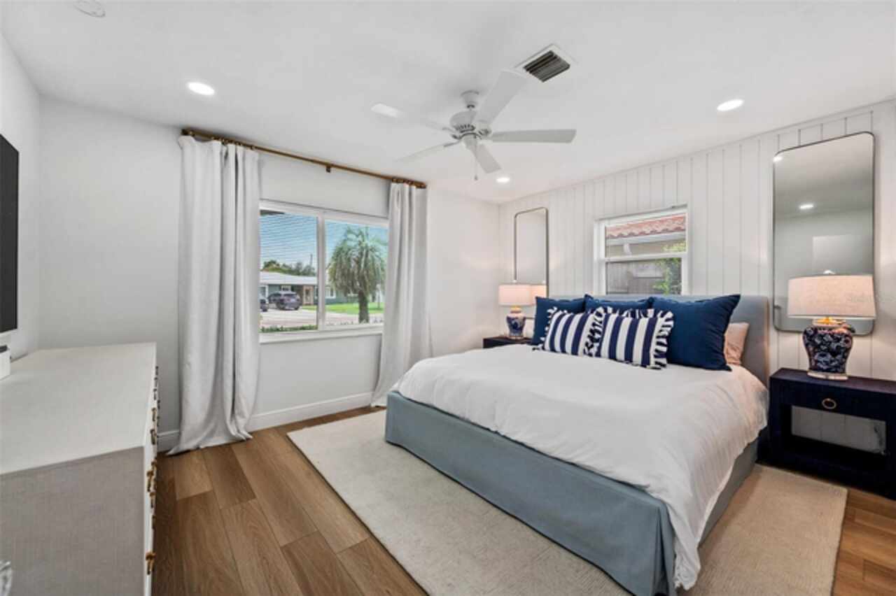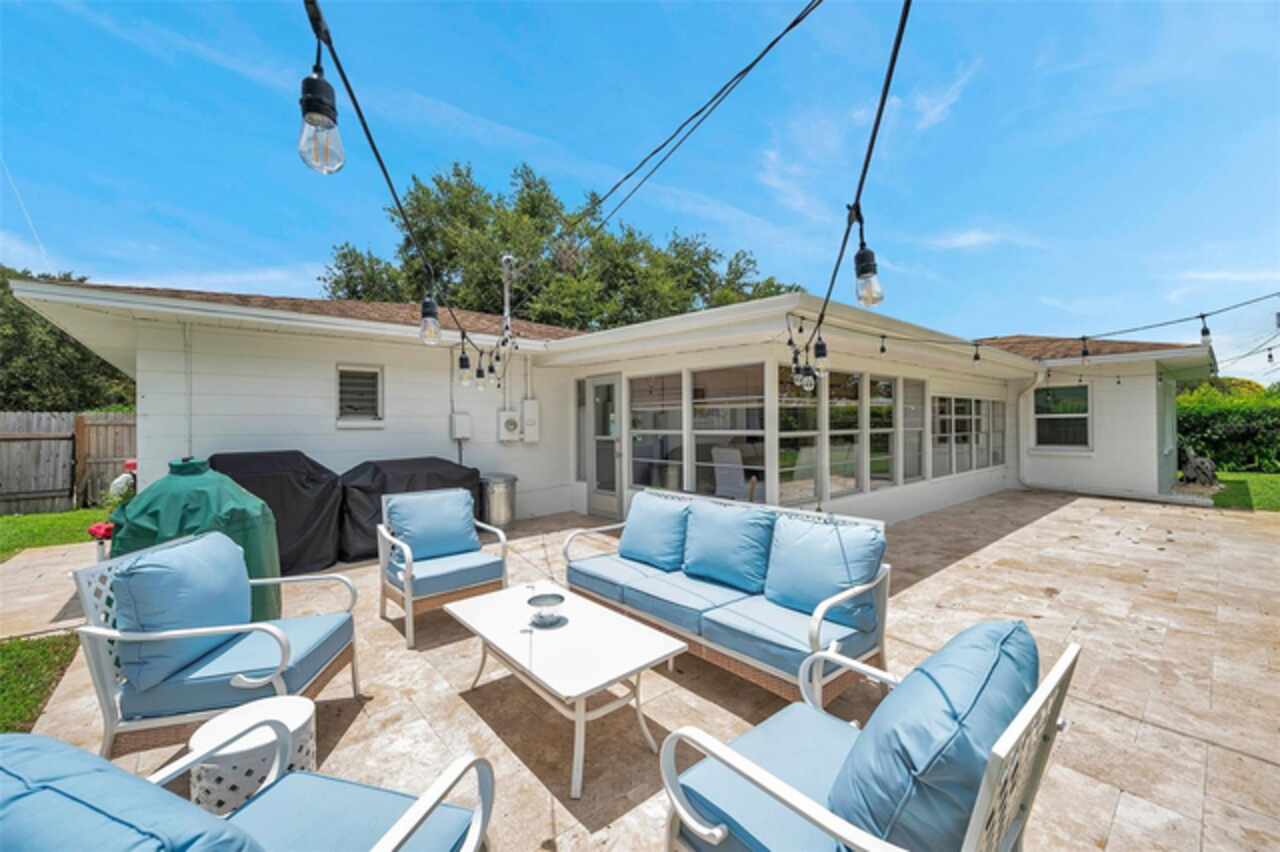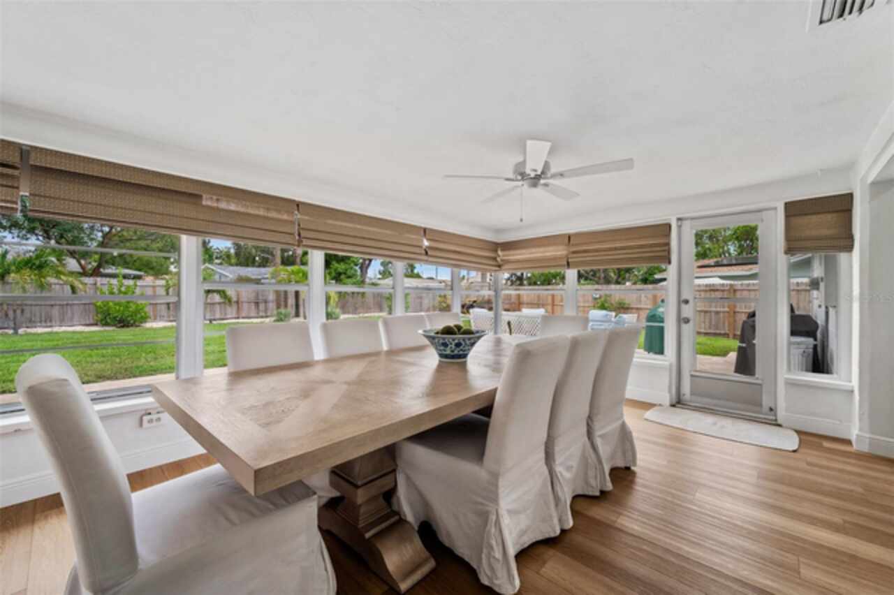 Welcome to this fully remodeled 2-bedroom, 2-bathroom block home with 1, 421 sq ft of living space, a 1-car garage, and timeless coastal charm. Situated high and dry on a quiet street with no flood zone concerns. A welcoming front porch and a large, beautiful shade tree add charm and curb appeal to the front yard. Step inside to an open-concept layout with soft coastal tones, recessed lighting, and luxury vinyl plank flooring throughout. The spacious living room features a shiplap accent wall, and the primary bedroom also includes a stylish shiplap feature for added character. The updated eat-in kitchen is a showstopper with a large center island, propane gas range, ceiling-mounted hood, apron-front farm sink, subway tile backsplash, granite countertops, shaker cabinetry, bar seating, and an undermount microwave. A sun-drenched bonus room at the rear offers formal dining or flex space, complete with a dry bar, wine cooler, and access to the expansive travertine tile patio and beautifully landscaped, fenced backyard with ample room for a pool. The main bathroom boasts a double vanity and large LED mirror. The garage includes the original second bathroom (not in heated sq ft), providing potential to convert into an owner’s suite. Additional highlights include impact-rated windows and doors, Tesla EV charger, and fresh interior/exterior paint. Just minutes to I-275, shopping, dining, beaches, and vibrant downtown St. Pete.