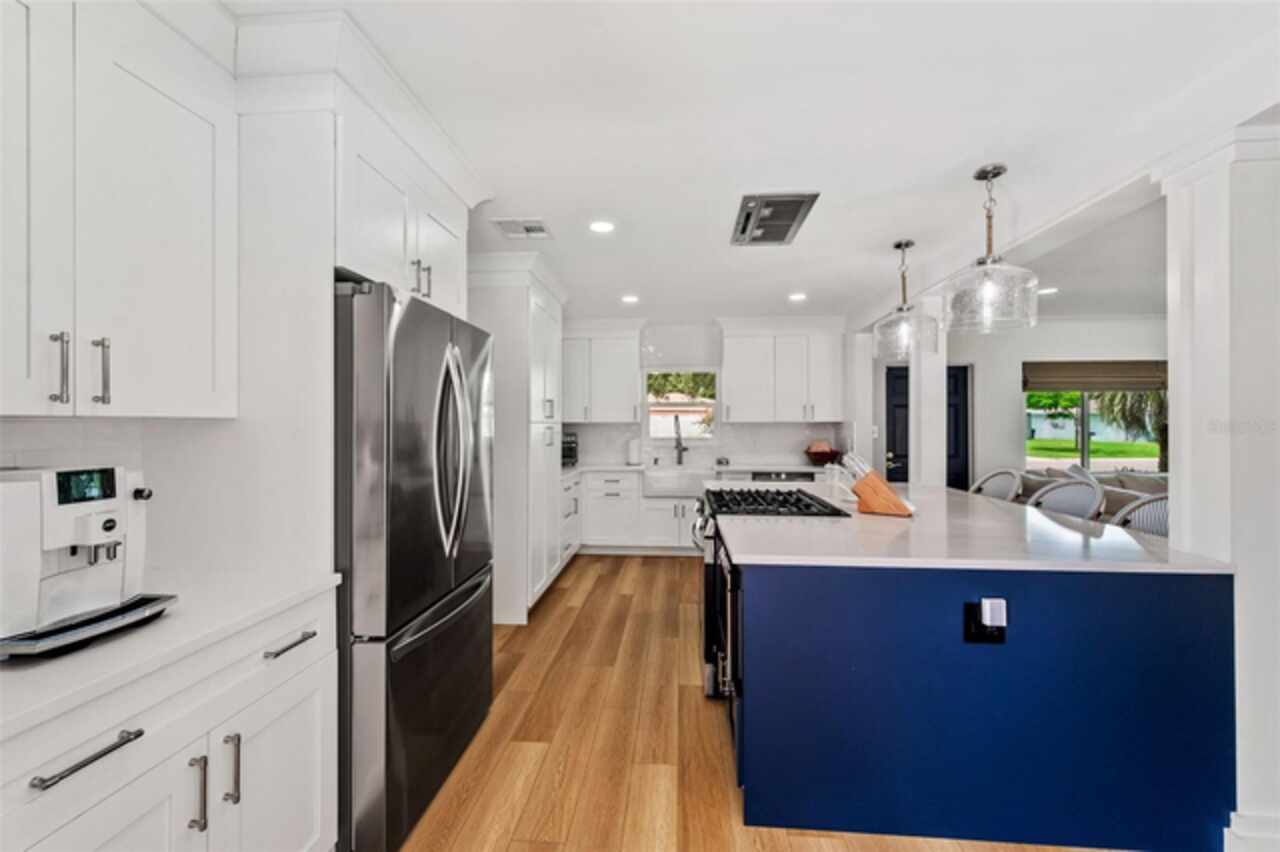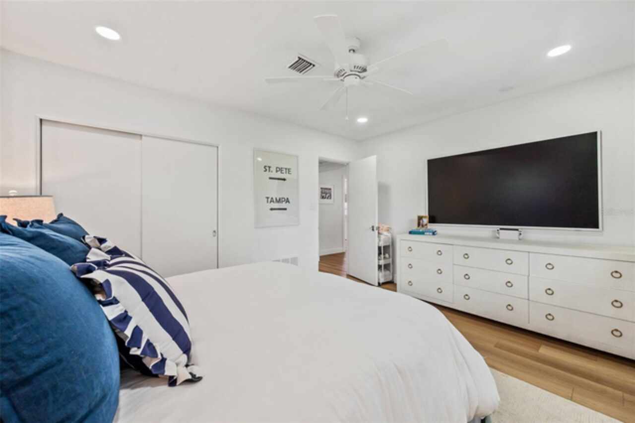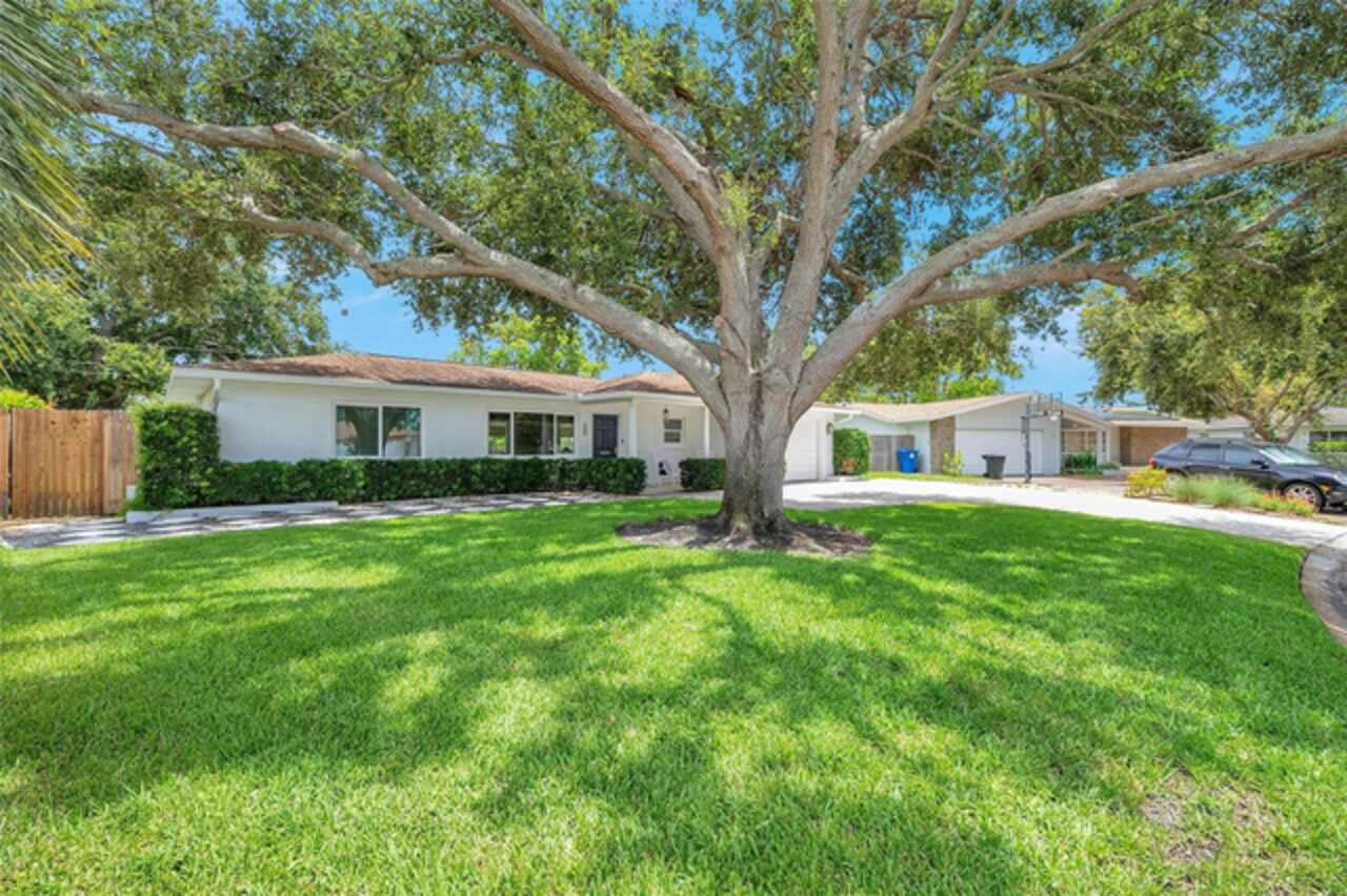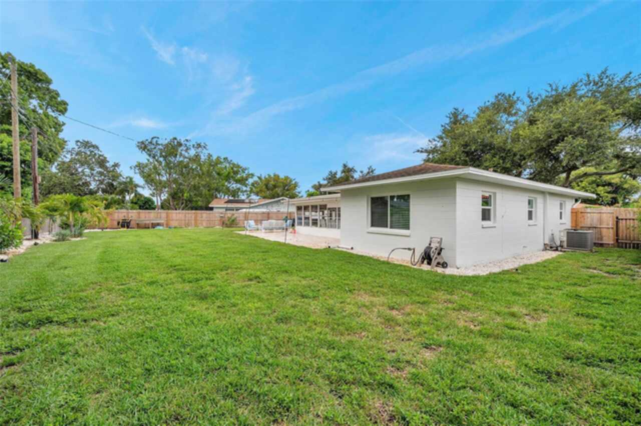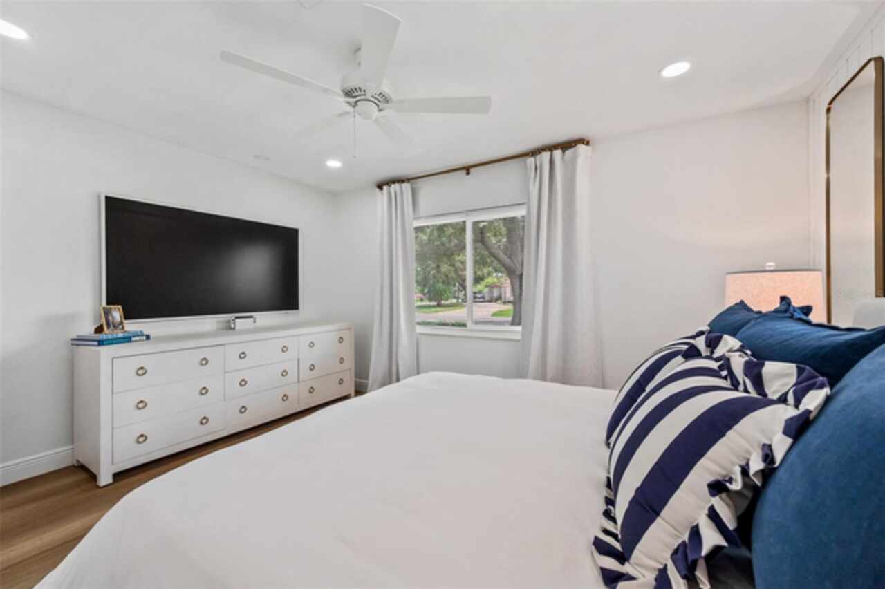 Welcome to this fully remodeled 2-bedroom, 2-bathroom block home with 1, 421 sq ft of living space, a 1-car garage, and timeless coastal charm. Situated high and dry on a quiet street with no flood zone concerns. A welcoming front porch and a large, beautiful shade tree add charm and curb appeal to the front yard. Step inside to an open-concept layout with soft coastal tones, recessed lighting, and luxury vinyl plank flooring throughout. The spacious living room features a shiplap accent wall, and the primary bedroom also includes a stylish shiplap feature for added character. The updated eat-in kitchen is a showstopper with a large center island, propane gas range, ceiling-mounted hood, apron-front farm sink, subway tile backsplash, granite countertops, shaker cabinetry, bar seating, and an undermount microwave. A sun-drenched bonus room at the rear offers formal dining or flex space, complete with a dry bar, wine cooler, and access to the expansive travertine tile patio and beautifully landscaped, fenced backyard with ample room for a pool. The main bathroom boasts a double vanity and large LED mirror. The garage includes the original second bathroom (not in heated sq ft), providing potential to convert into an owner’s suite. Additional highlights include impact-rated windows and doors, Tesla EV charger, and fresh interior/exterior paint. Just minutes to I-275, shopping, dining, beaches, and vibrant downtown St. Pete.